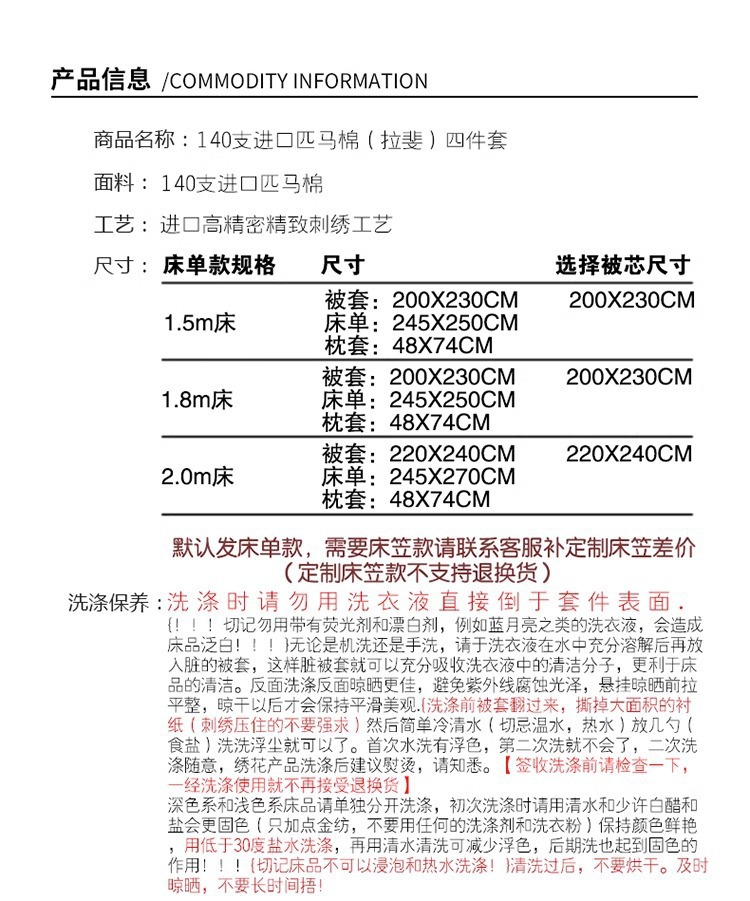• 2.0m 침대 4종 세트/220x240cm 이불심에 적합