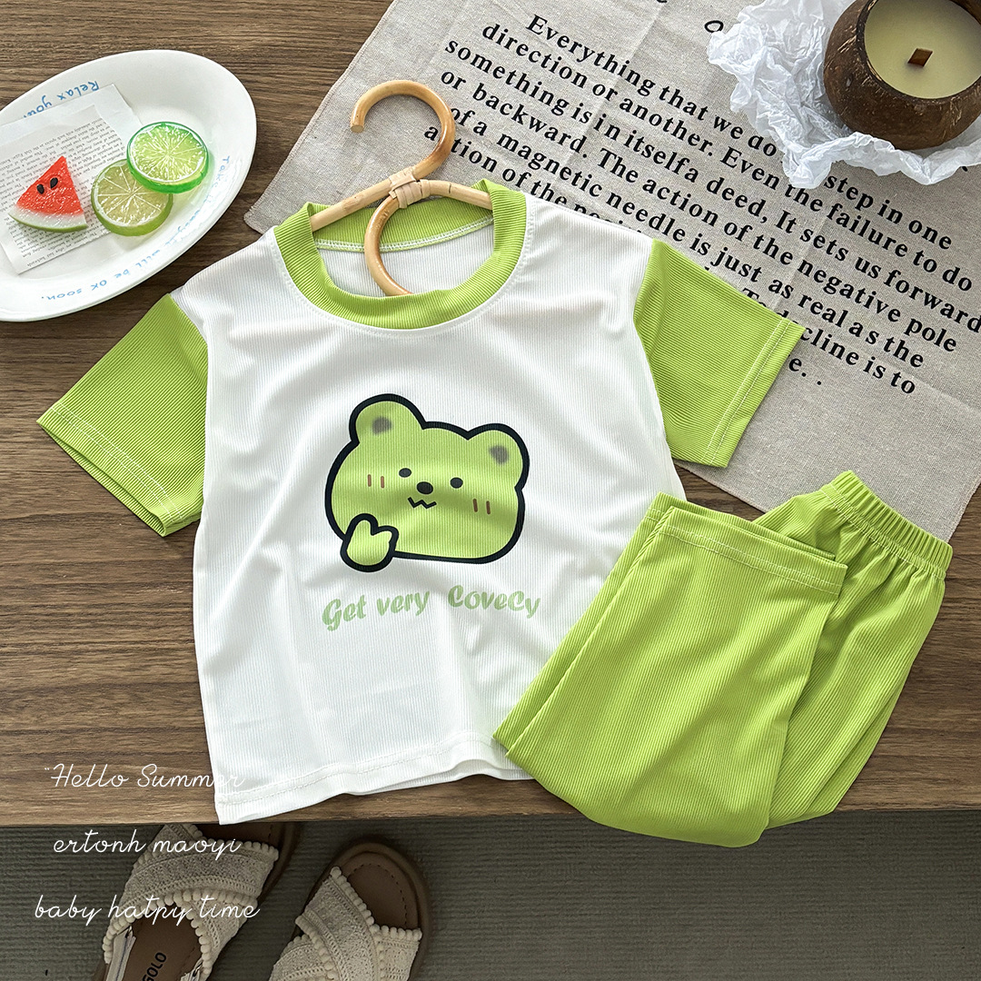 어린이 아이스 실크 반팔 세트 소년 홈 의류 소녀 여름 얇은 아기 잠옷 에어컨 의류 카프리 바지스토어 가기