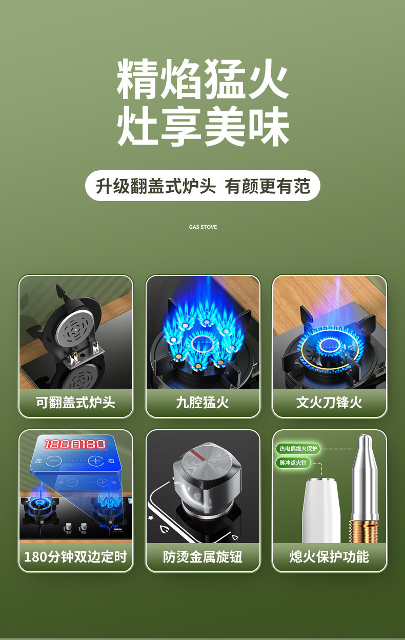 • 강화된 이중 9포 발사 + 지능형 타이밍 + 스테인레스 스틸 통합 스토브 프레임을 갖춘 플래그십 모델