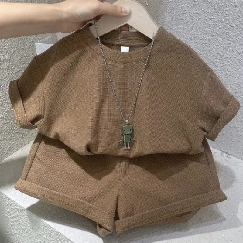 솔리드 컬러 간단한 아동복 2025 여름 새로운 스타일 아기 소년과 소녀 세트 서양식 얇은 유행