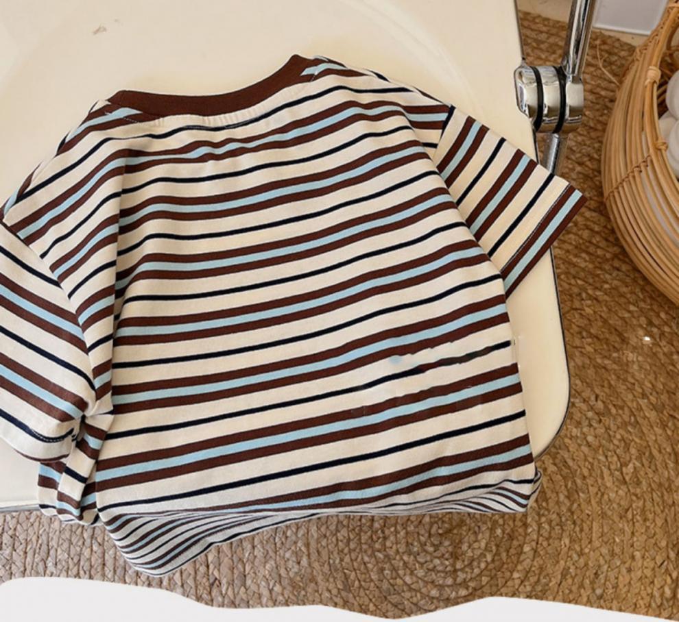 어린이 여름 복고풍 컬러 다크 브라운 스트라이프 반팔 티셔츠 소년 소녀면 둥근 목 반소매