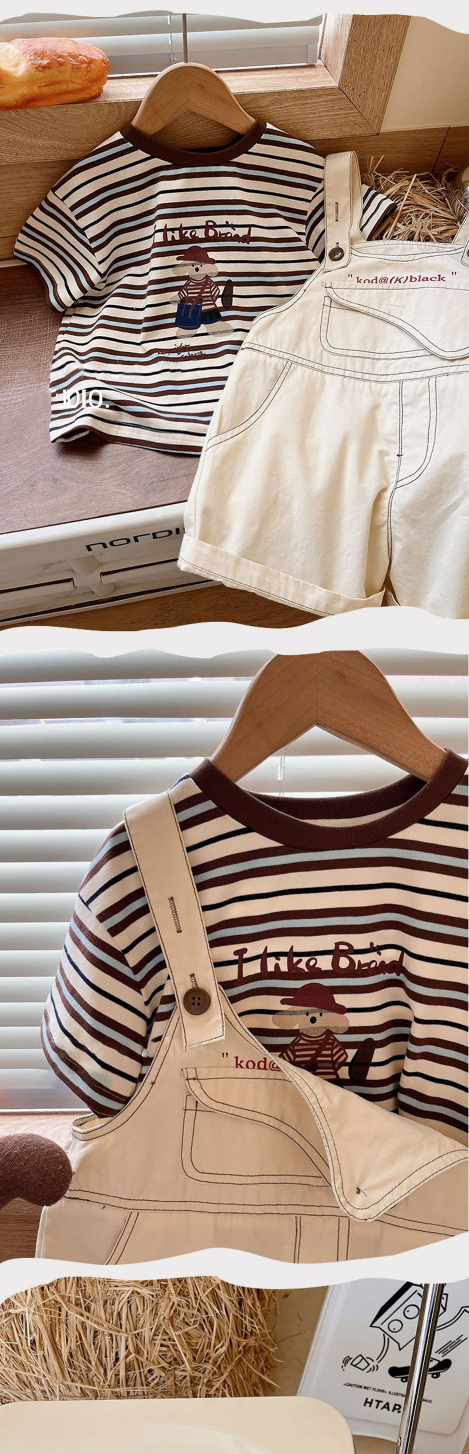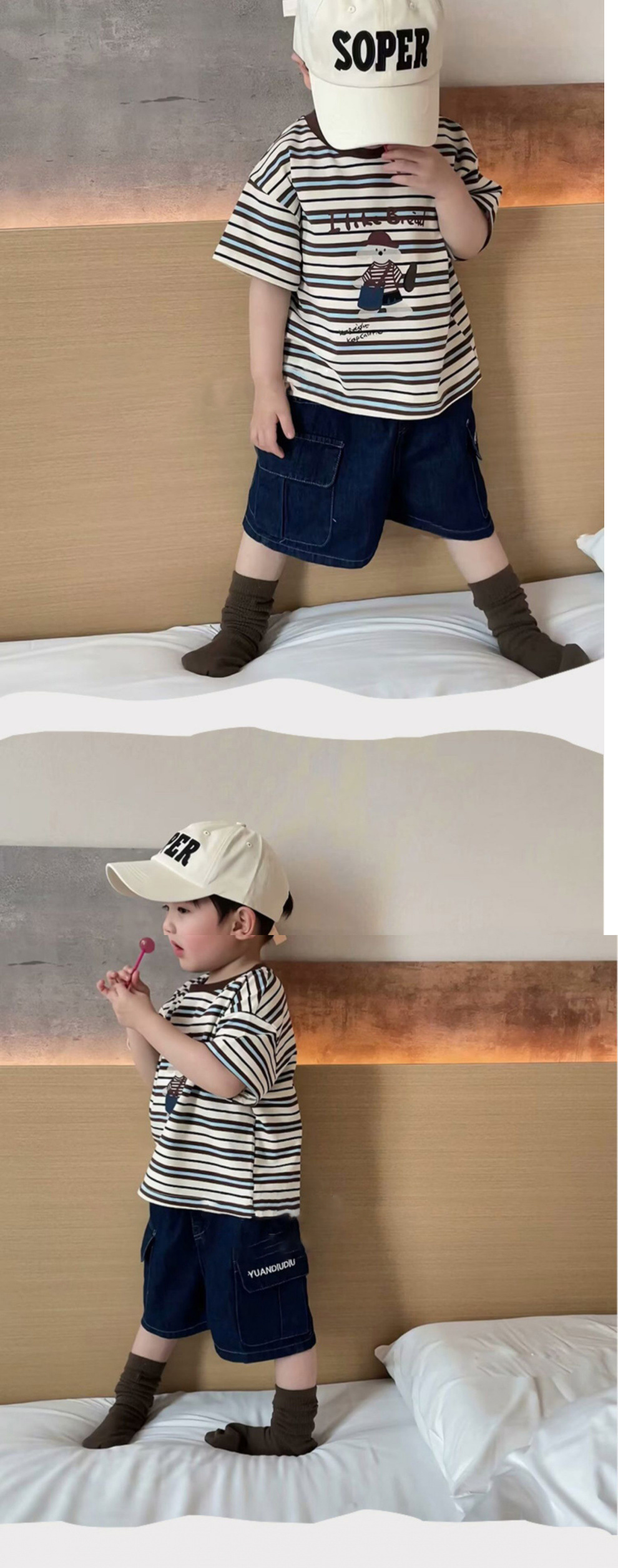 어린이 여름 복고풍 컬러 다크 브라운 스트라이프 반팔 티셔츠 소년 소녀면 둥근 목 반소매스토어 가기