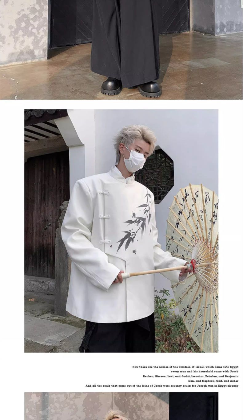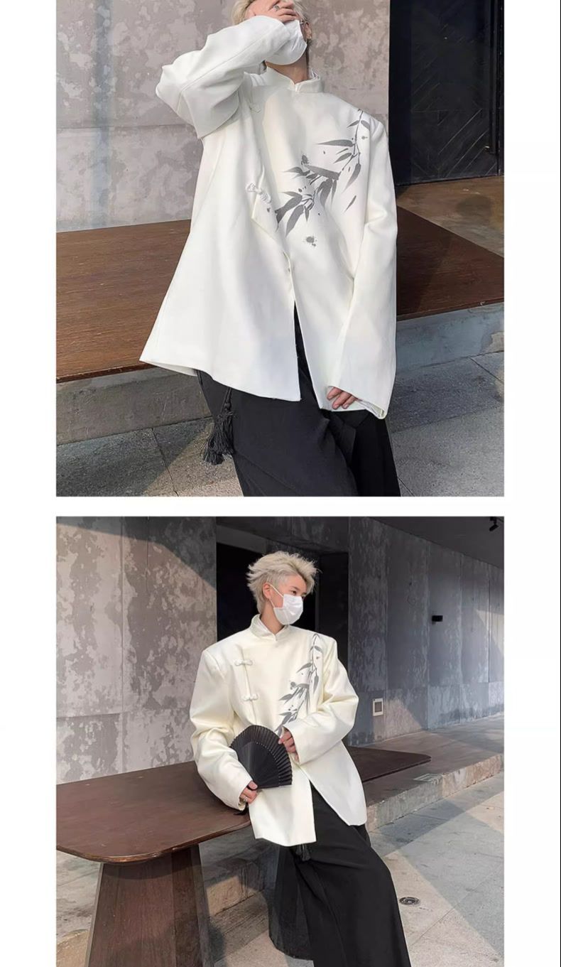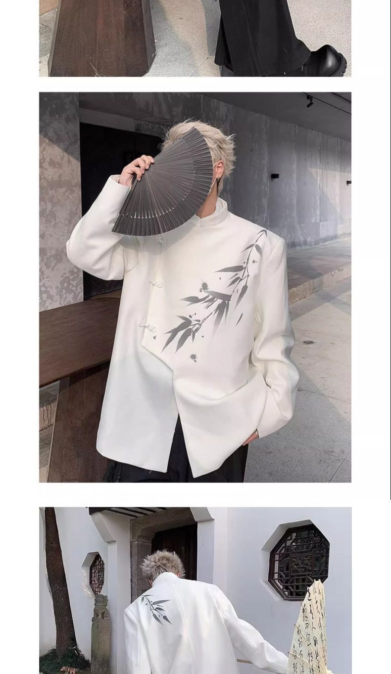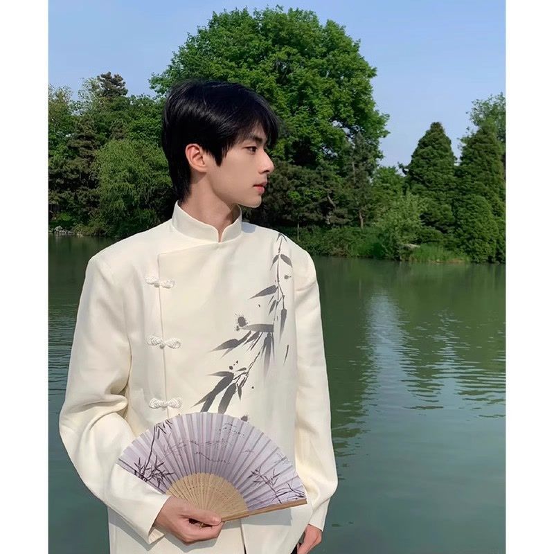대나무 잎 인쇄 어깨 패드 화이트 세트 재킷 남자의 하이 엔드 틈새 세트 새로운 중국 남자 중국 스타일 탑스토어 가기