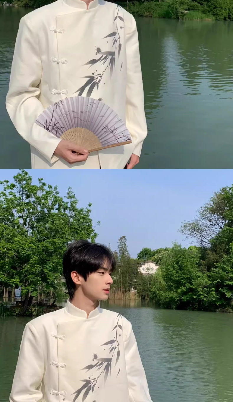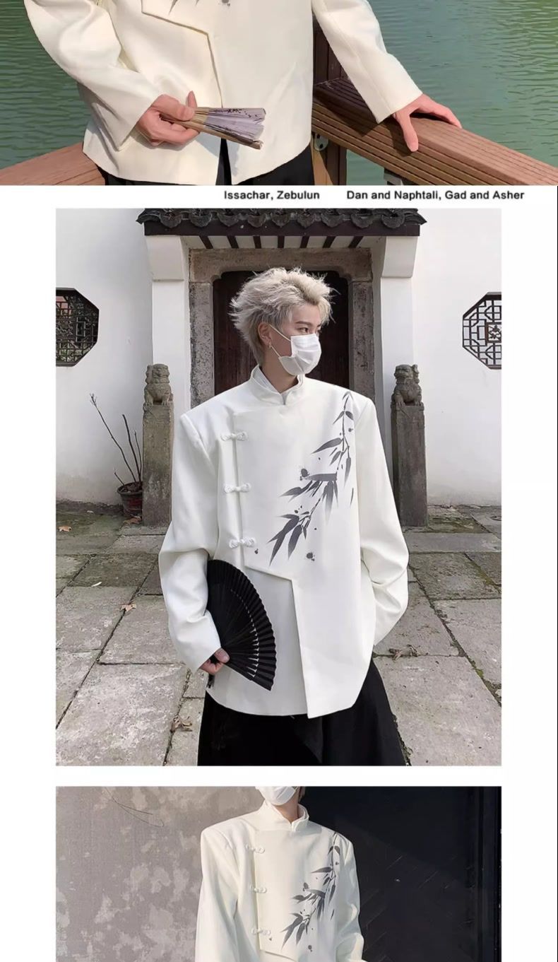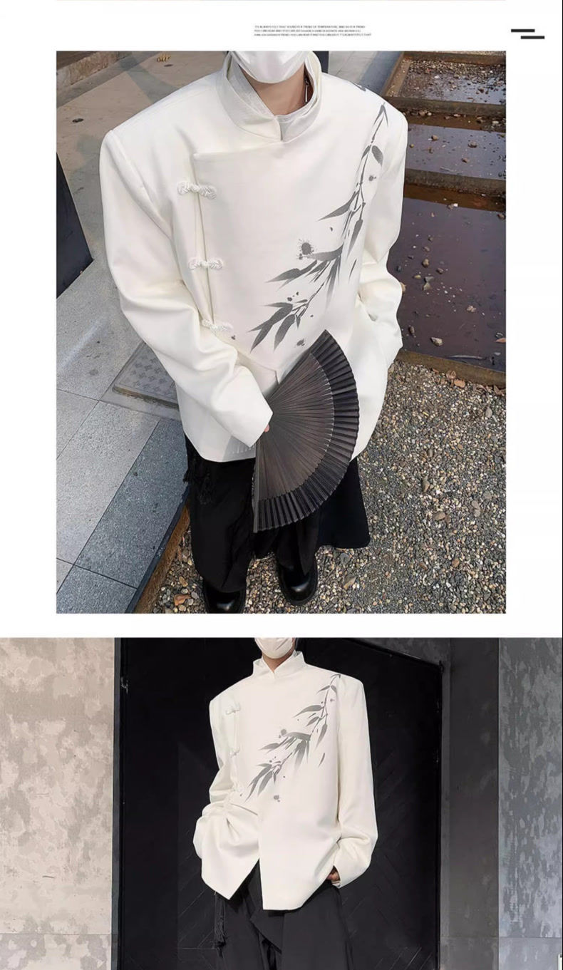 대나무 잎 인쇄 어깨 패드 화이트 세트 재킷 남자의 하이 엔드 틈새 세트 새로운 중국 남자 중국 스타일 탑스토어 가기