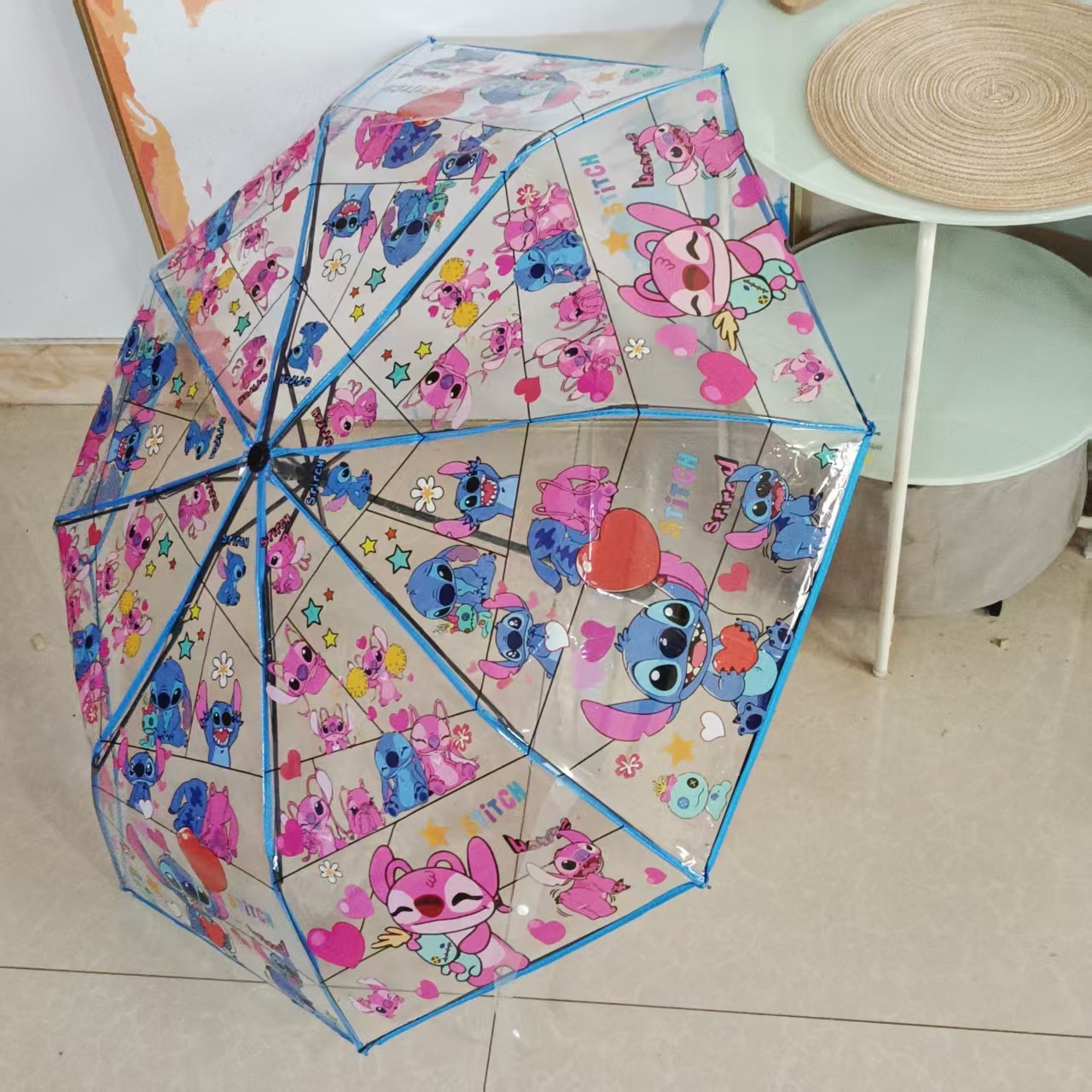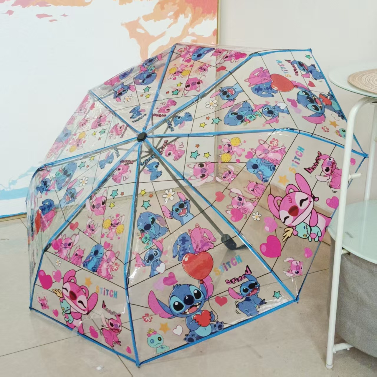 스티치 완전 자동 투명 우산 만화 애니메이션 인터넷 축하 접기 3 배 우산 학생 우산 남녀스토어 가기