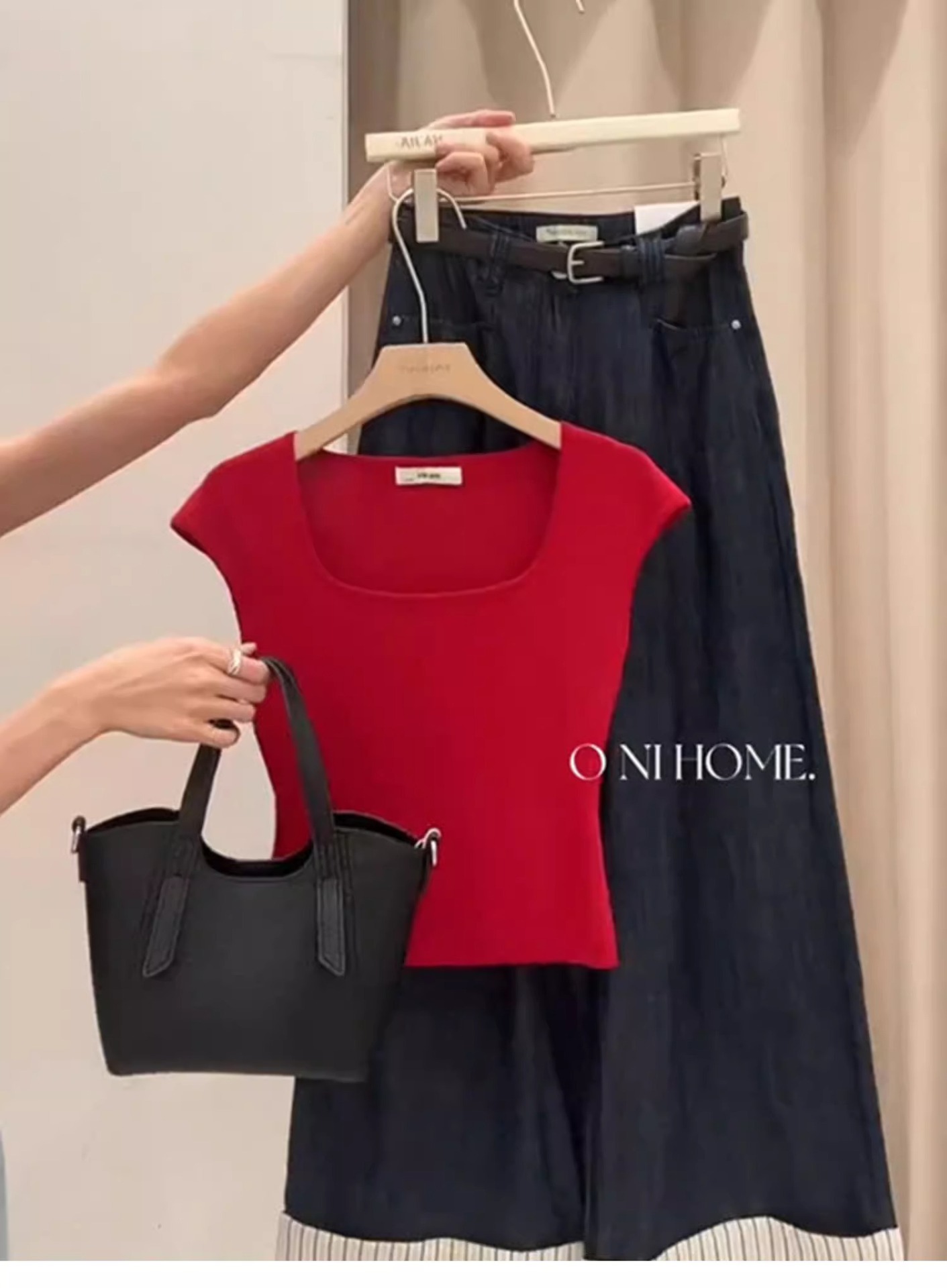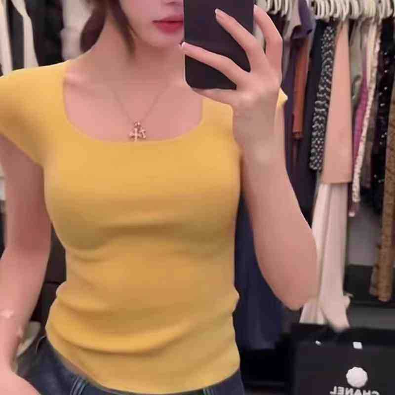 레드 빅 네일 쇼트 탑 작은 플라잉 슬리브 디자인 센스 니티 아이스 실크 숄더 짧은 소매 티셔츠 여성용 여름스토어 가기