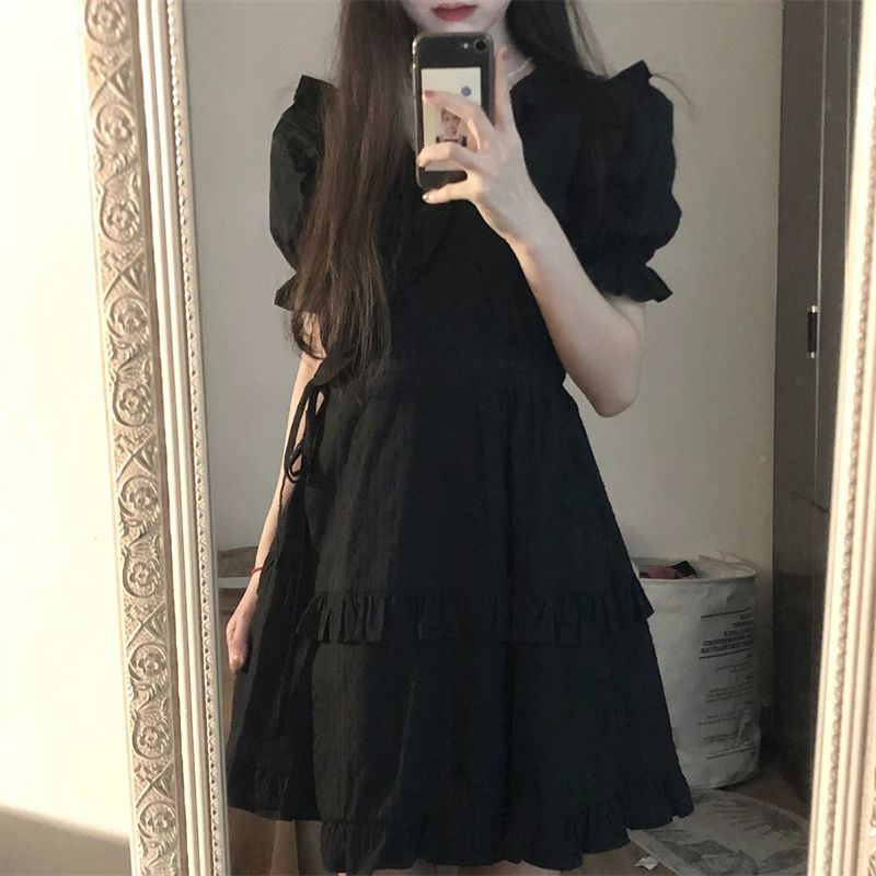한국 스타일 복고풍 귀 모양의 인형 목걸이를 가진 우아한 작은 검은 치마, 꽉 허리와 슬림 모양의 원피스 여성 학생 여름 캐릭터 치마스토어 가기