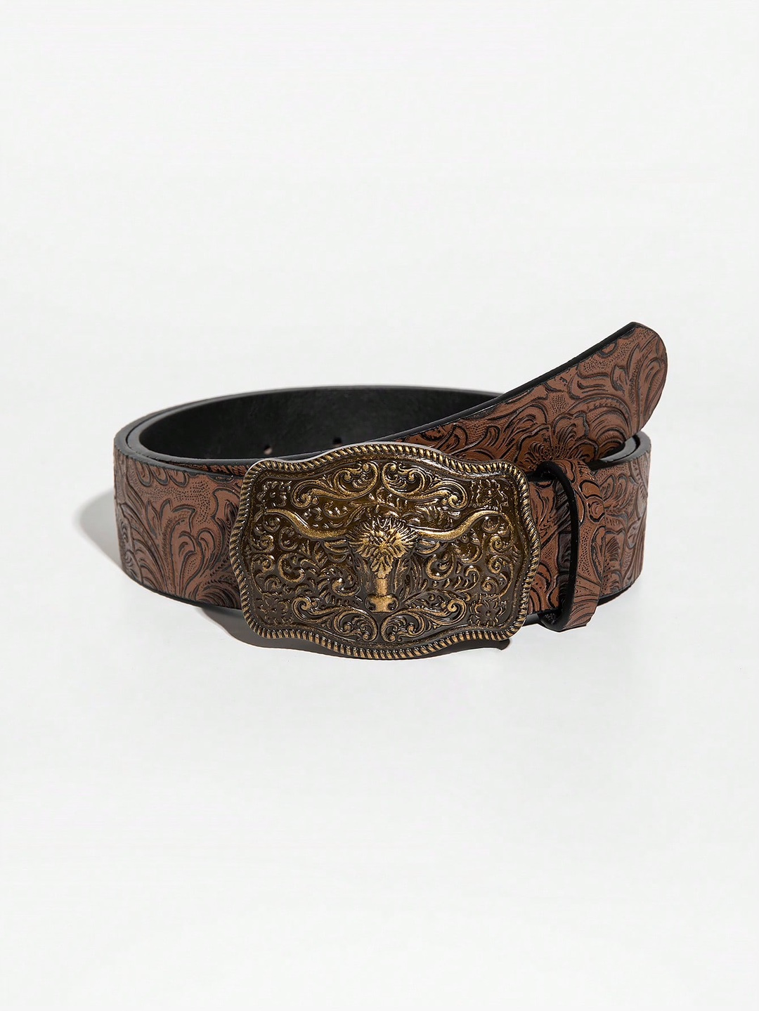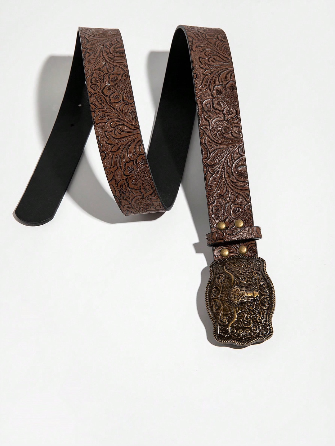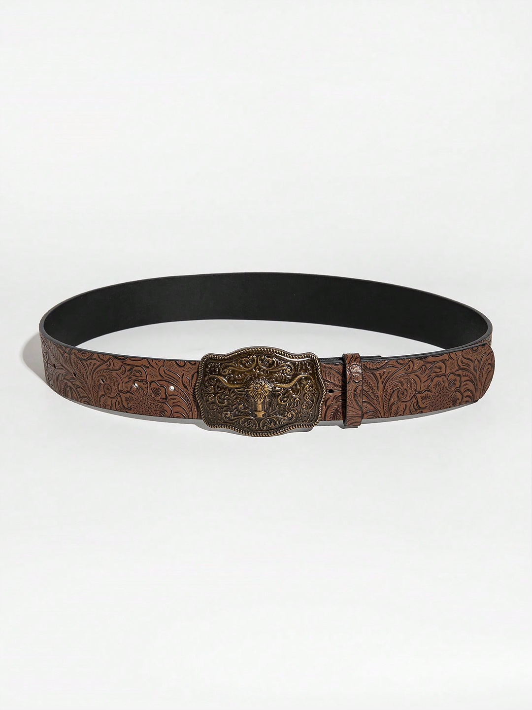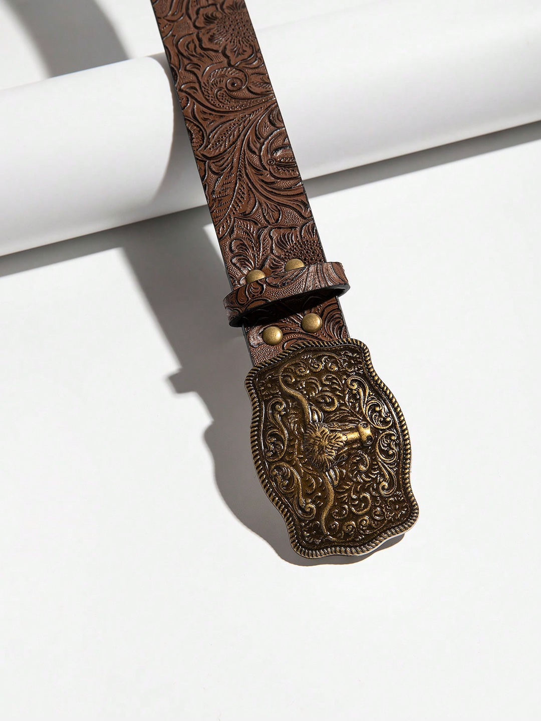 레트로 웨스턴 카우보이 스타일의 큰 버클이 달린 브라운 PU 프린트 장식 벨트, 패션 트렌드와 펑크 스타일에 잘 어울린다