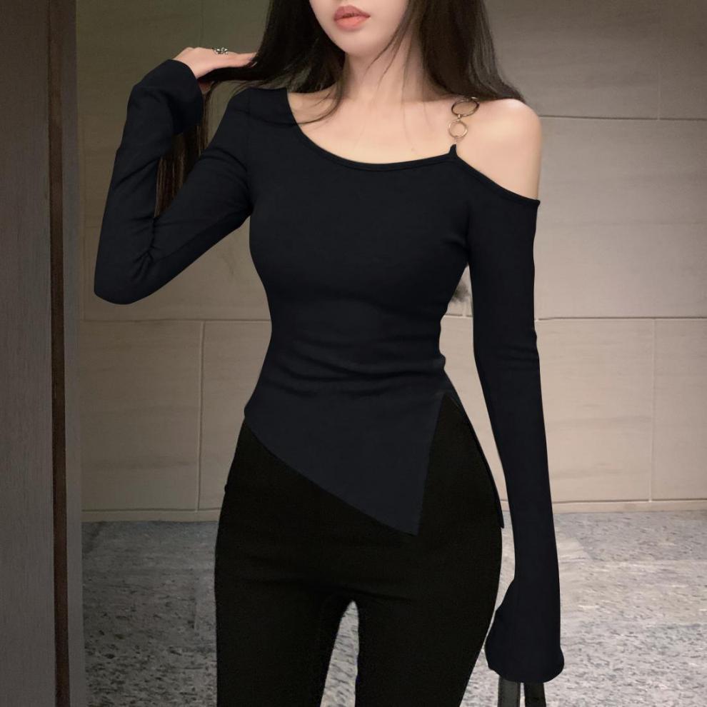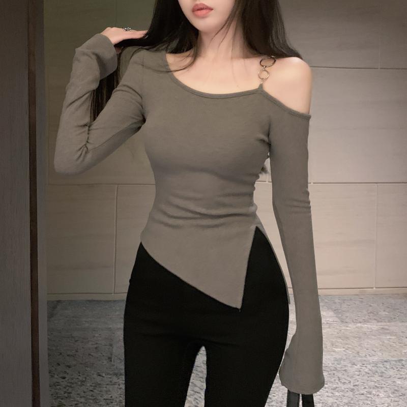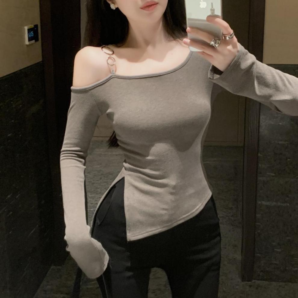 달콤한 스파이스 소녀 슬란 칼라 어깨 긴팔 티셔츠 여성용 겨울옷 순수한 욕망 그레이 내베이스 셔츠 불규칙한 쇼트 탑