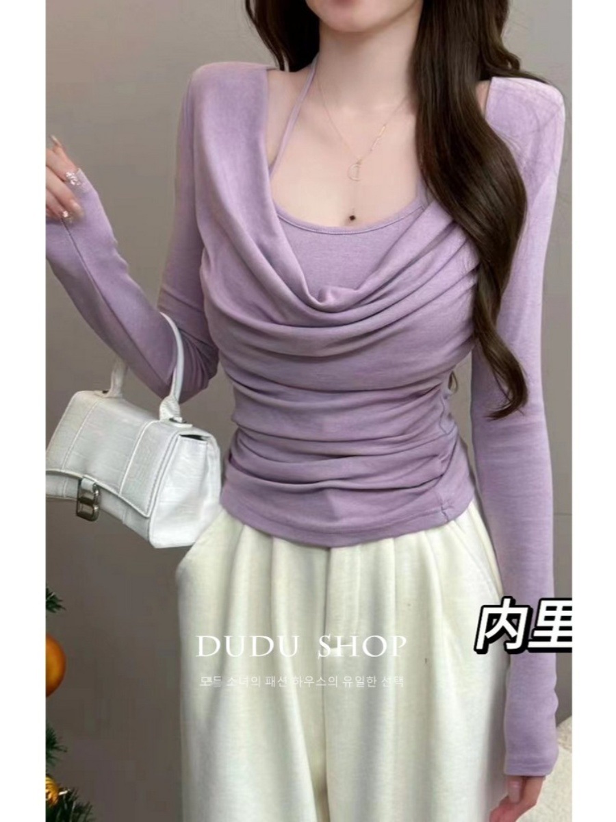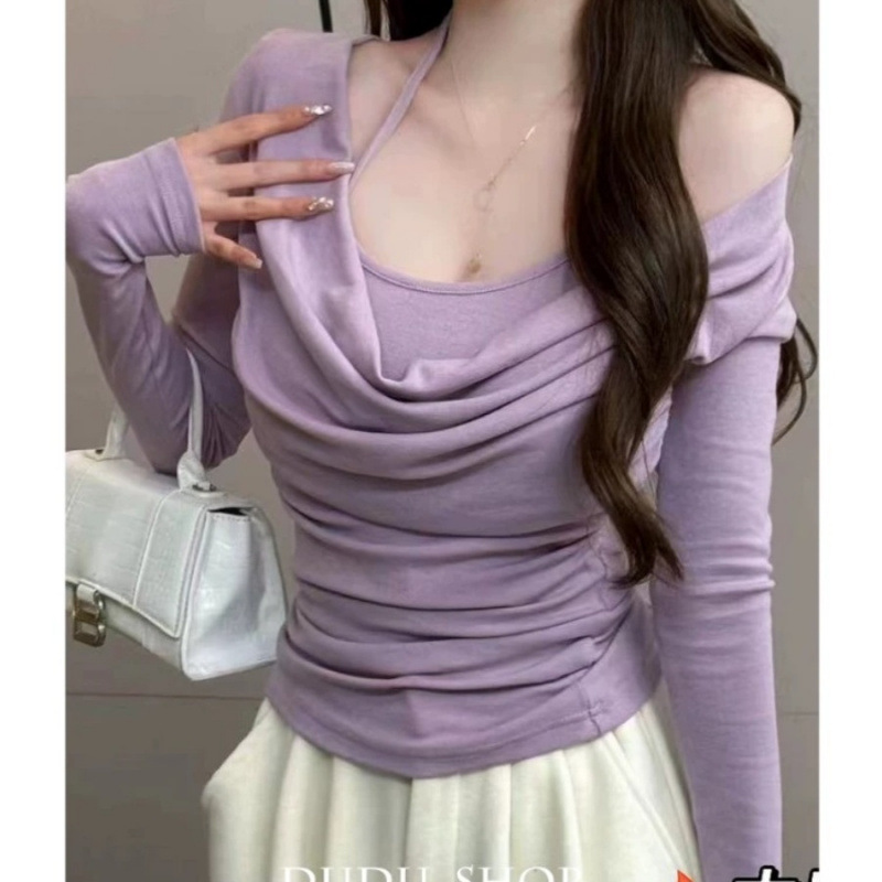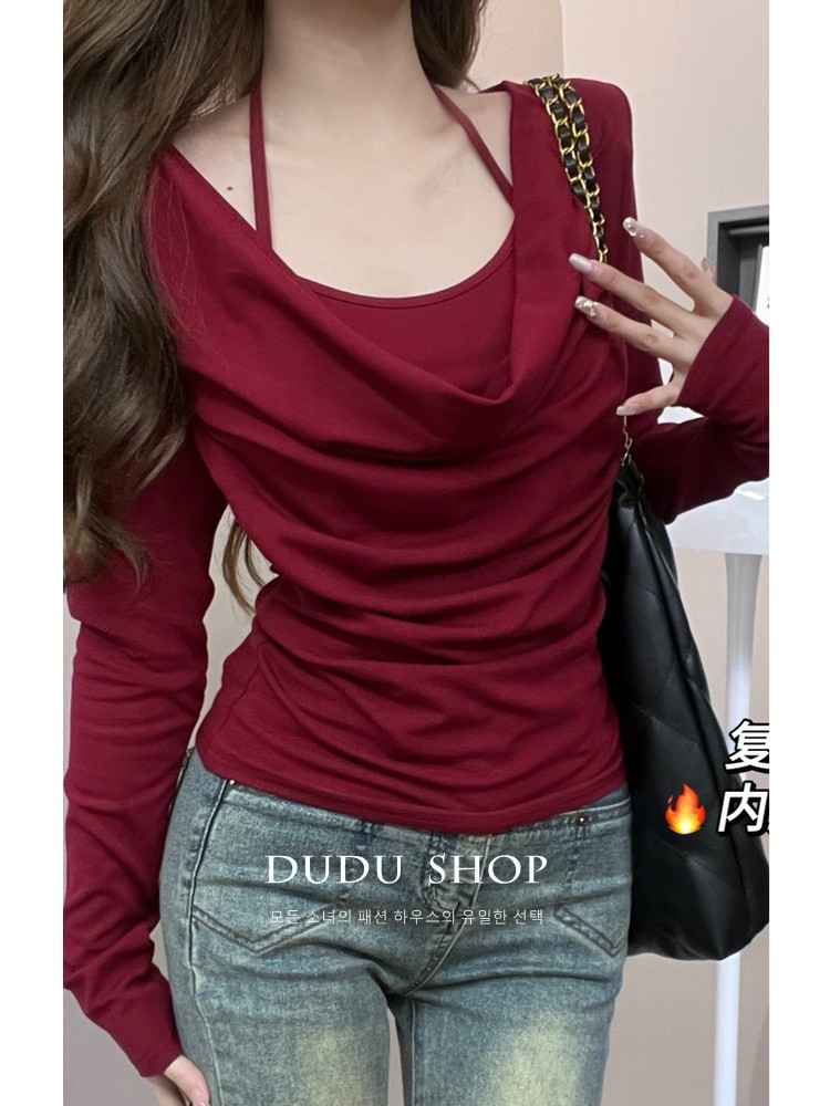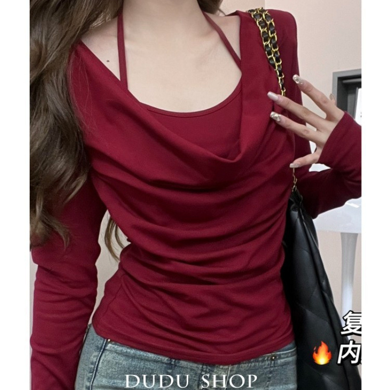 순수한 소원 칼라 넥 탑 레드 긴팔 티셔츠 여성용 봄 새로운 슬림 핏 슬리밍 숄더베이스 셔츠