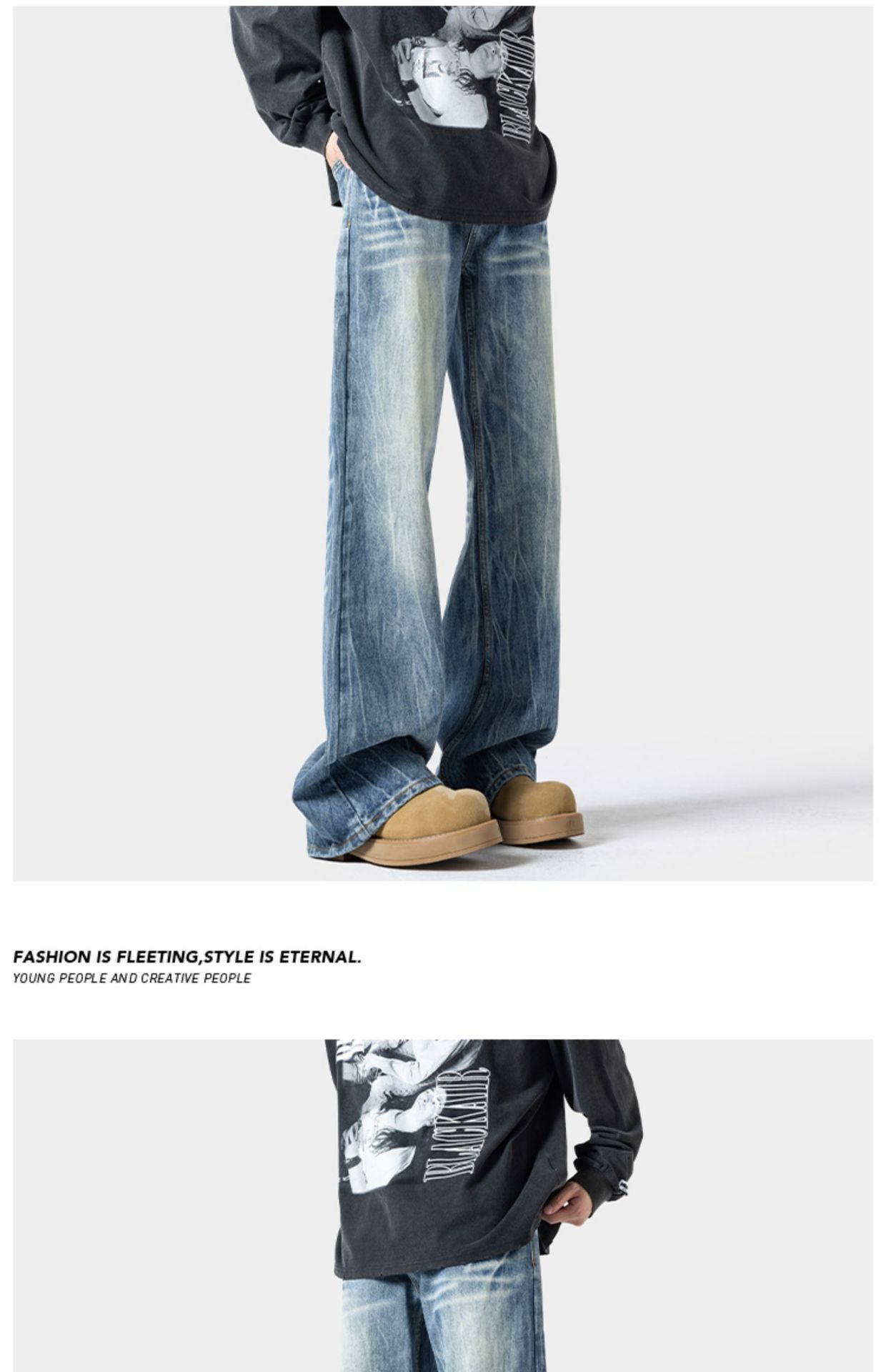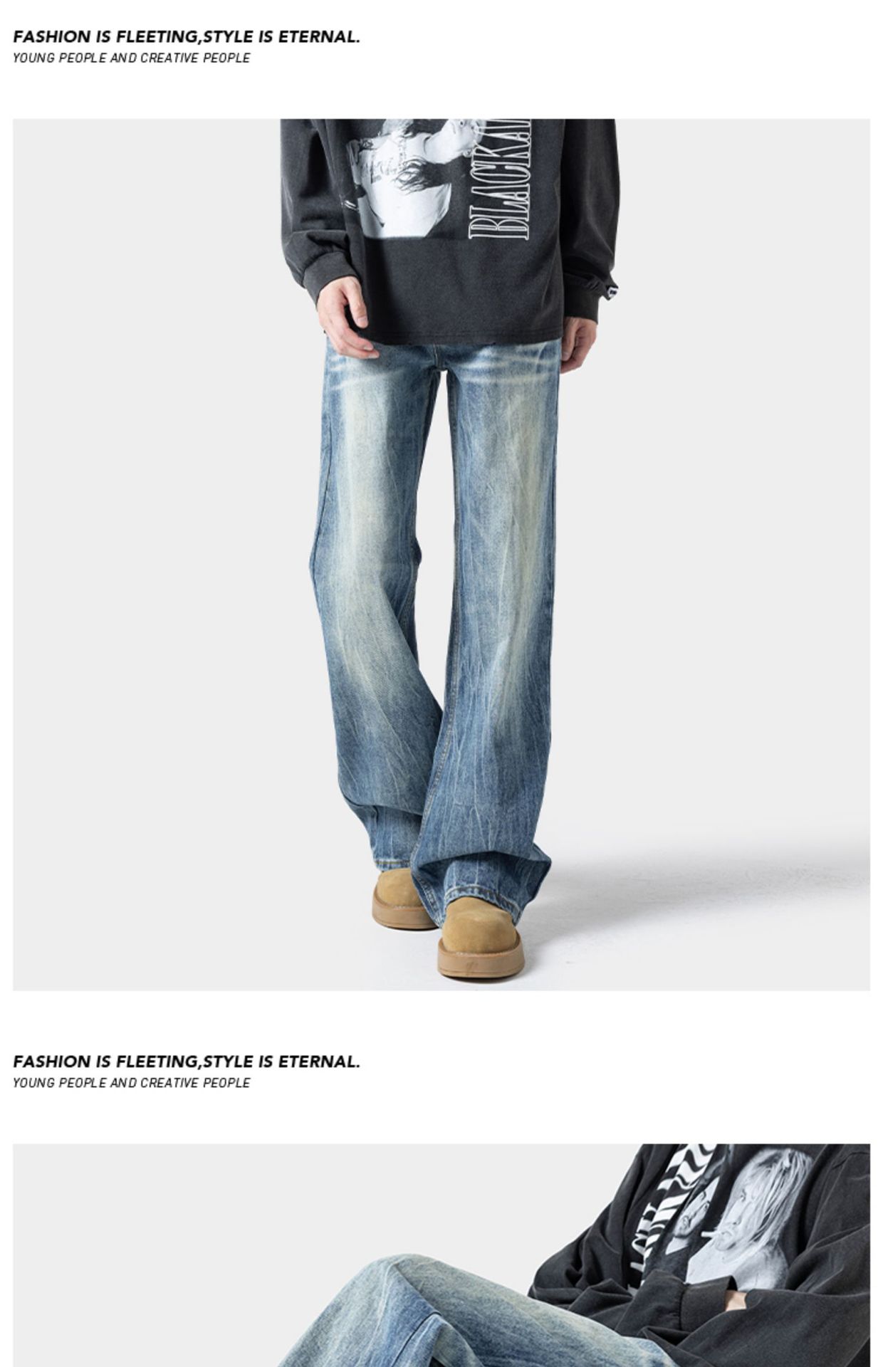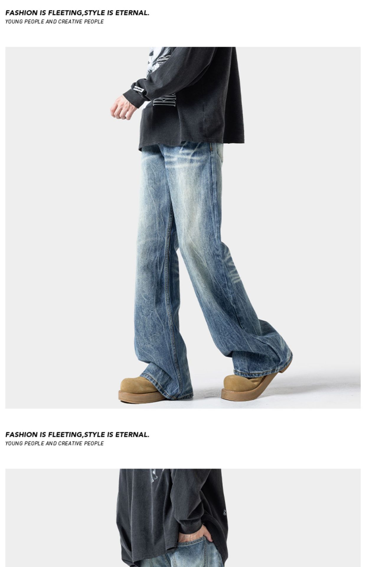 하이 스트리트 워시 라이트닝 패턴 청바지 남성 봄 아메리칸 스타일 구식 플러스 사이즈 와이드 레그 바지 디자인 센스 스트레이트 바지스토어 가기