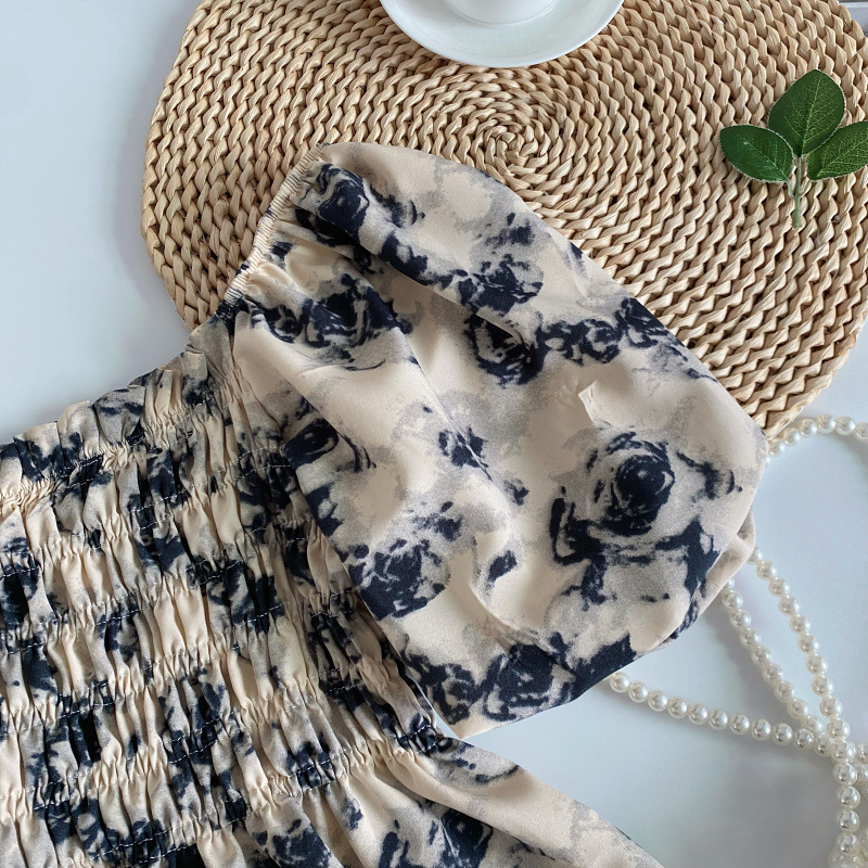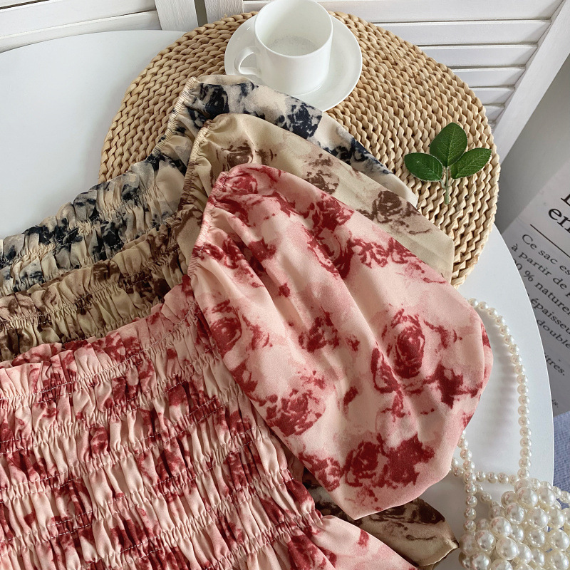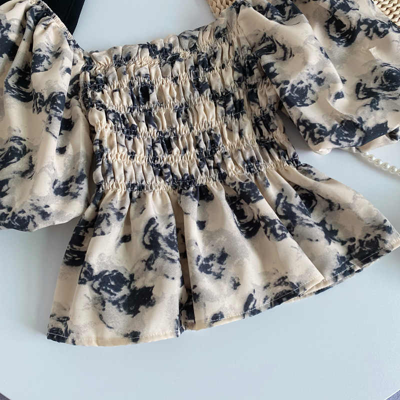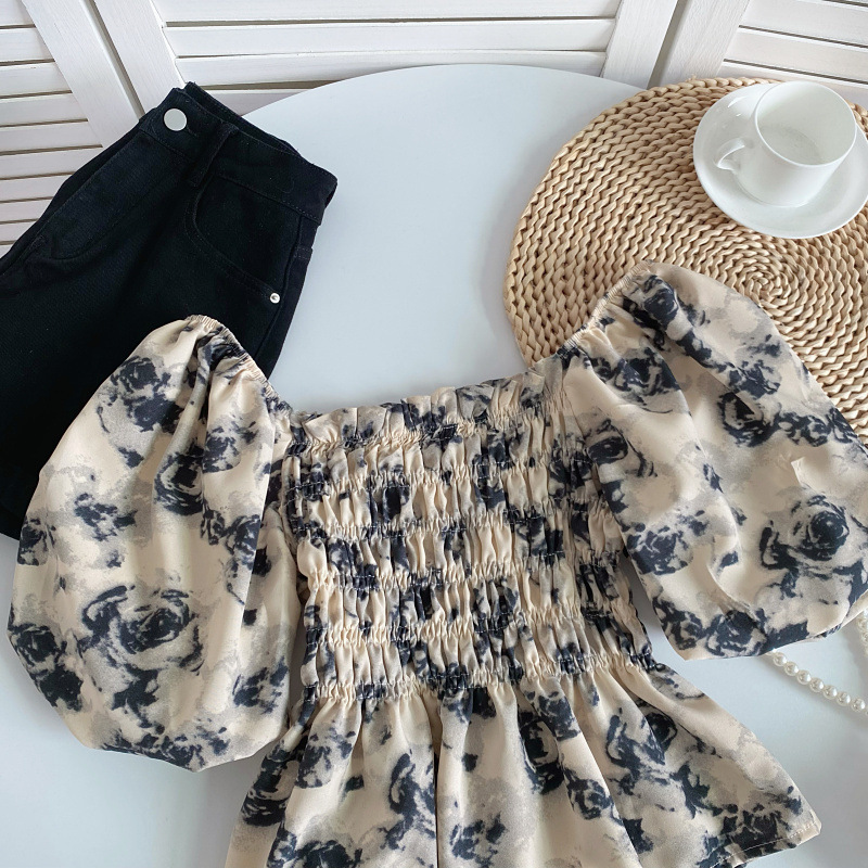나이를 줄이는 퍼프 슬리브 짧은 여성 최고 디자인 틈새 빈티지 프린트 스트레치 슬림-핏 올 매치 러플 셔츠스토어 가기