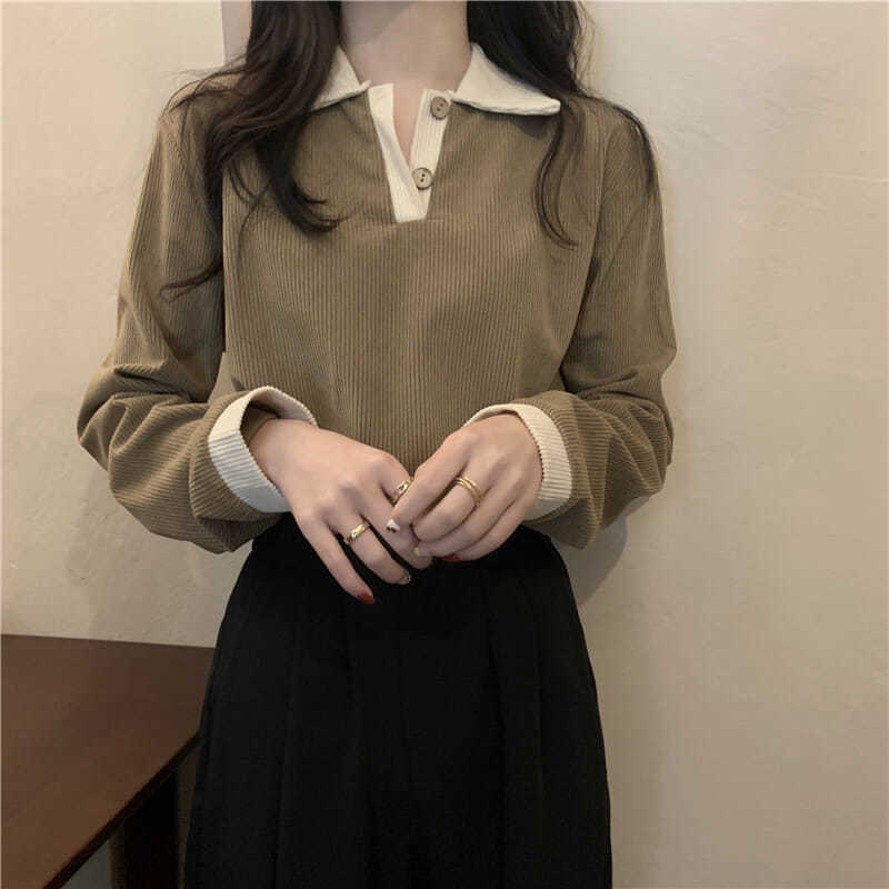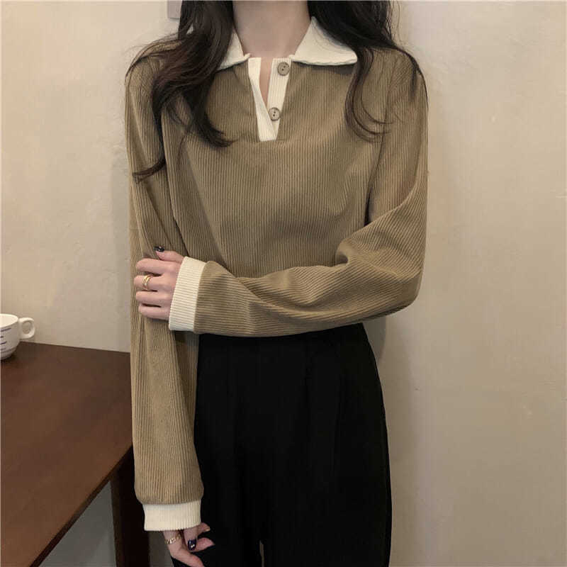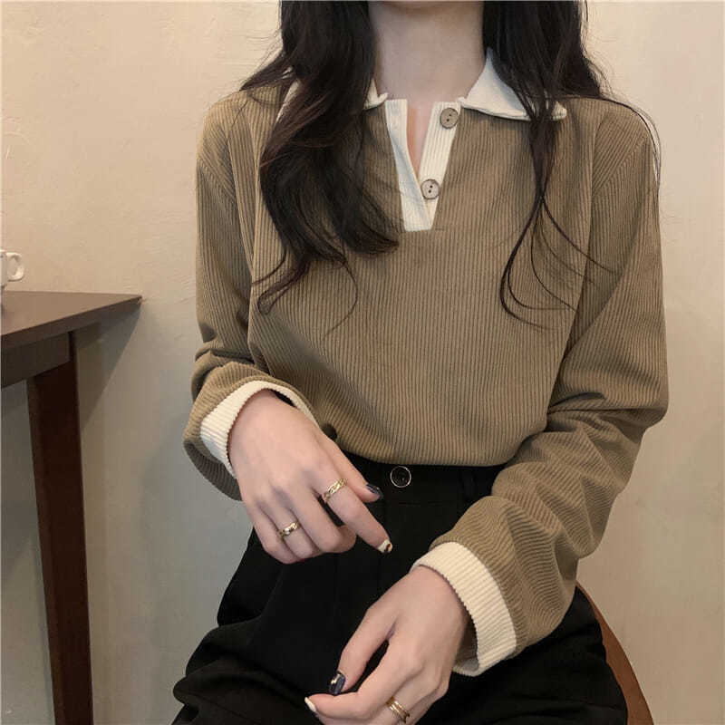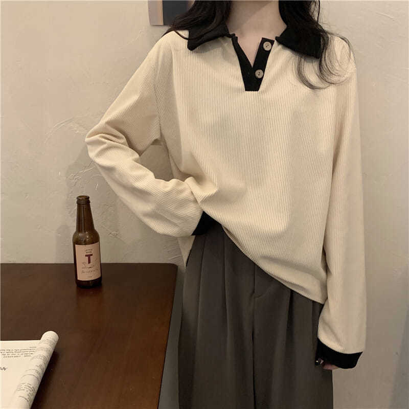 솔리드 컬러 올 매치 폴로 칼라 내부 2024 봄 새로운 여성 레트로 루즈베이스 셔츠 여학생을위한 긴팔 탑스토어 가기