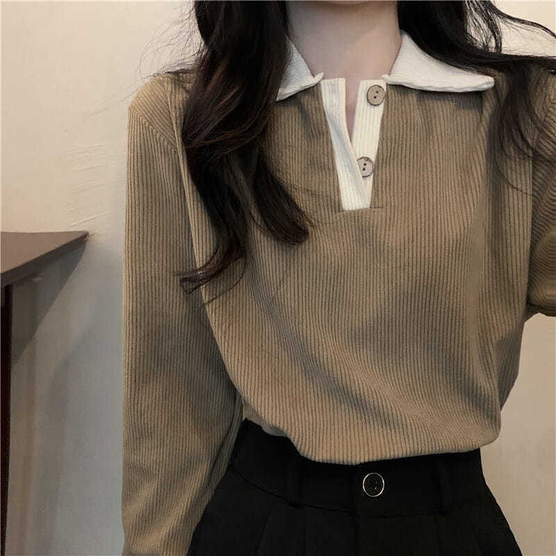 솔리드 컬러 올 매치 폴로 칼라 내부 2024 봄 새로운 여성 레트로 루즈베이스 셔츠 여학생을위한 긴팔 탑