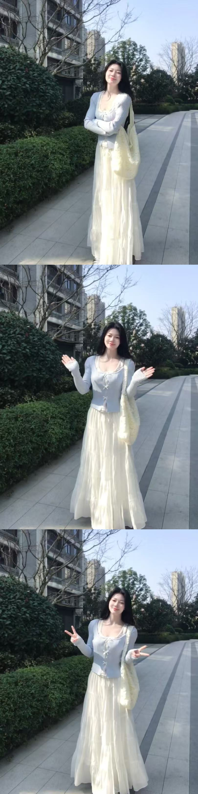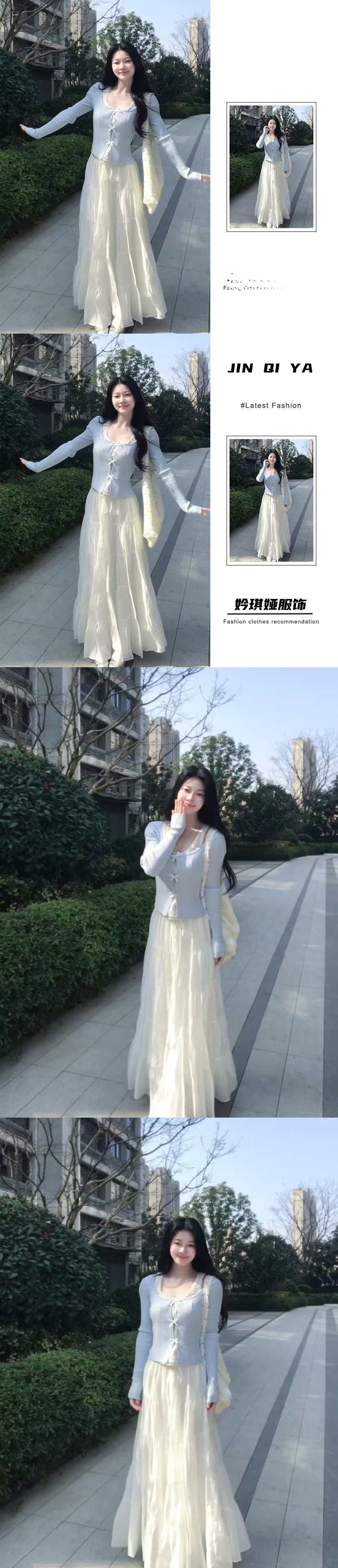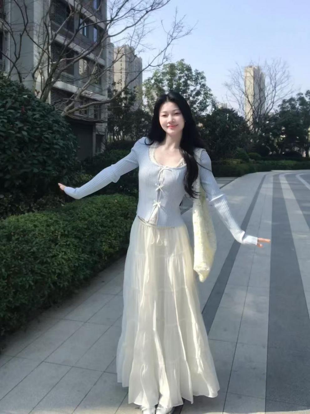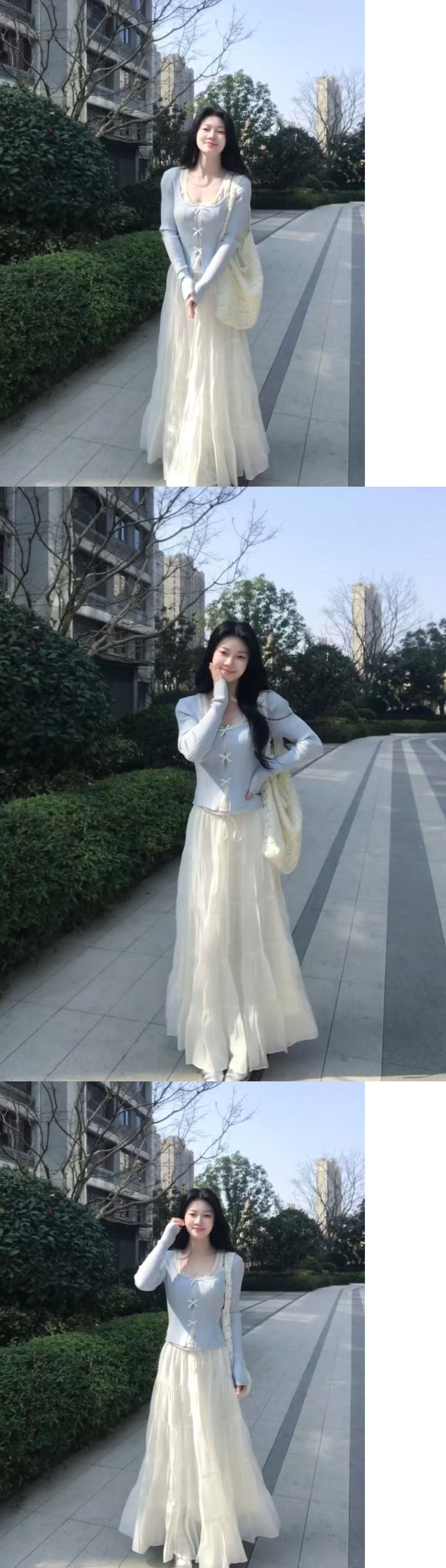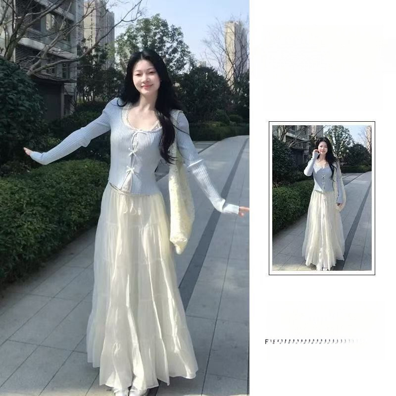 세트 여자 2025 봄 새로운 한국 스타일 부드러운 스타일 가짜 투피스 니트 카디건 높은 허리 스커트 투피스 세트스토어 가기