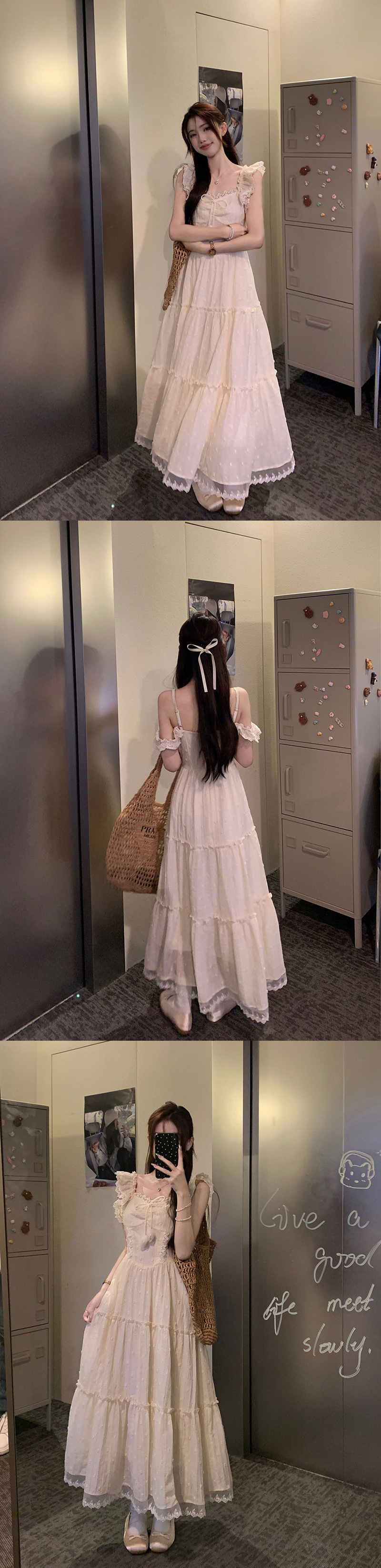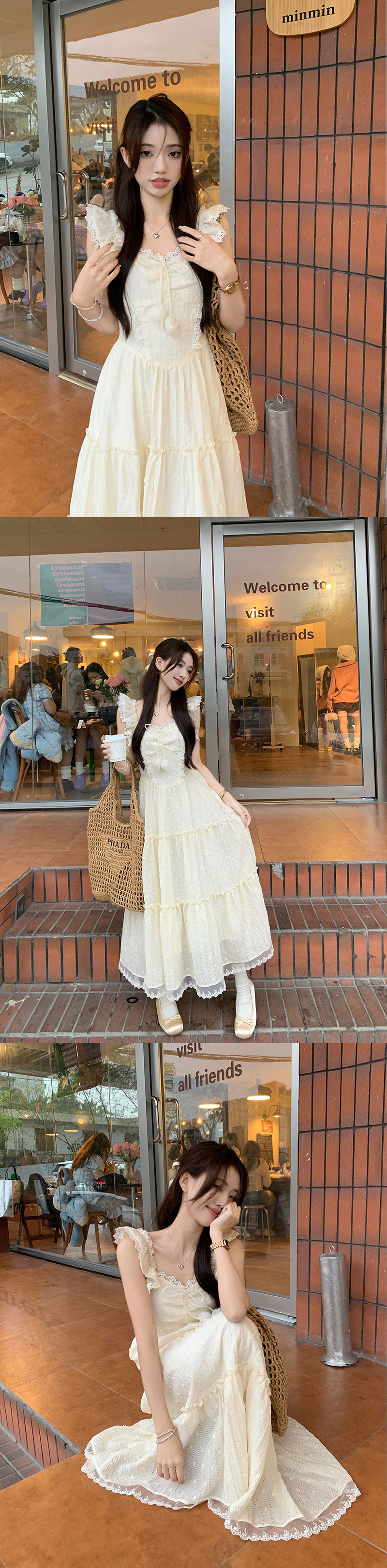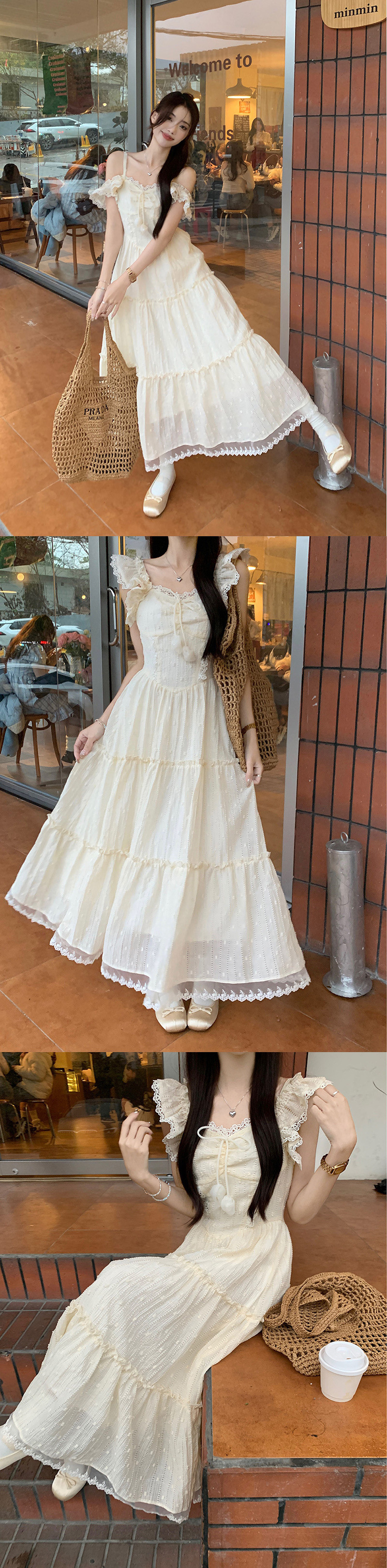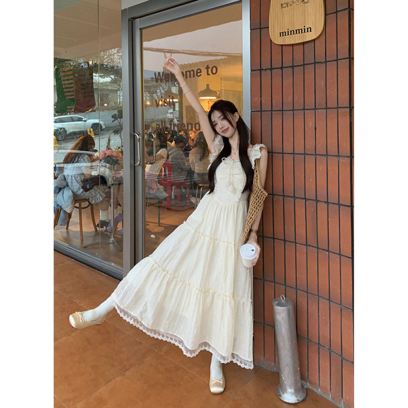 부드러운 스타일 살구색 레이스 레이스 슬링 원피스 여성 여름 슬림 핏 허리 A 라인 원피스 스위트 스타일 롱 원피스스토어 가기
