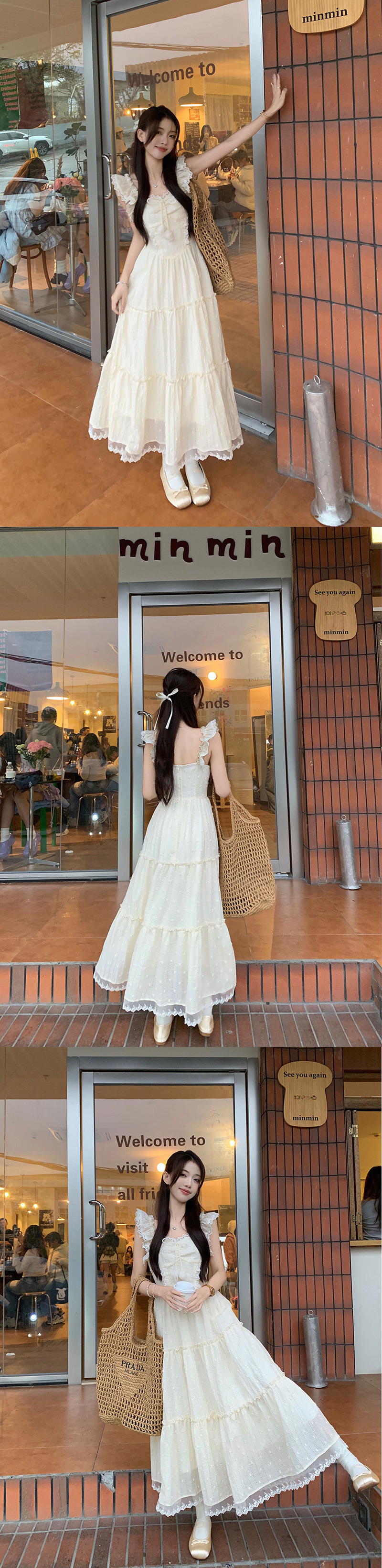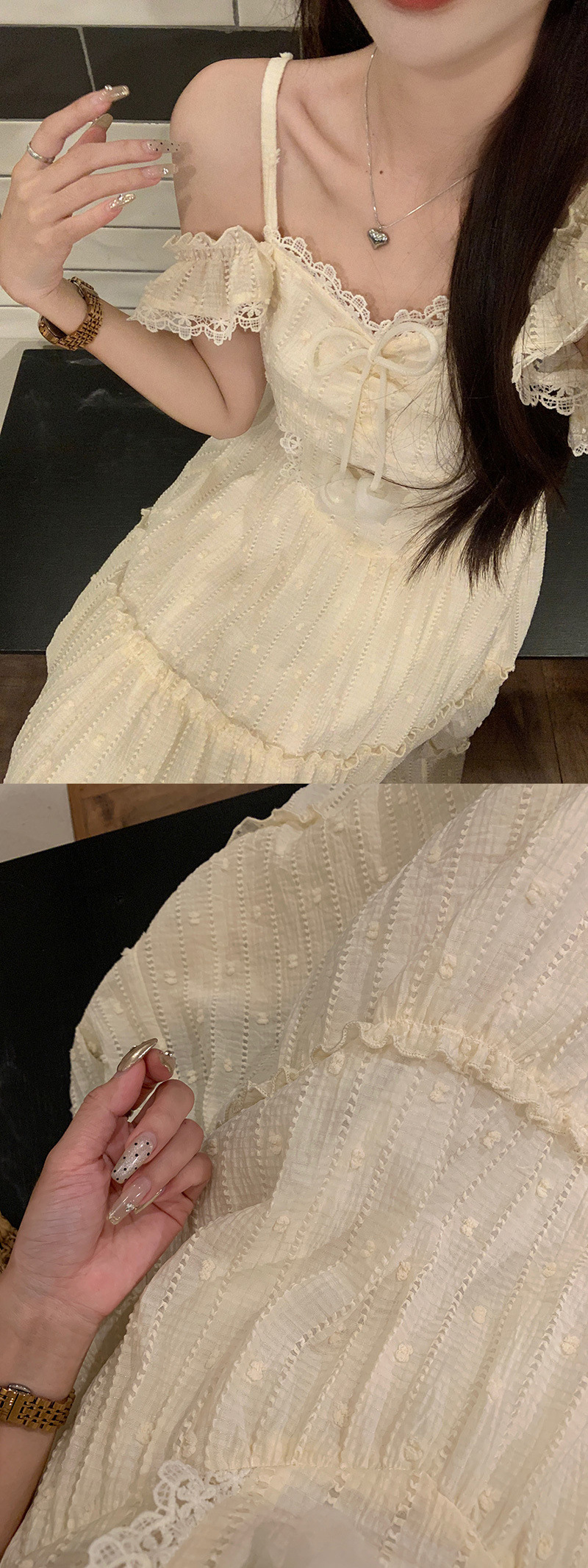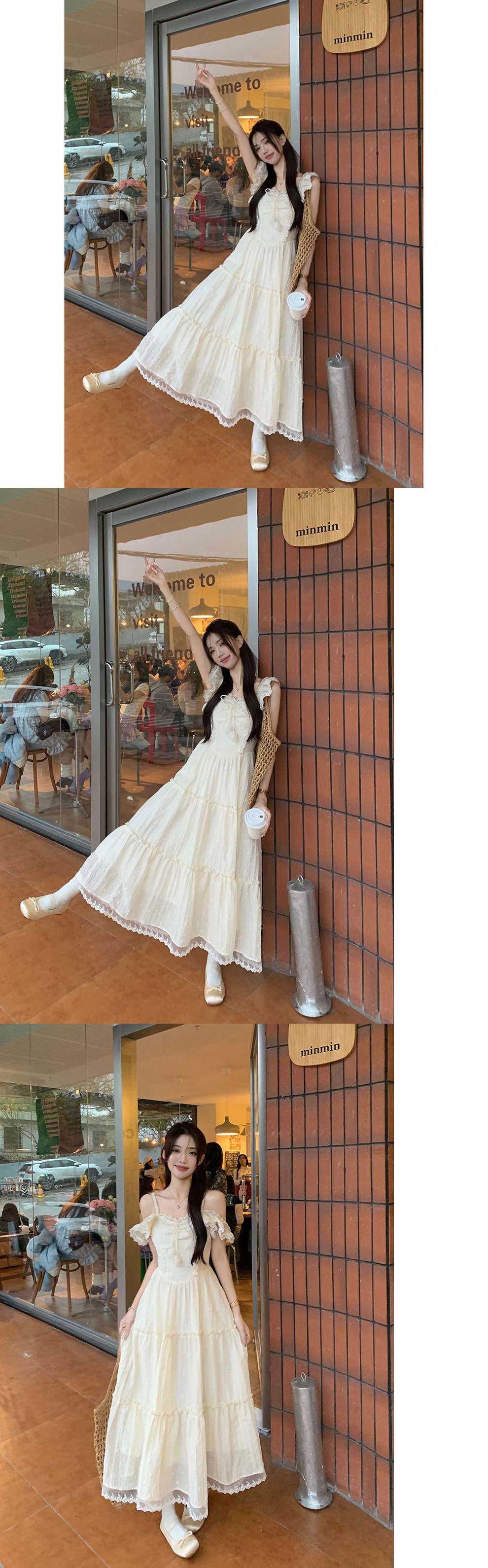 부드러운 스타일 살구색 레이스 레이스 슬링 원피스 여성 여름 슬림 핏 허리 A 라인 원피스 스위트 스타일 롱 원피스스토어 가기