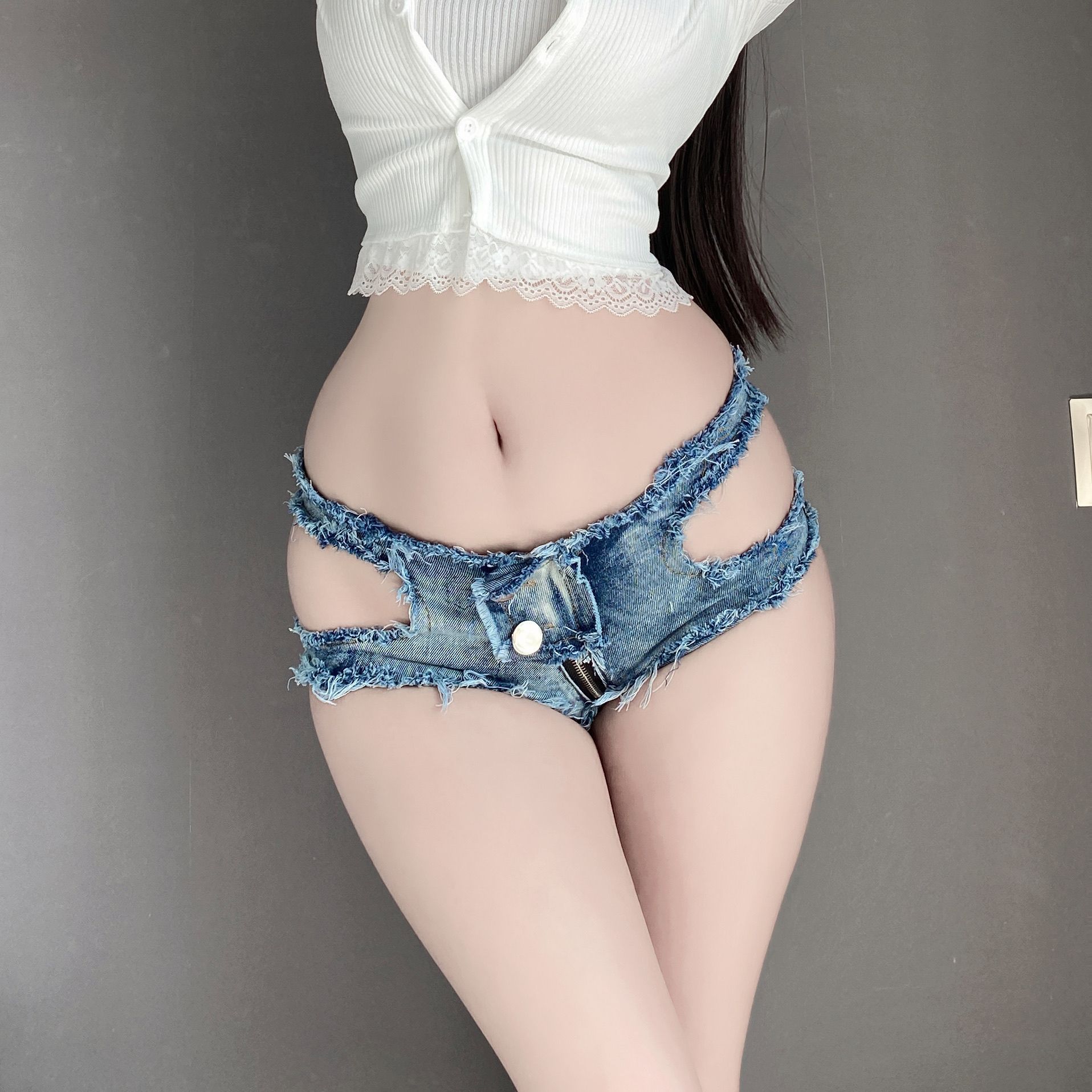 재미있는 여성의 허리가 낮은 데님 반바지 뜨거운 섹시한 유혹이 침대에서 뜨거운 여자스토어 가기