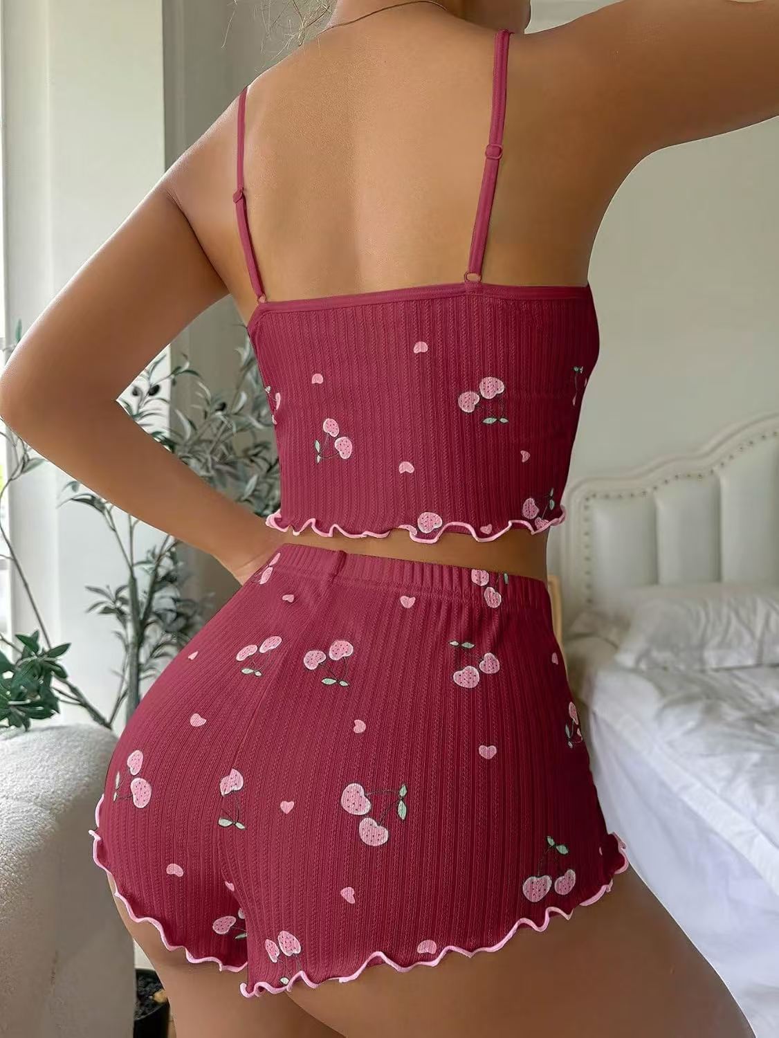 아마존 유럽과 미국의 2024 체리 프린트 카미솔과 반바지 여성 잠옷 세트 홈 웨어스토어 가기