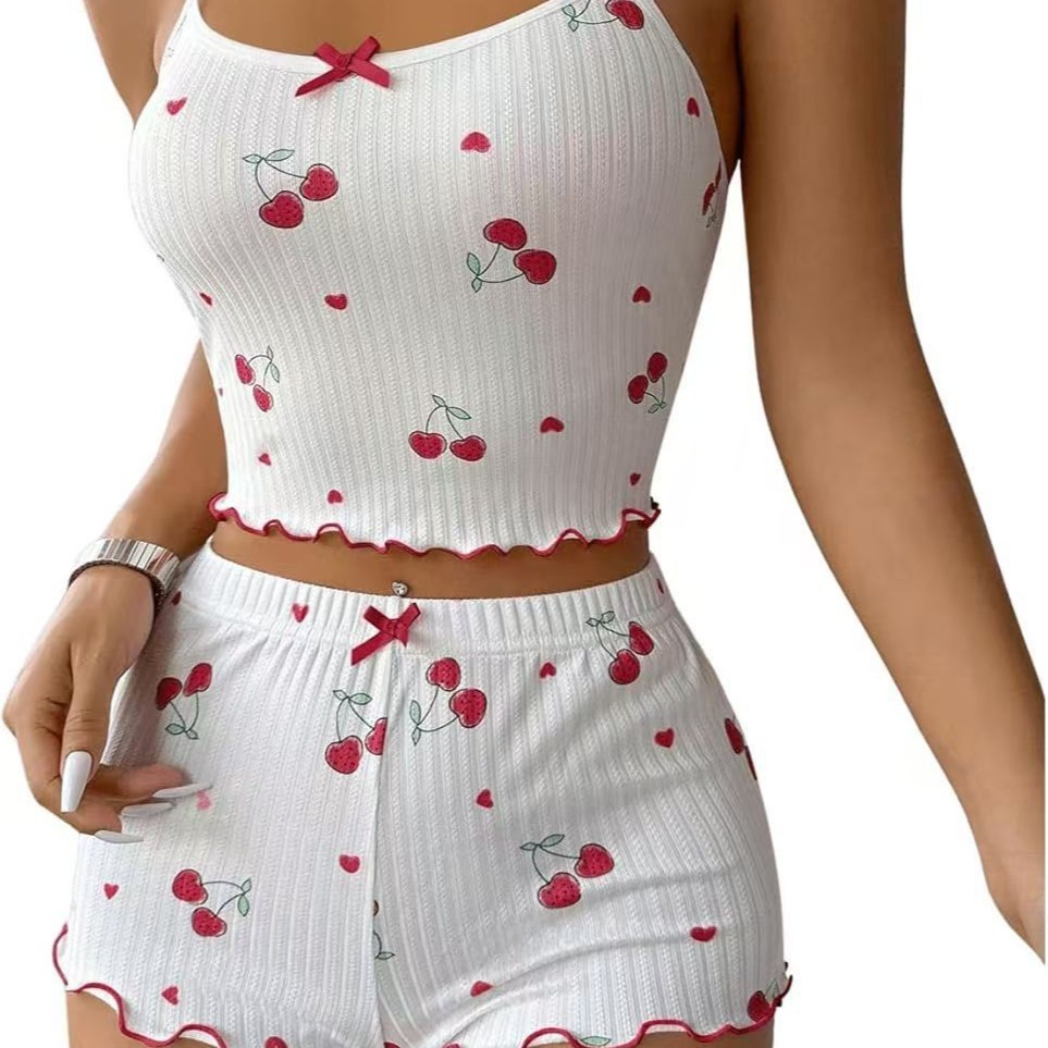 아마존 유럽과 미국의 2024 체리 프린트 카미솔과 반바지 여성 잠옷 세트 홈 웨어