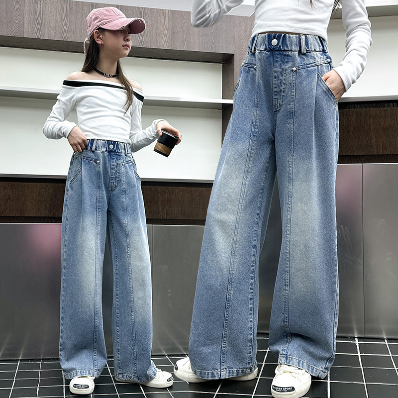 소녀 캐주얼 청바지 2025 봄 새로운 스타일 중대형 어린이 긴 바지 어린이 봄과 가을 스트레이트 다리 바지 느슨한 버전스토어 가기