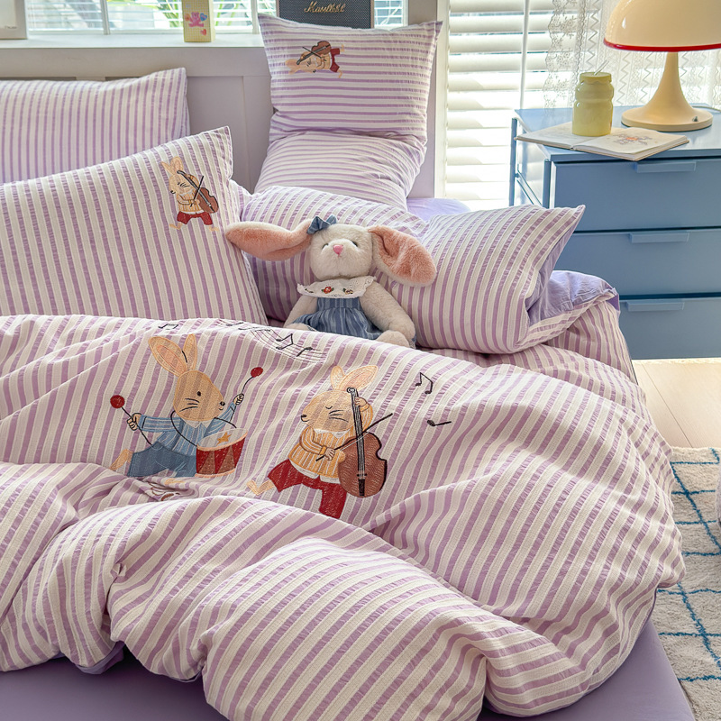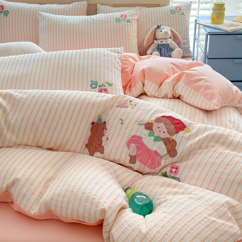귀여운 만화 100 면 세척 코튼 침대 4 피스 세트 인 스타일 코튼 자카드 퀼트 커버 침대 시트 자수 침대 시트
