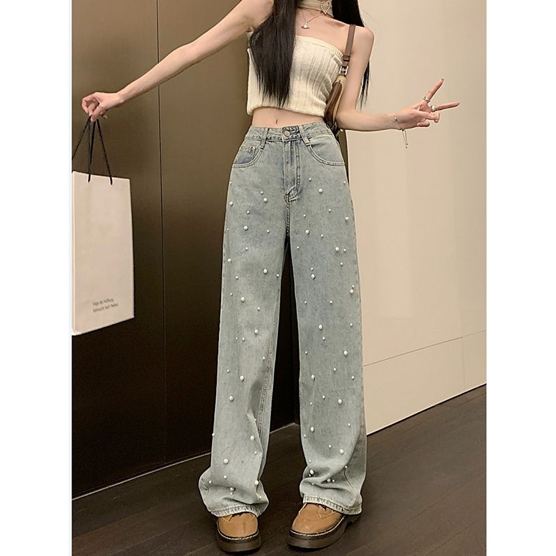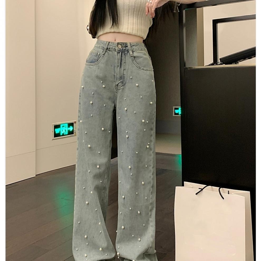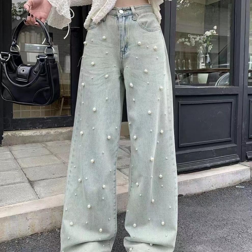 复古高腰夏季设计珍珠牛仔裤重工新款直筒筒裤宽松显瘦拖地裤子