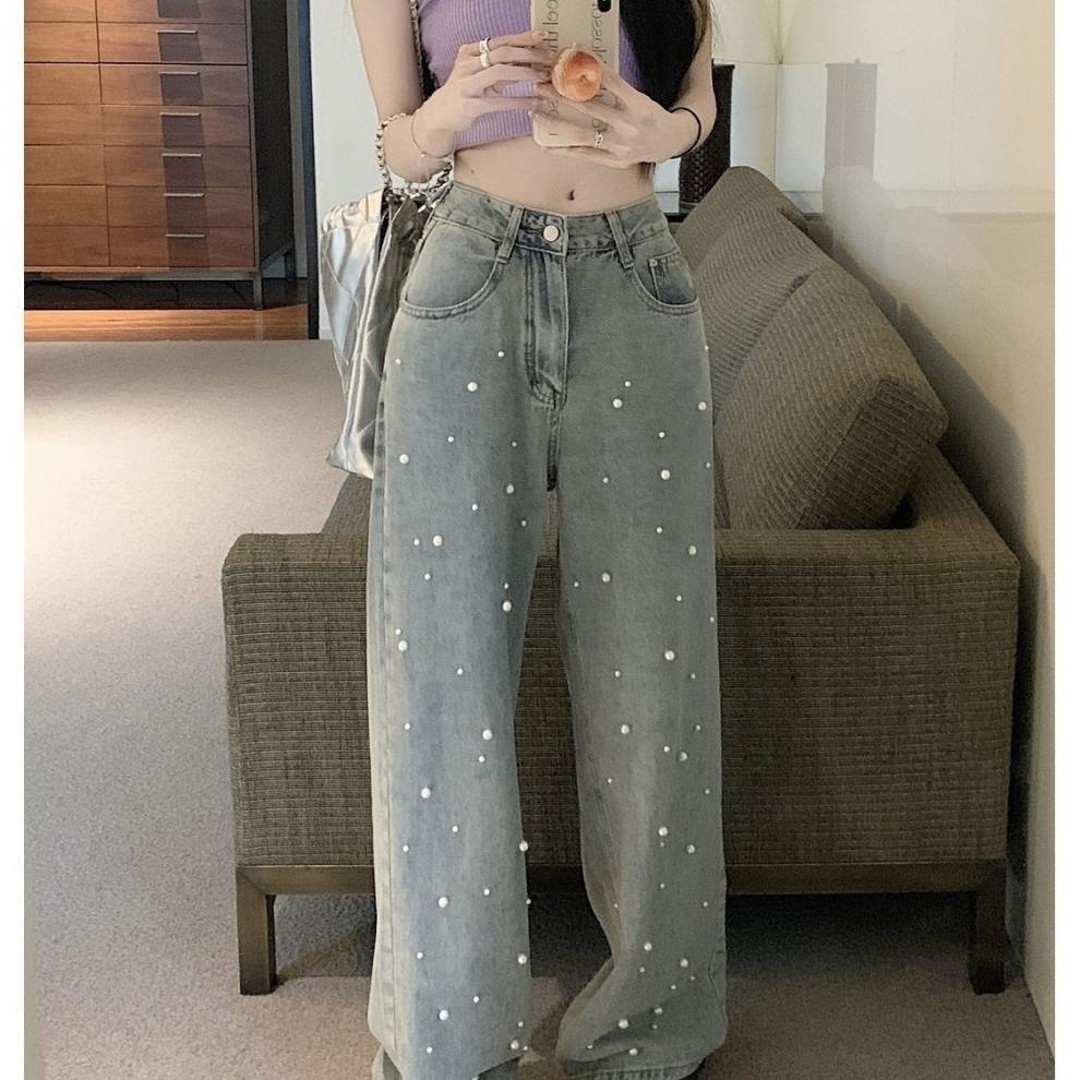 국경 간 높은 허리 여름 디자인 진주 청바지 중공업 새로운 스타일 스트레이트 다리 바지 느슨한 슬림 핏 걸레 바지 여성스토어 가기