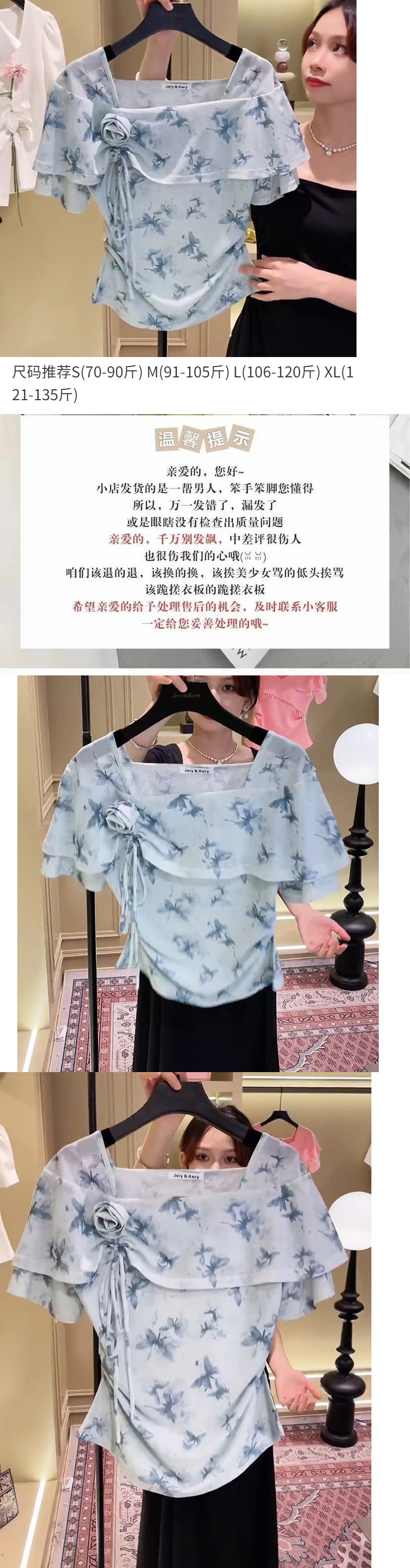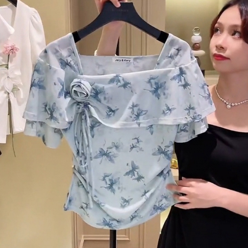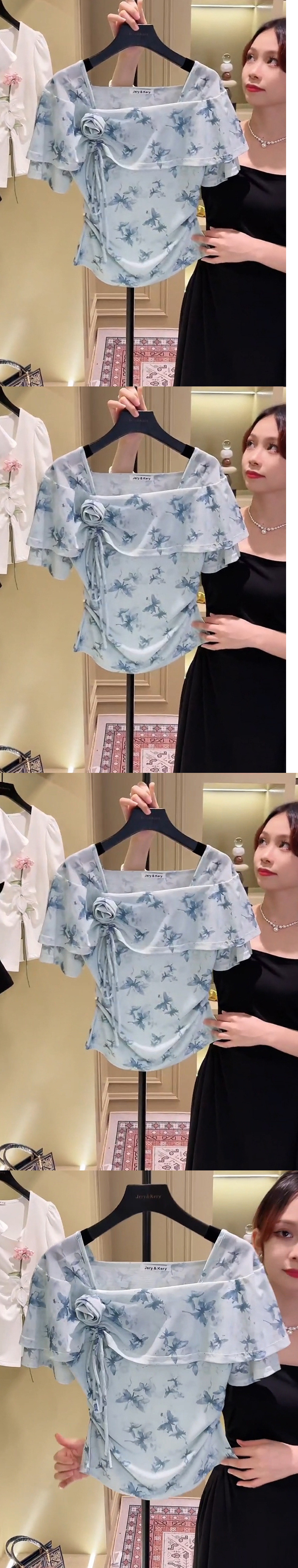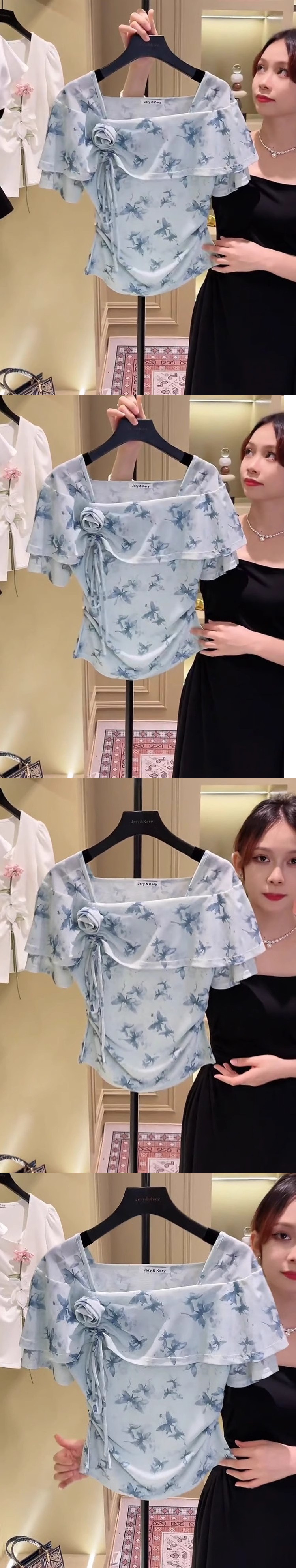 순수한 욕망 스타일 우아한 블루 나비 인쇄 반팔 티셔츠 여성의 여름 새로운 3 차원 꽃 불규칙한 탑