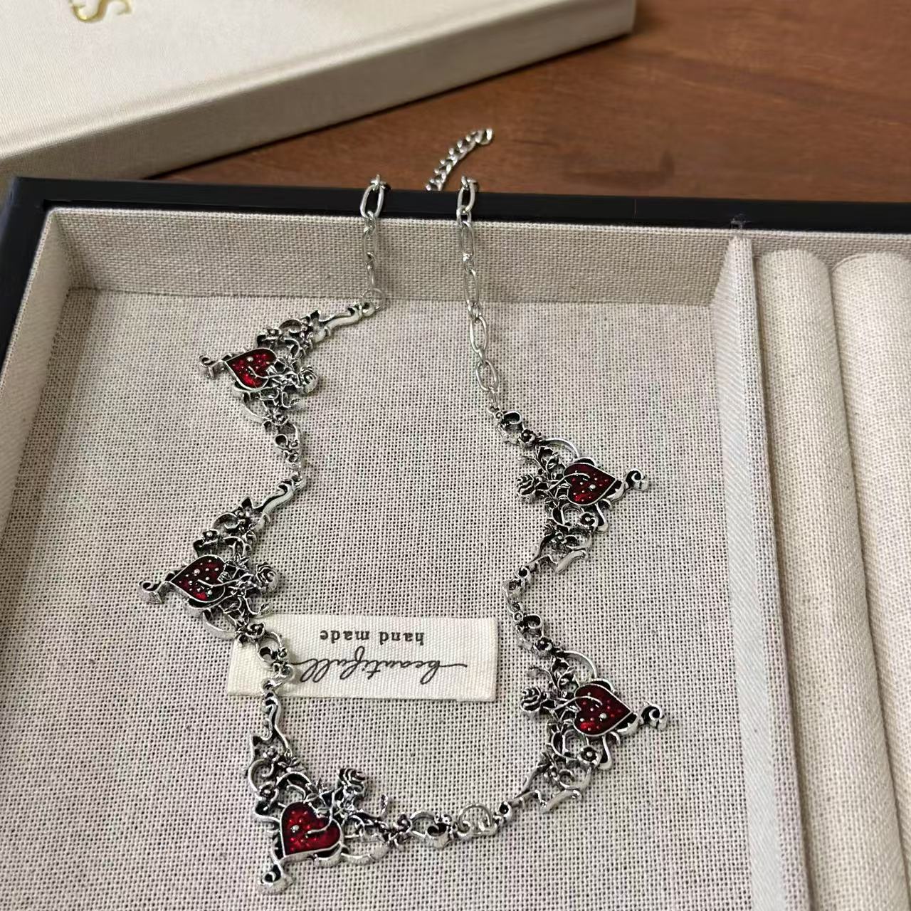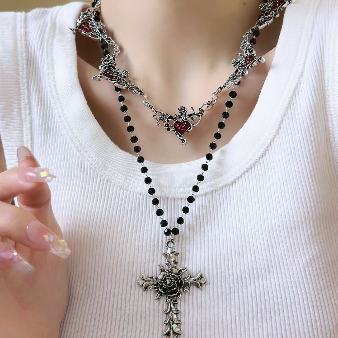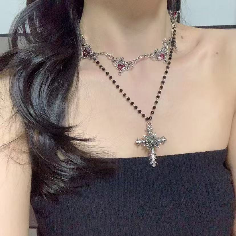 디아블로 고딕 Y2K 중공업 더블 레이어 사랑 크로스 구슬 목걸이 여성 펑크 디자인 맞춤형 쇄골 체인 타이드