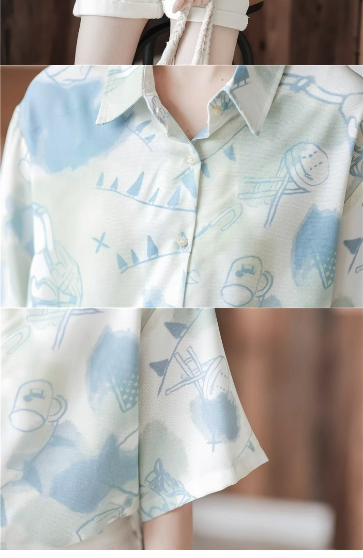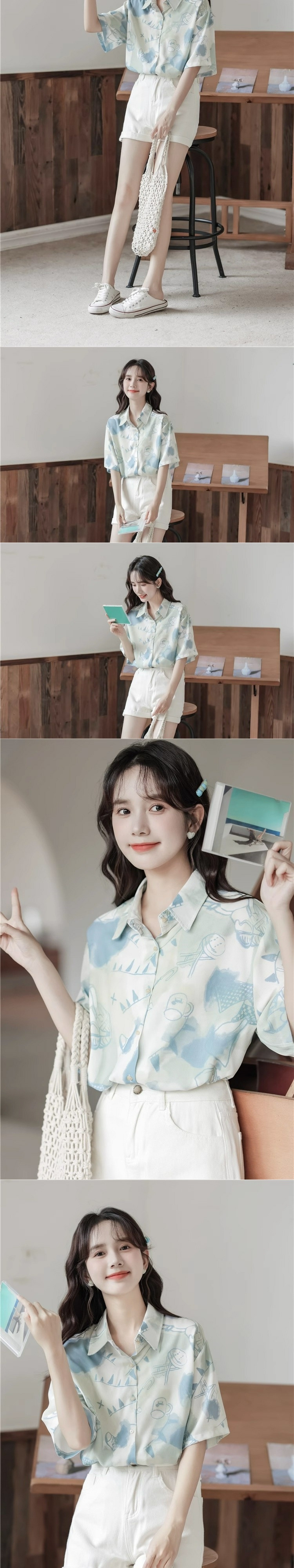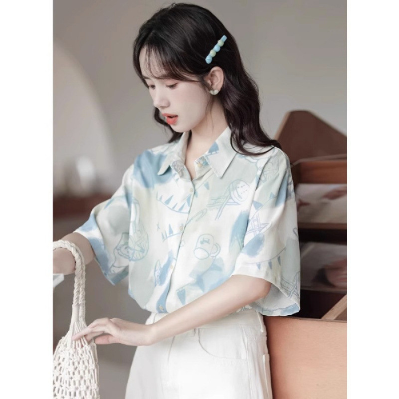 2025 새로운 디자인 센스 작은 사람들이 반팔 셔츠 여성의 여름 틈새 대학 스타일 슬리밍 루즈 탑 인쇄스토어 가기