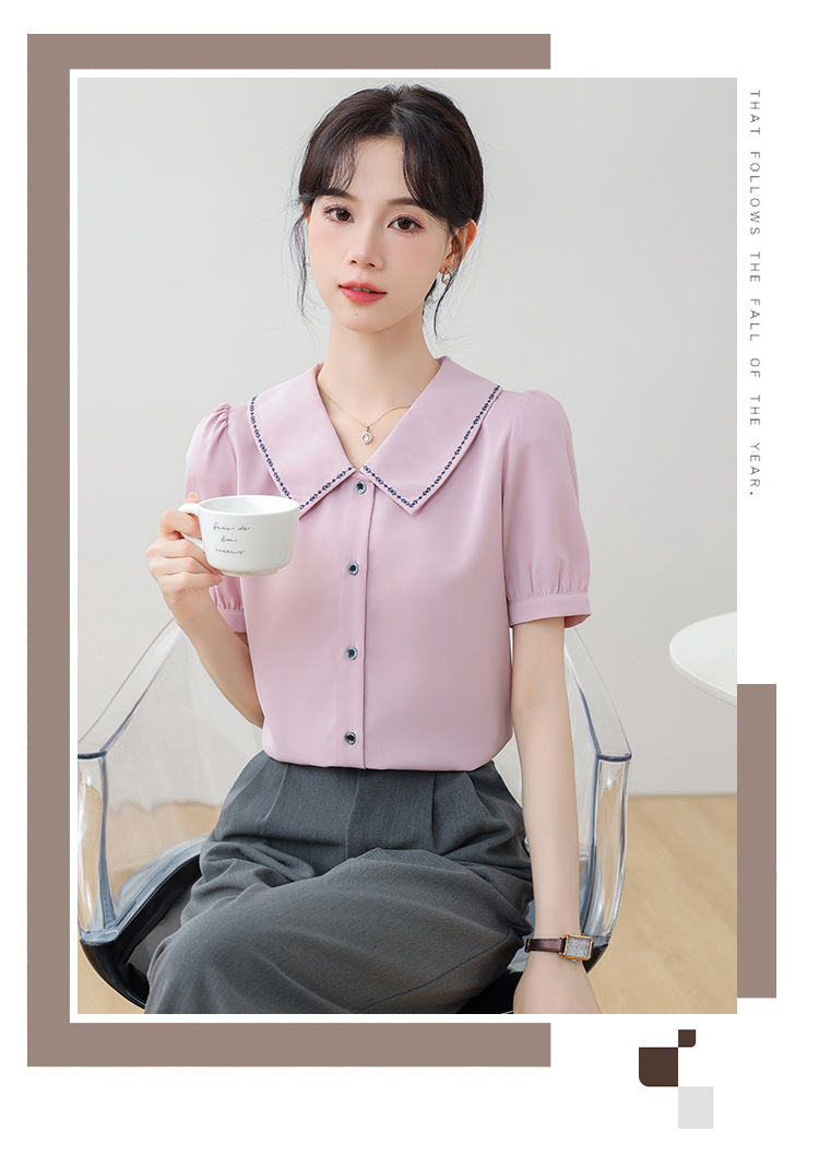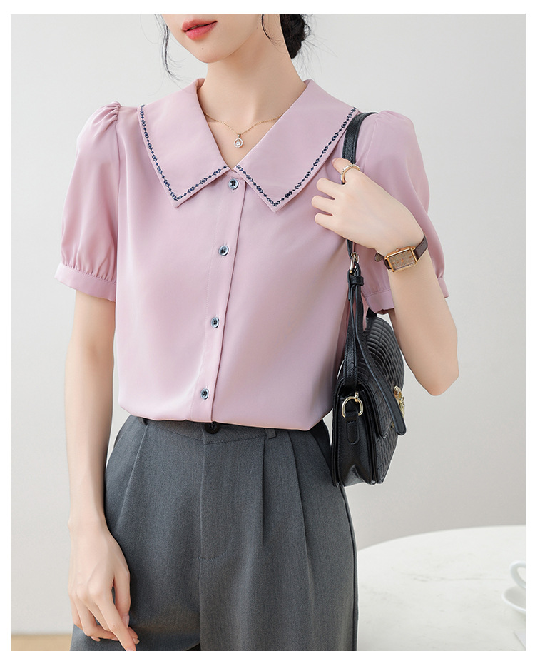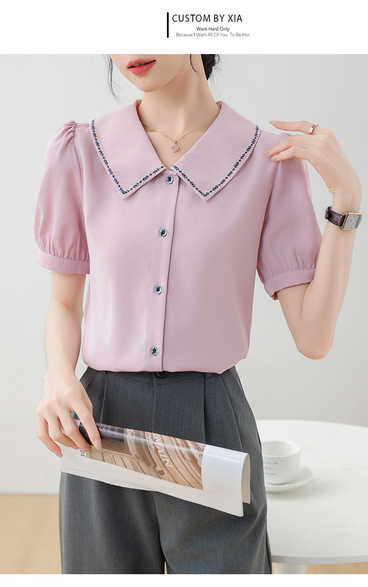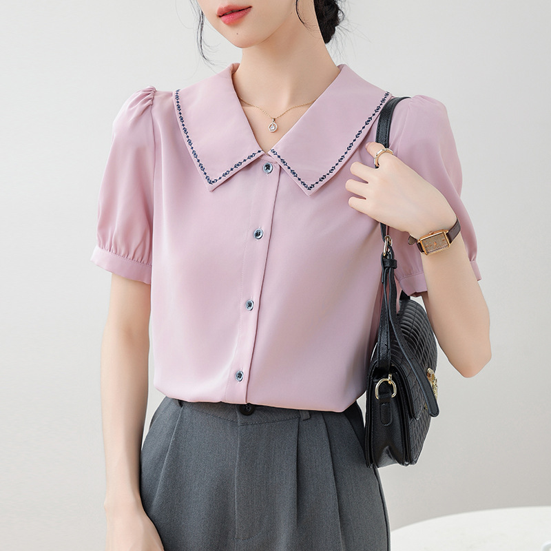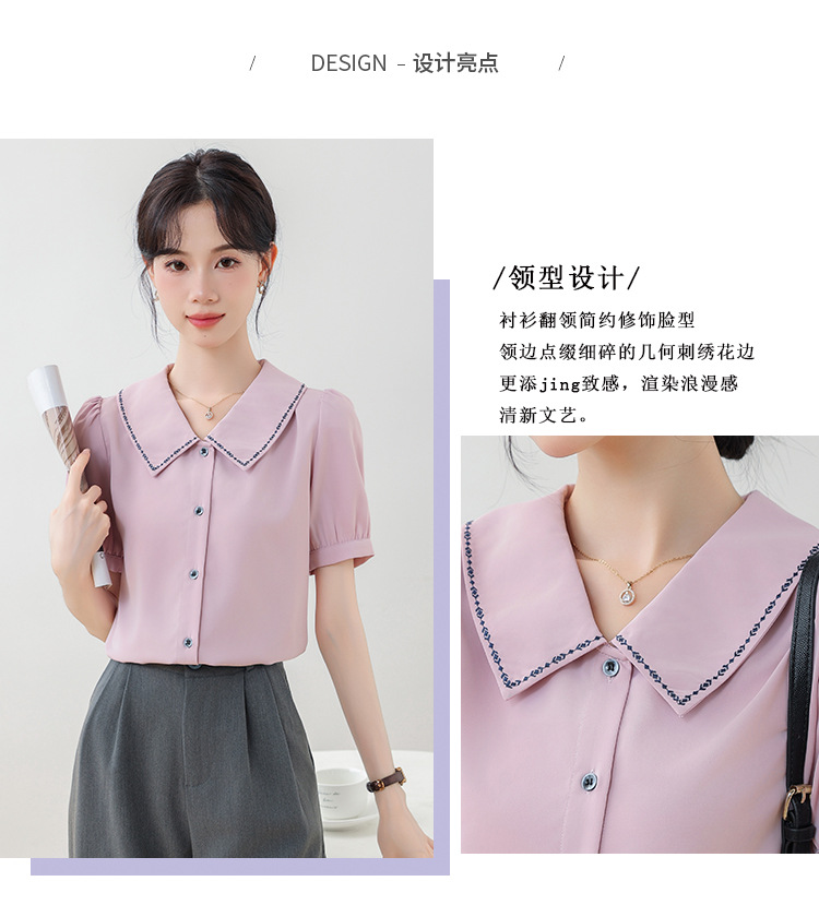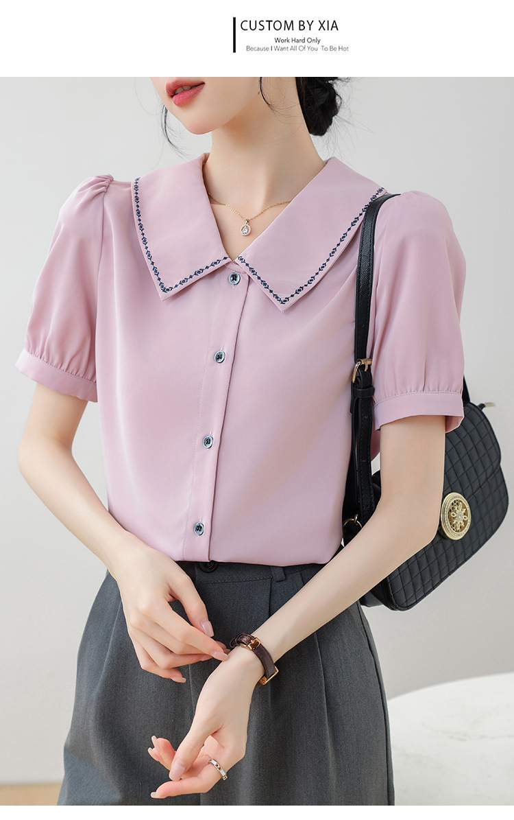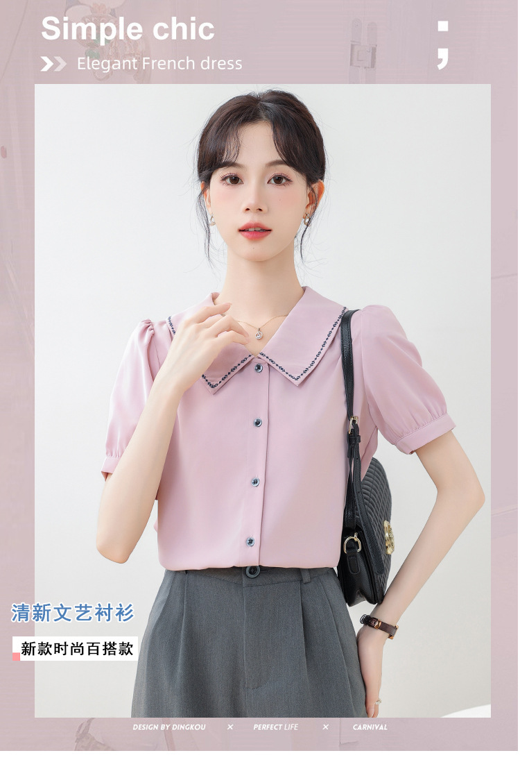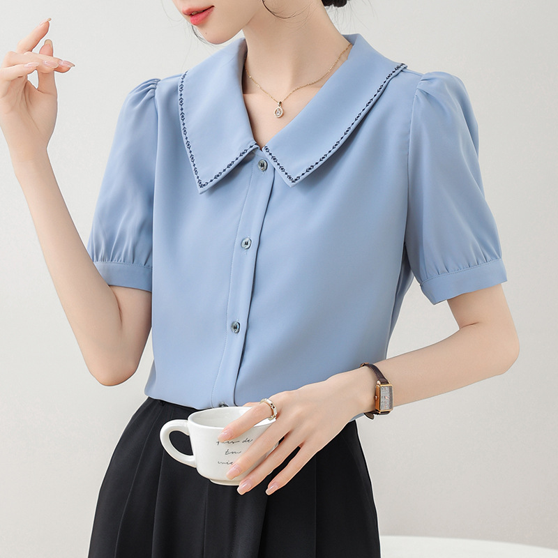 리얼 샷 반팔 셔츠 여성 디자인 센스 틈새 2024 여름 새로운 우아한 슬림 자수 랩 탑