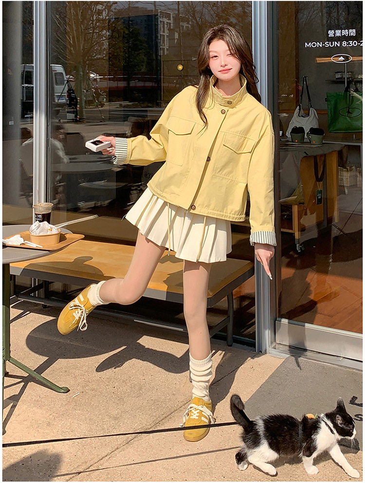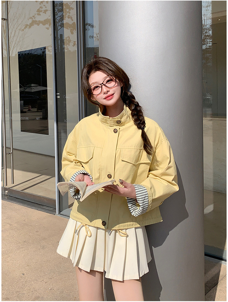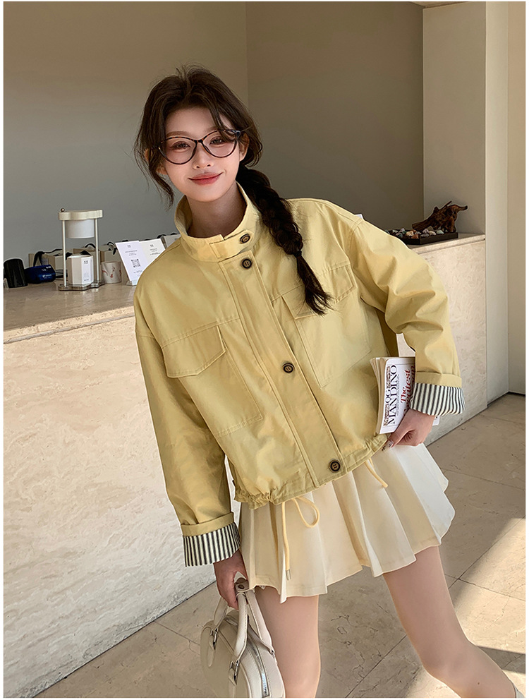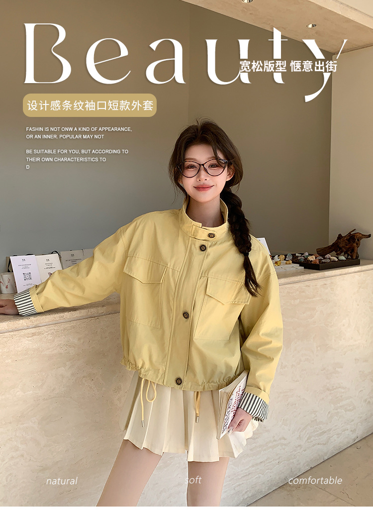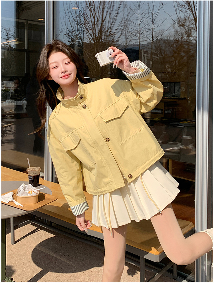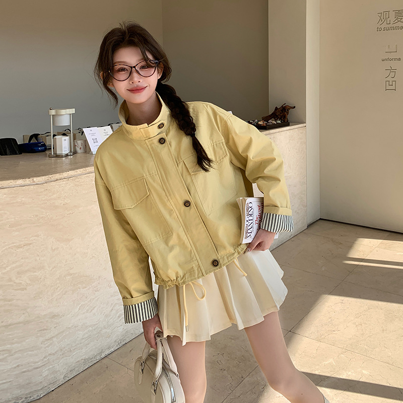 [멩메이] 25 봄 메이파 노란색 한국 캐주얼 스트라이프 바느질 칼라코트 여성 유행 서양식 쇼트 재킷