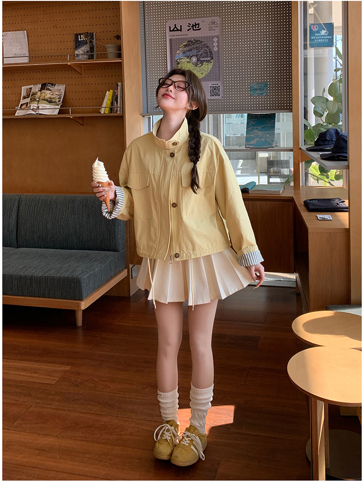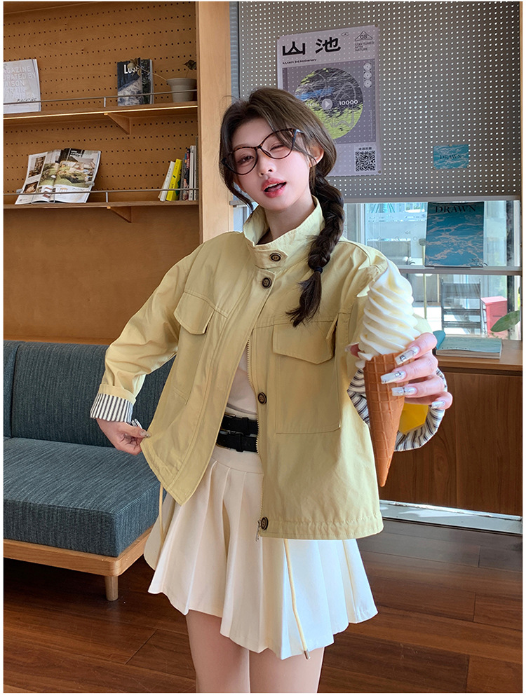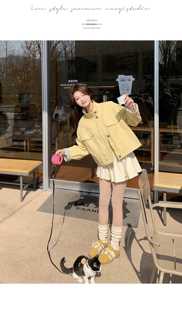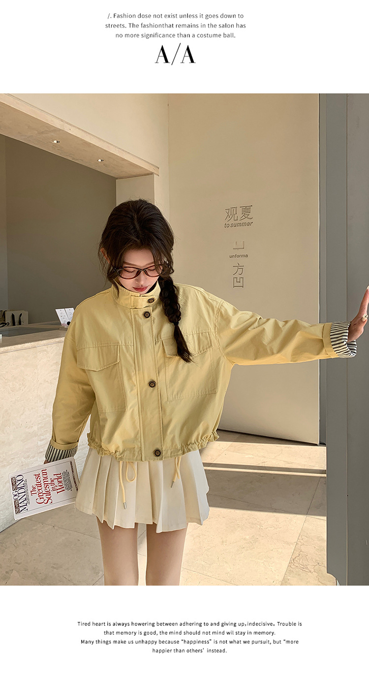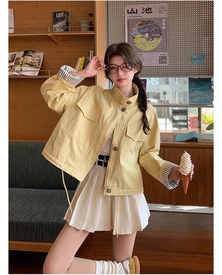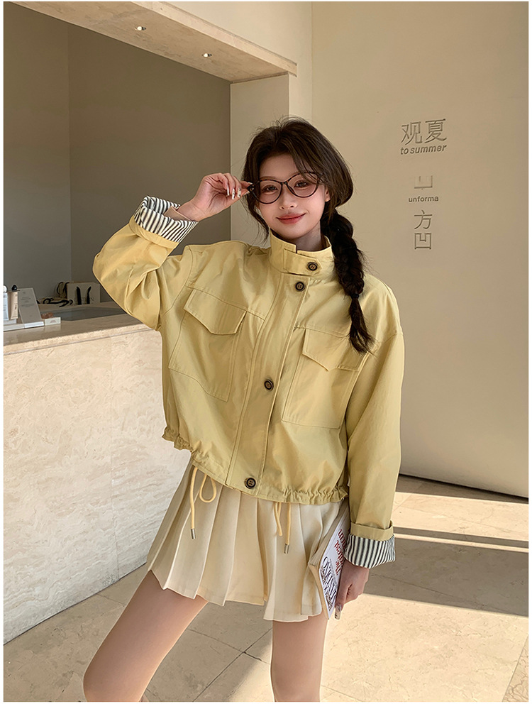 [멩메이] 25 봄 메이파 노란색 한국 캐주얼 스트라이프 바느질 칼라코트 여성 유행 서양식 쇼트 재킷