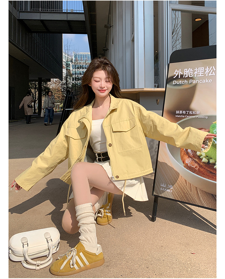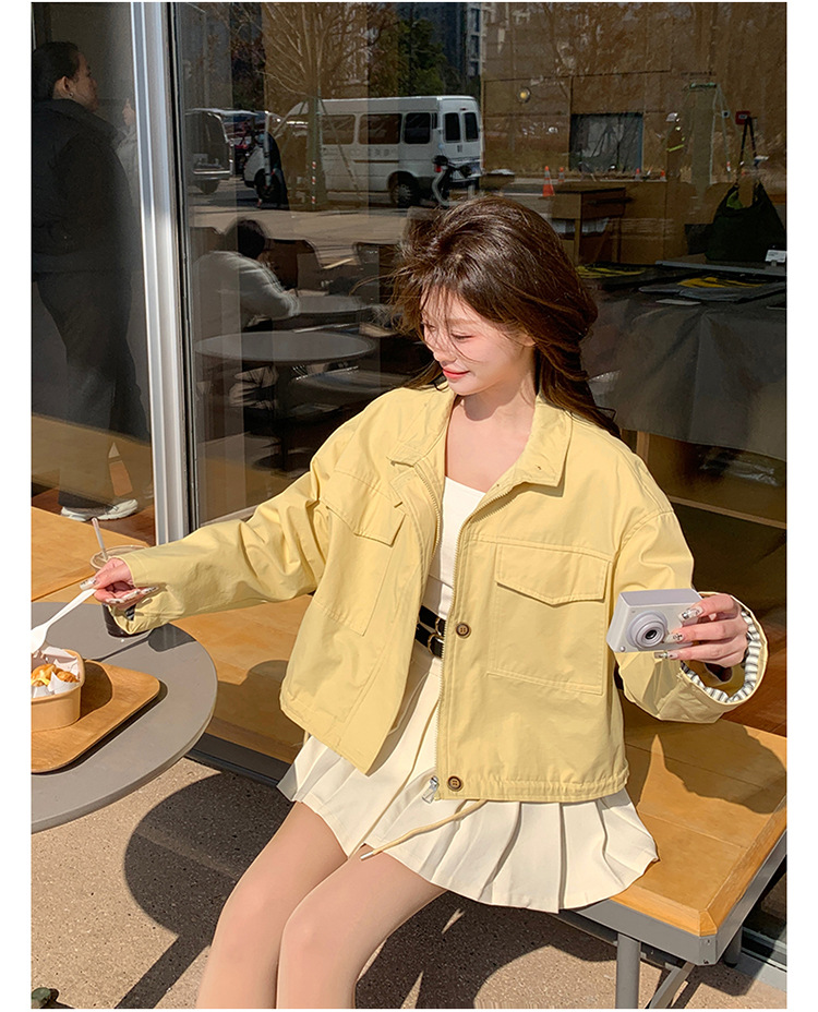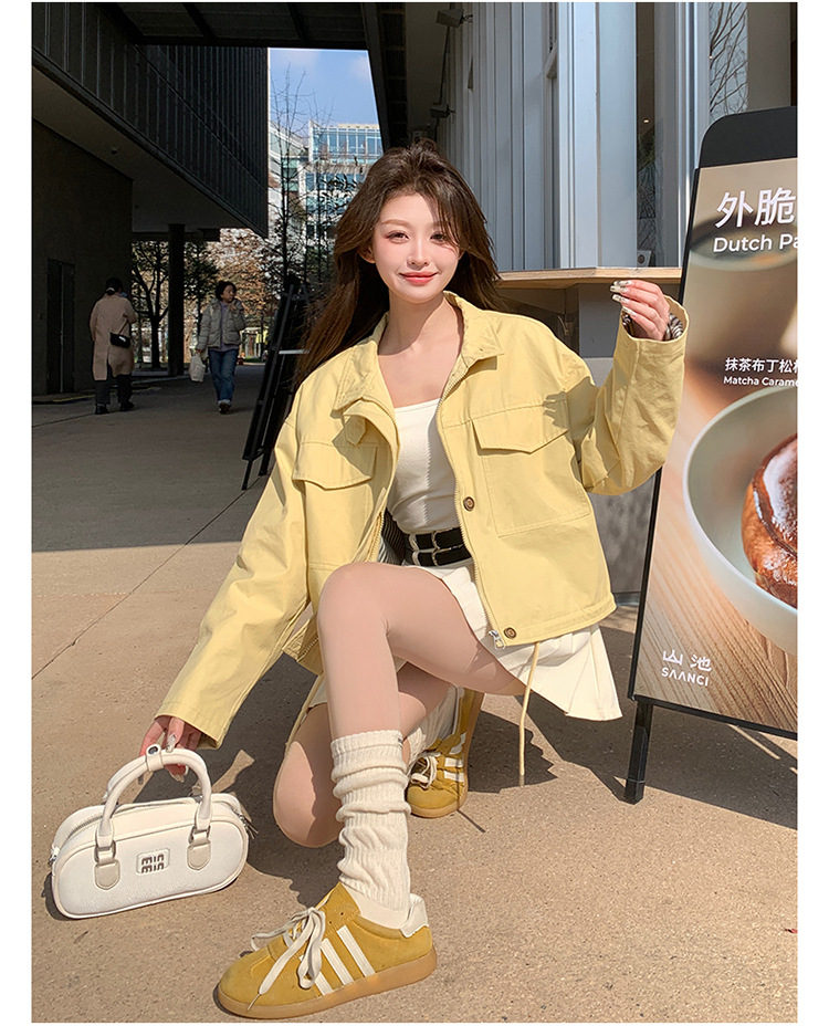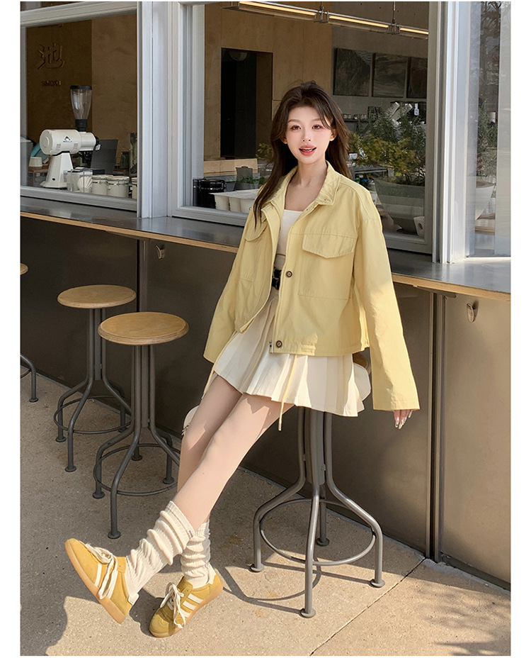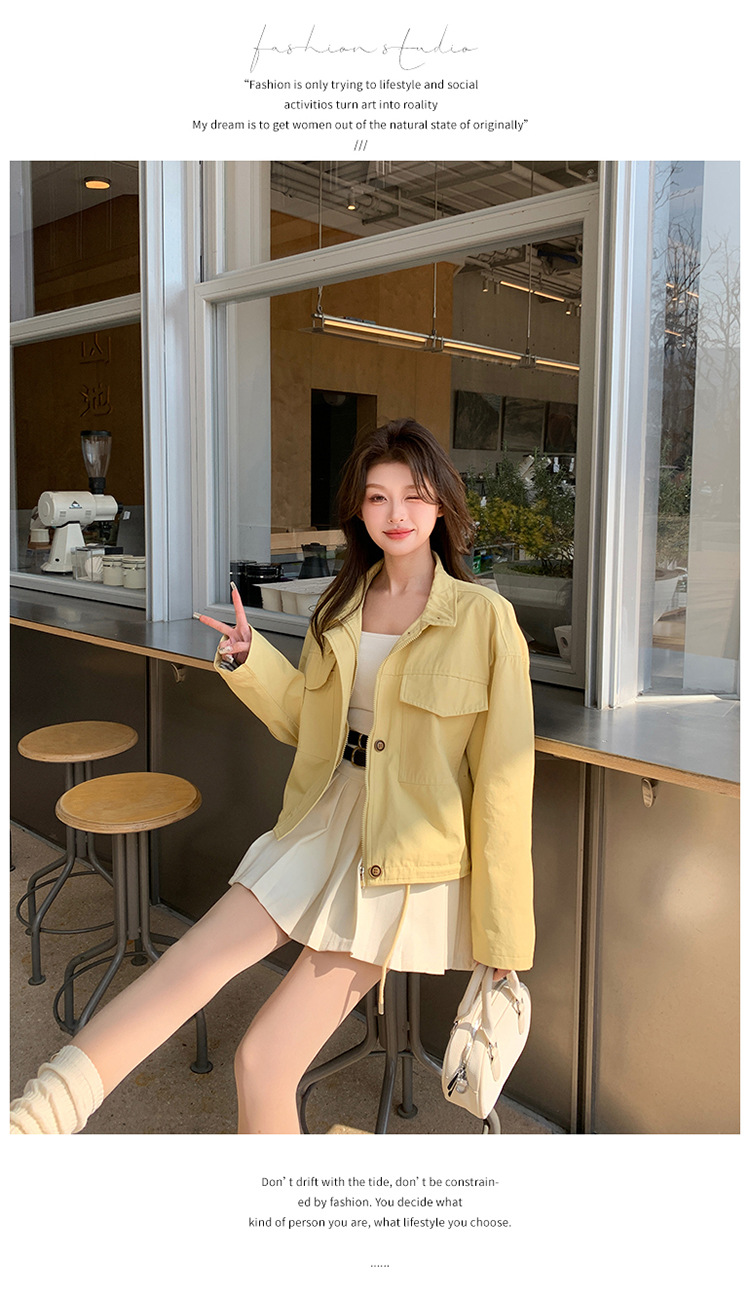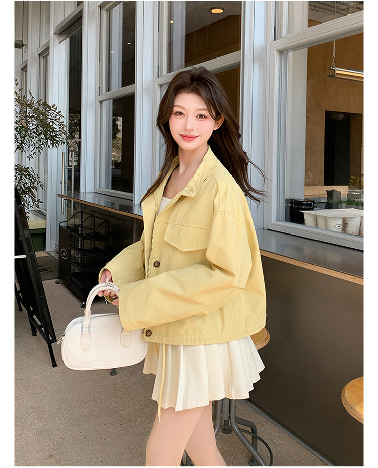 [멩메이] 25 봄 메이파 노란색 한국 캐주얼 스트라이프 바느질 칼라코트 여성 유행 서양식 쇼트 재킷