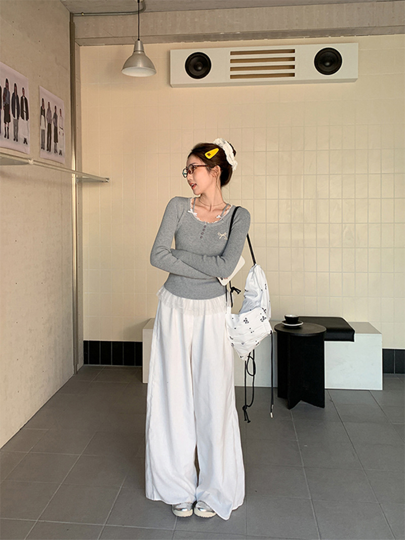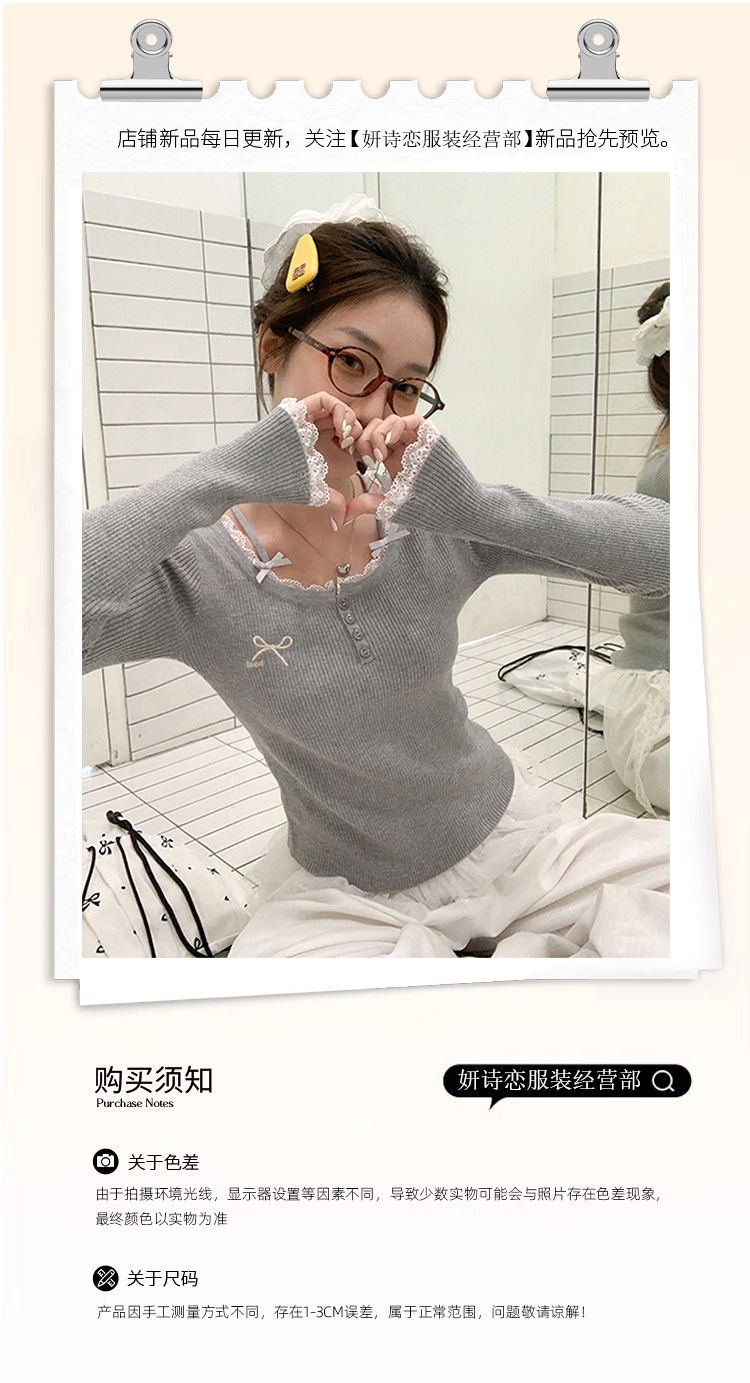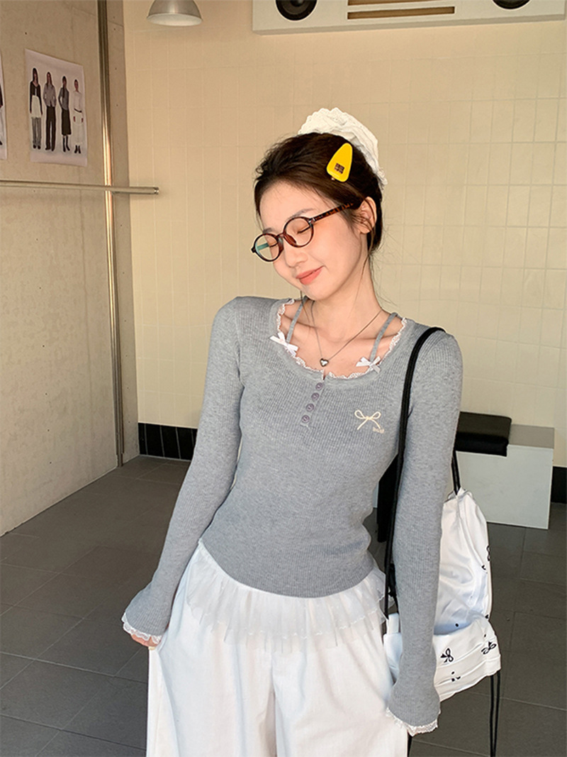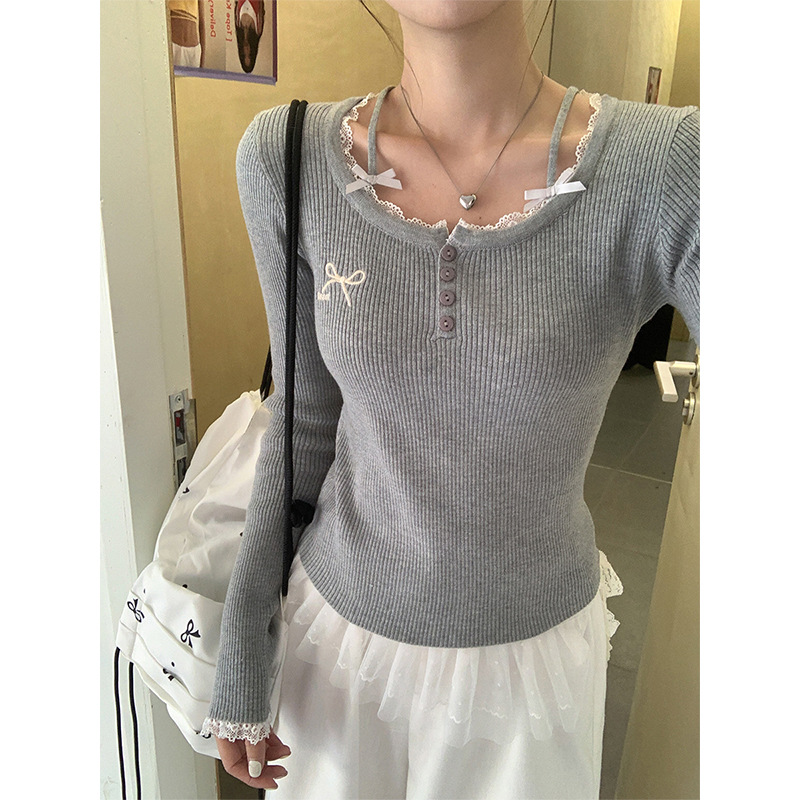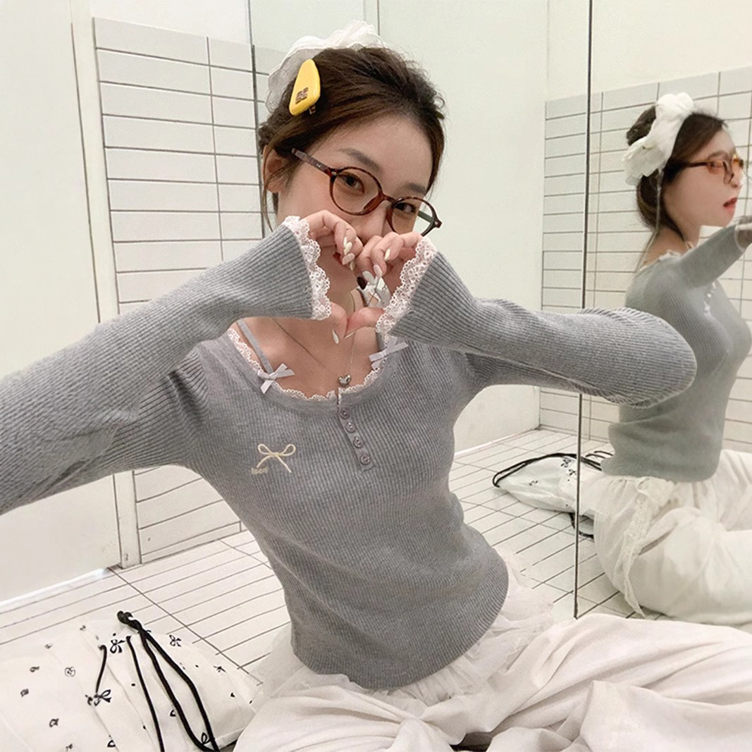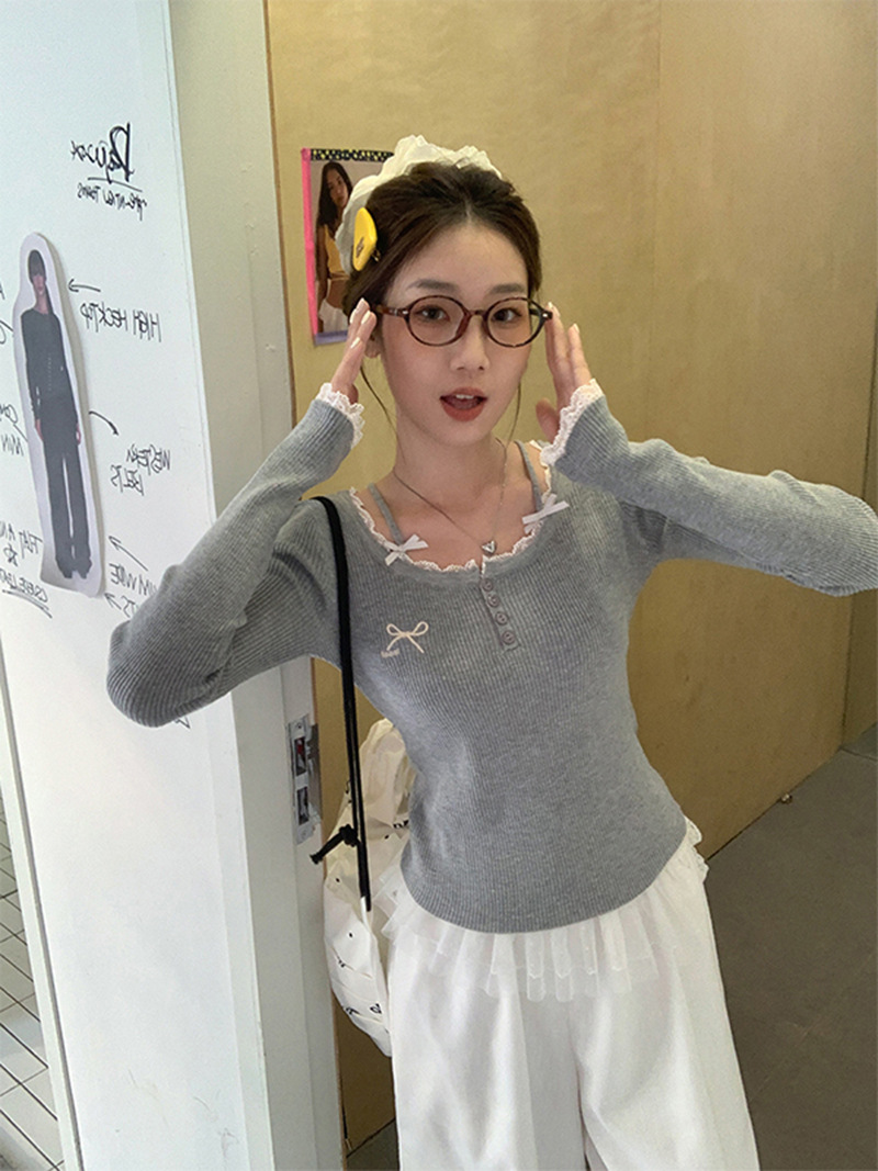 부드러운 달콤한 스타일 레이스 긴팔 티셔츠 여성용 봄 새로운 한국 스타일 슬림 핏 슬림 핏 그레이 탑스토어 가기