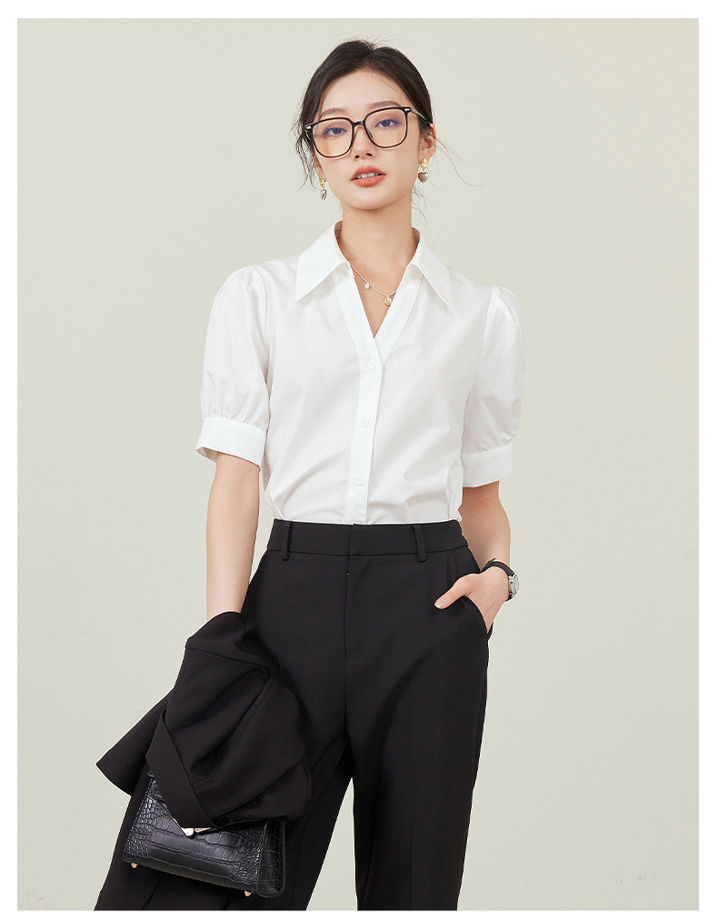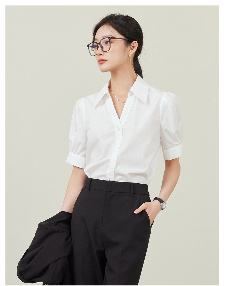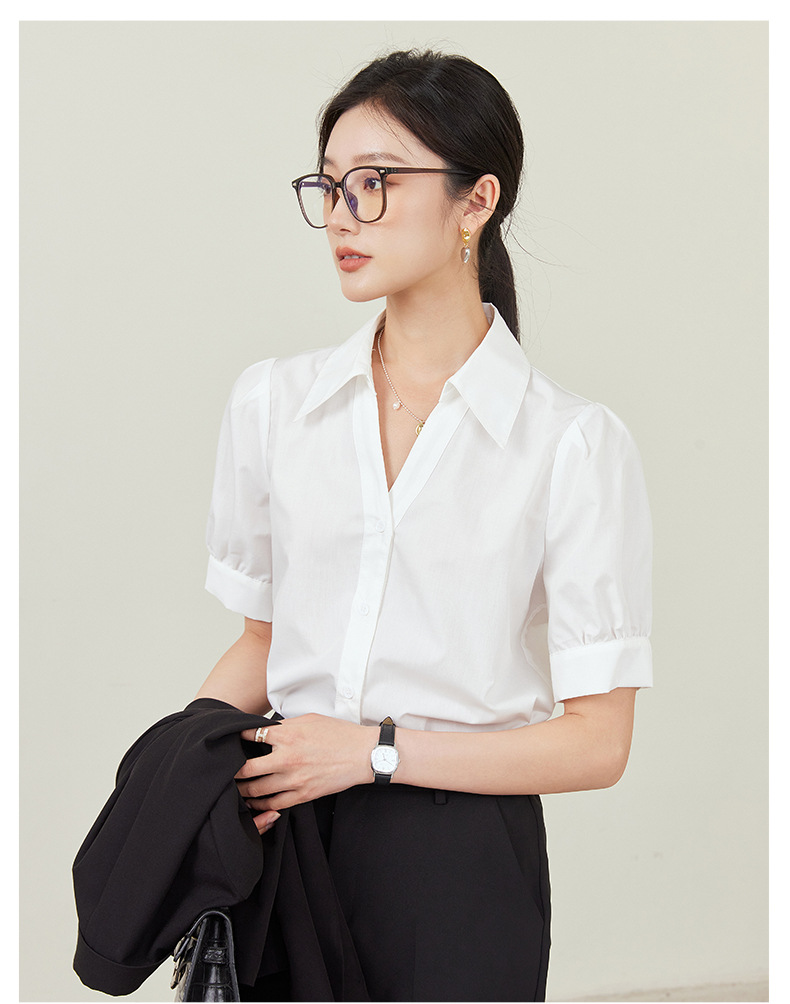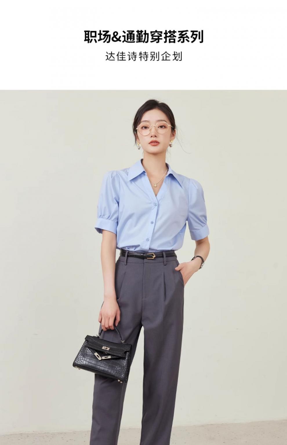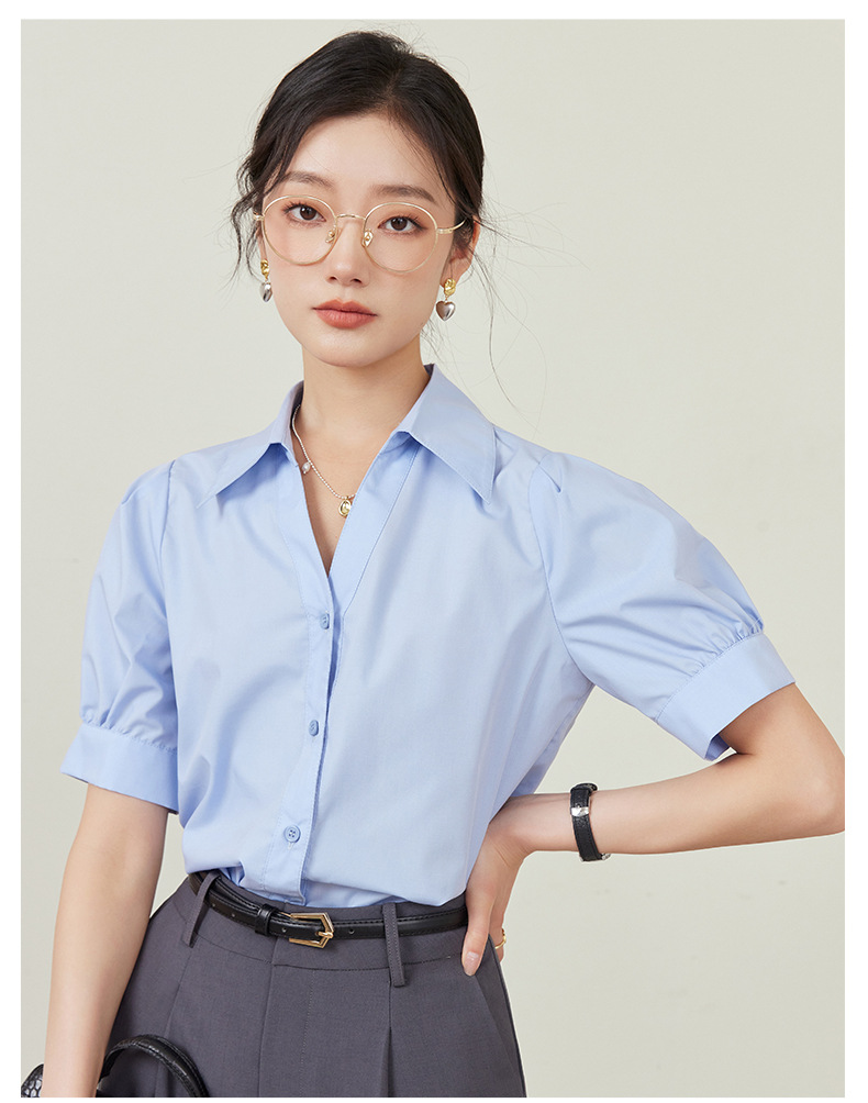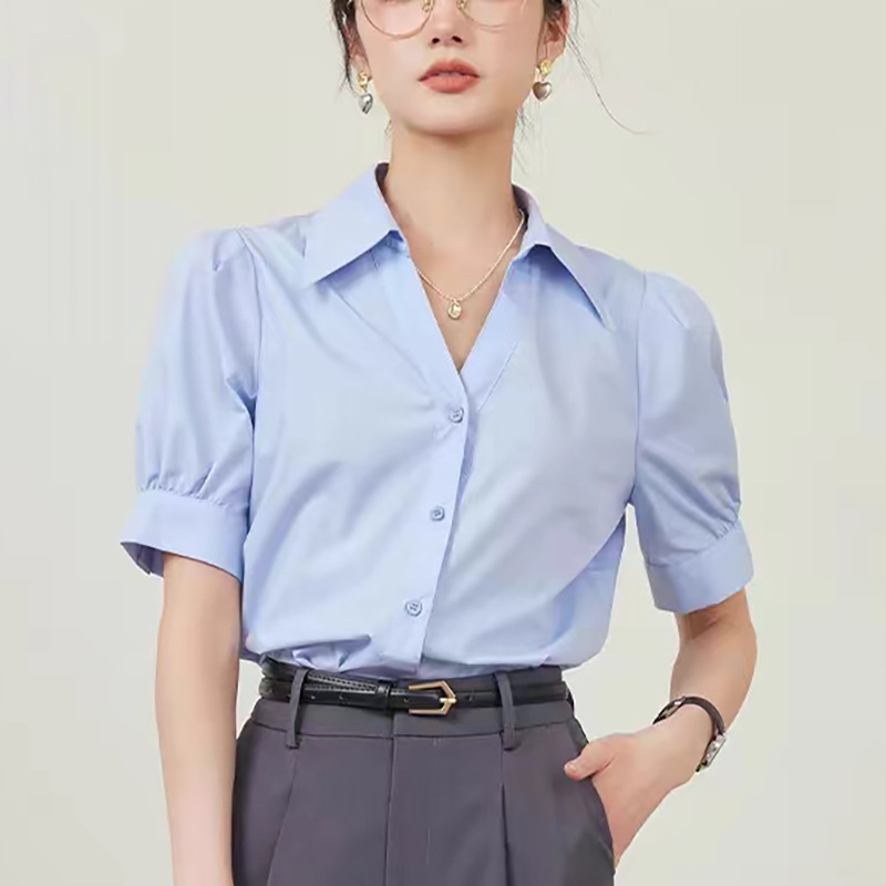 네티드 블루 반팔 셔츠 여성 여름 브이넥 디자인 센스 니쉬 작은 커리어 통근 인터뷰 셔츠스토어 가기