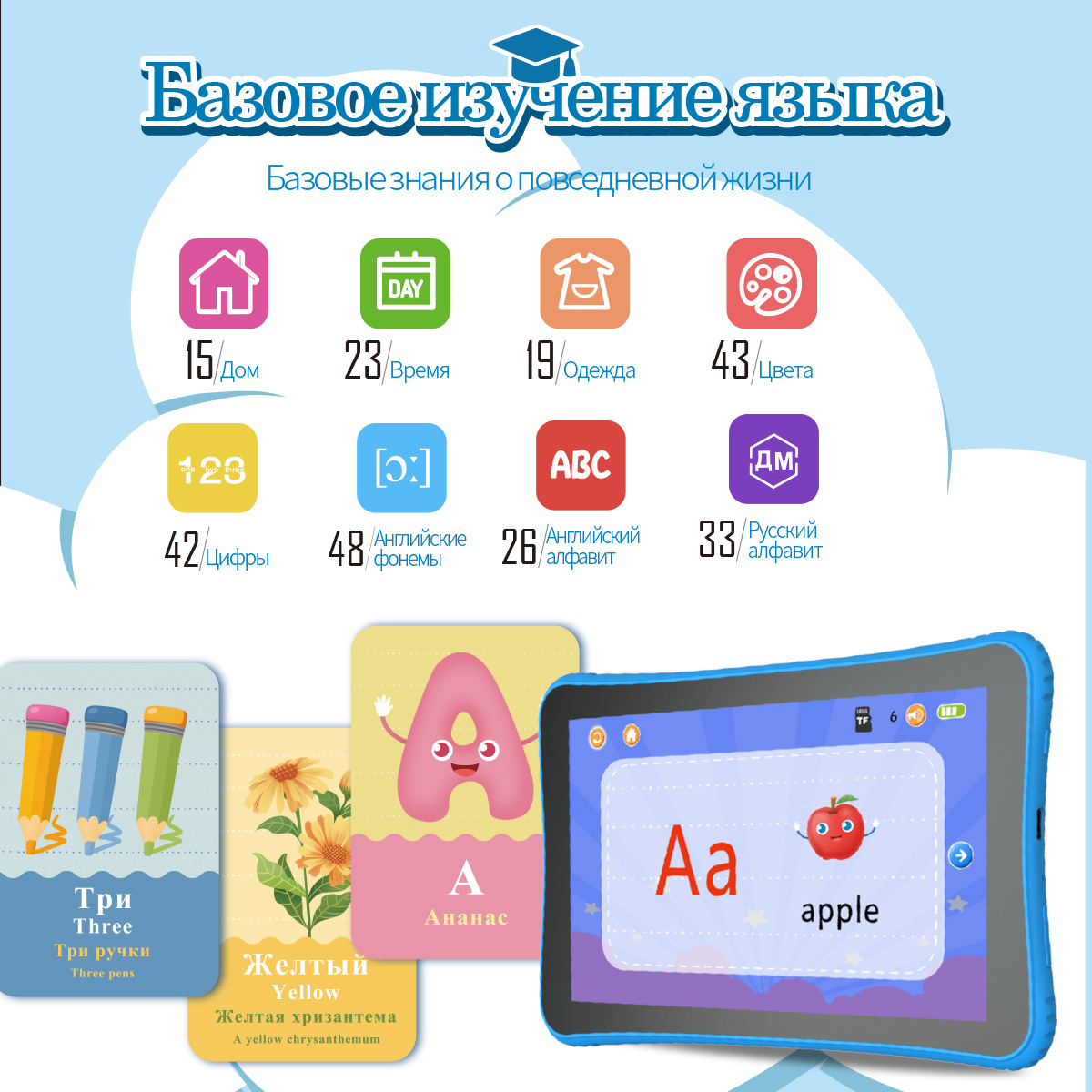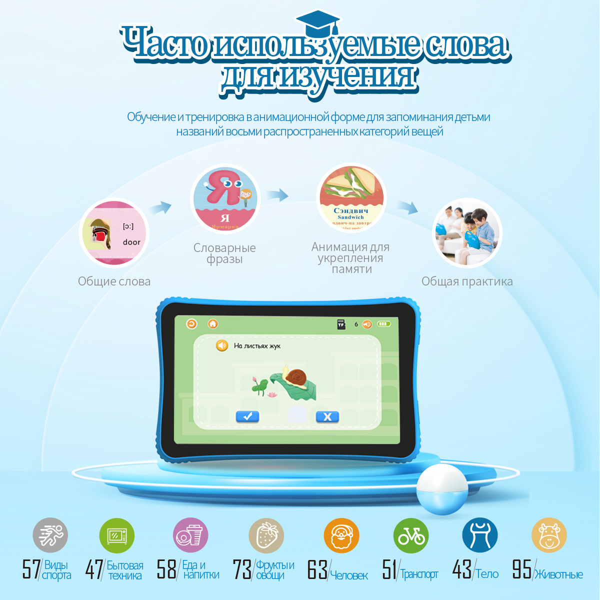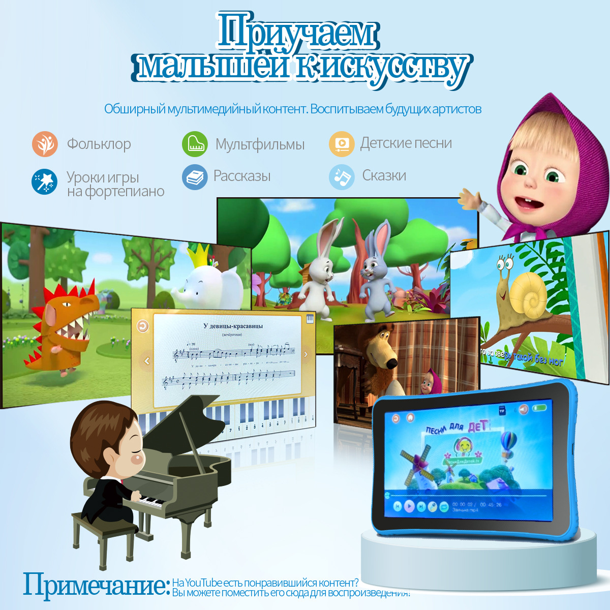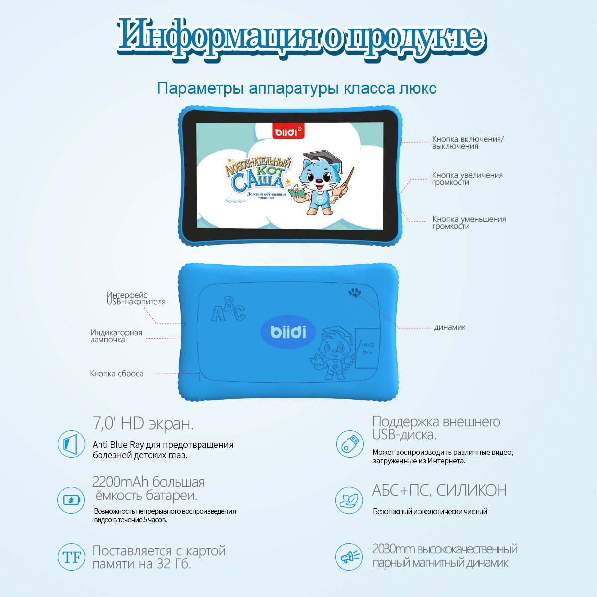 儿童平板电脑早教机玩具“猫萨沙”-最好的礼物给未来的明星。这款儿童平板电脑早教机是为3至8岁的儿童设计和设计的。早教机已经下载了内容,家长可以在收到后立即使用所有功能,而无需下载任何软件。萨沙猫到底在做什么?1-玩具发展音乐听力,创造力和表演技巧,使其成为家庭聚会的绝佳帮手。2、丰富的多媒体内容。猫萨沙预先加载了大量的资源。包括:故事,儿童歌曲,故事,卡通等等。家长还可以下载自己喜欢的歌曲、故事和卡通。3-你的孩子将能够学习俄语字母、单词、数字、颜色等4-培养孩子的观察力,思维,比较分析和空间感知。猫萨沙可以教你的孩子识别每一个字母的书面和手写形式,并教他们以正确的顺序写作。萨沙猫使用蒙台梭利方法在15个类别中学习单词和语法:动物、交通、蔬菜和水果、运动等。与传统的卡片学习不同,卡片需要父母阅读单词,萨沙猫可以发音单词,孩子可以重复单词并自学。购买早教机相当于购买20多套包含1000多个主题的学习卡。猫萨沙是一个视频播放器,互动电子钢琴。猫萨沙有许多其他功能,这个儿童发育玩具会给孩子和父母带来很多快乐!送给男孩和女孩新年、生日、儿童节的好礼物