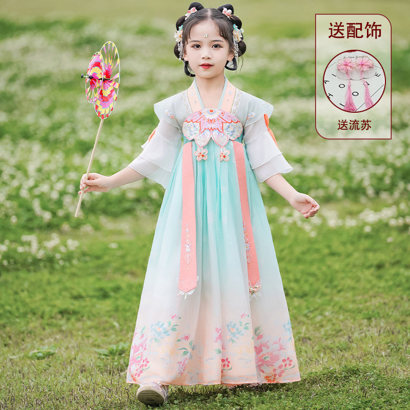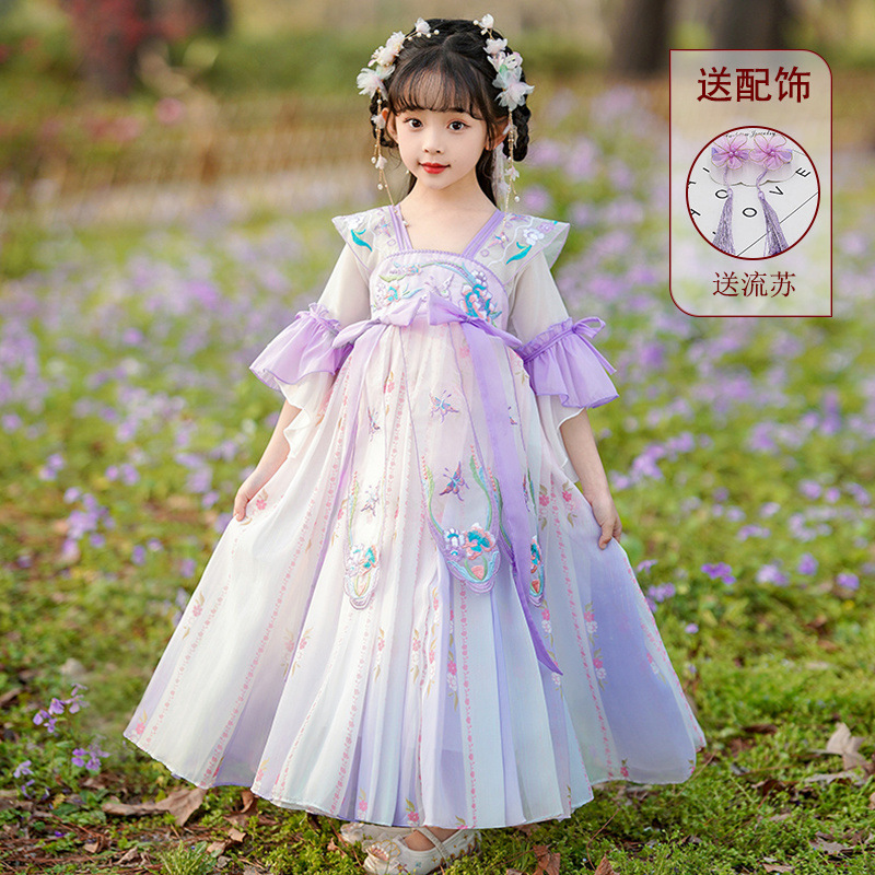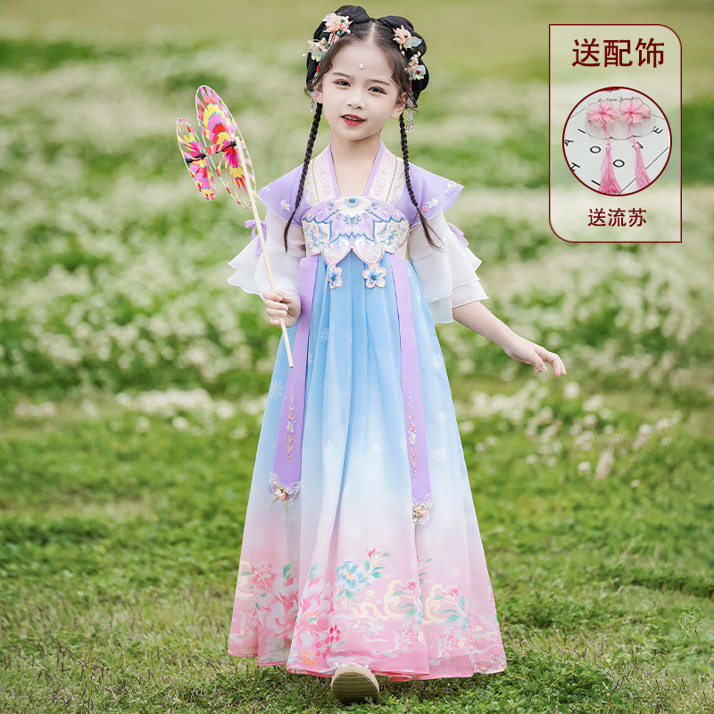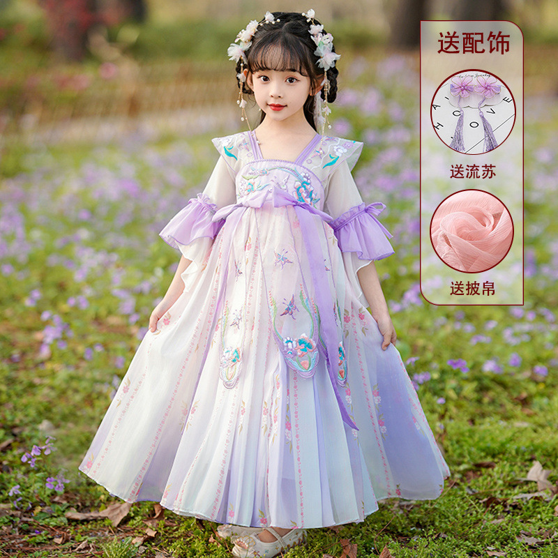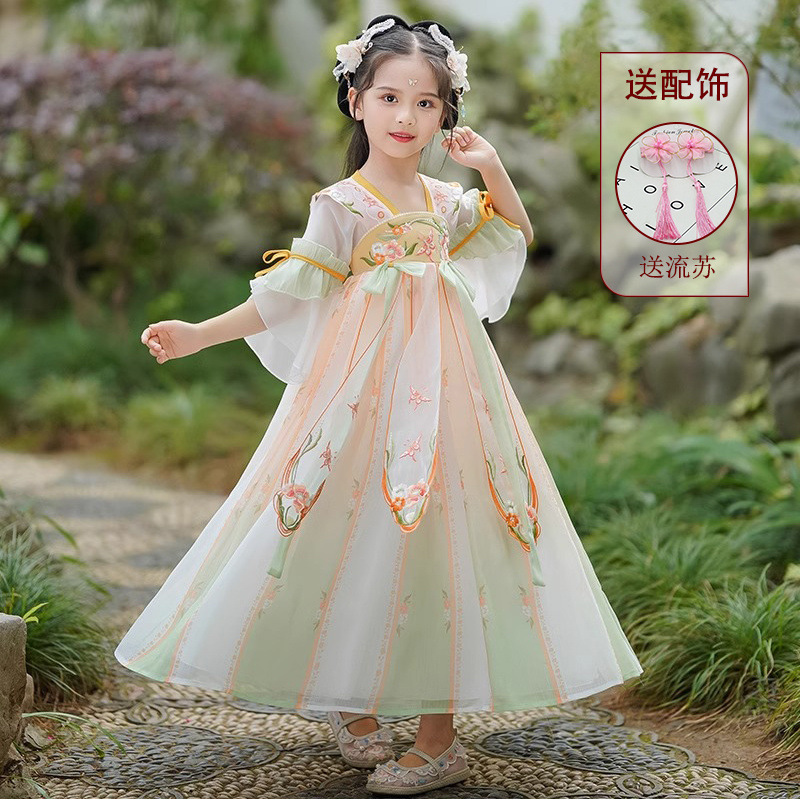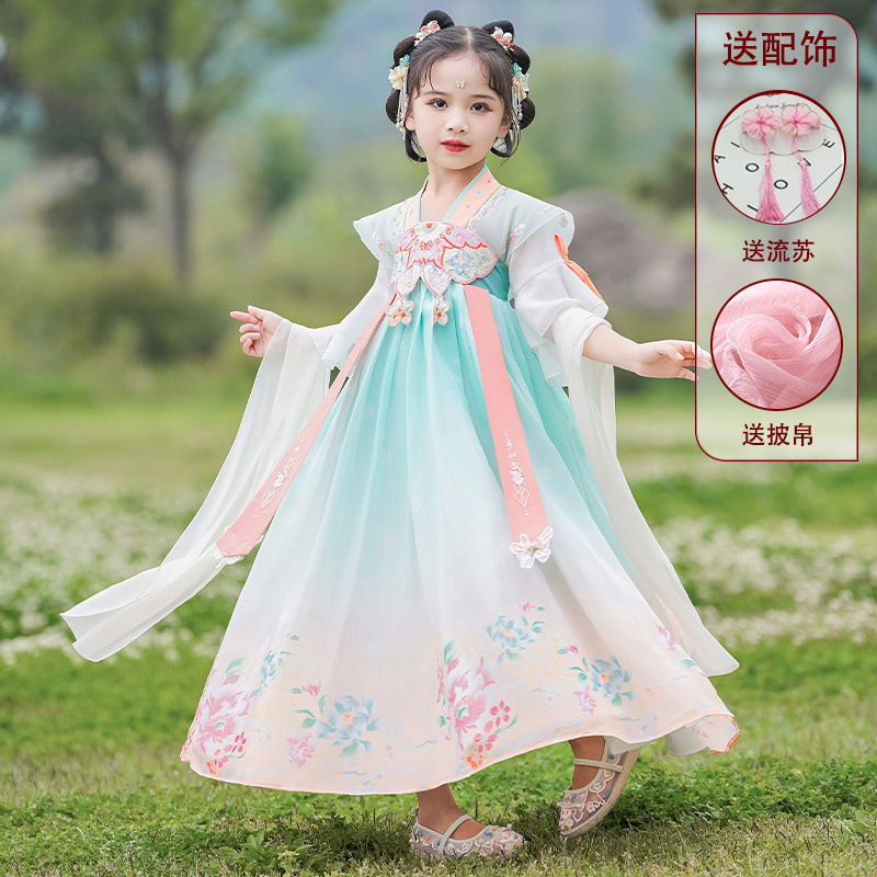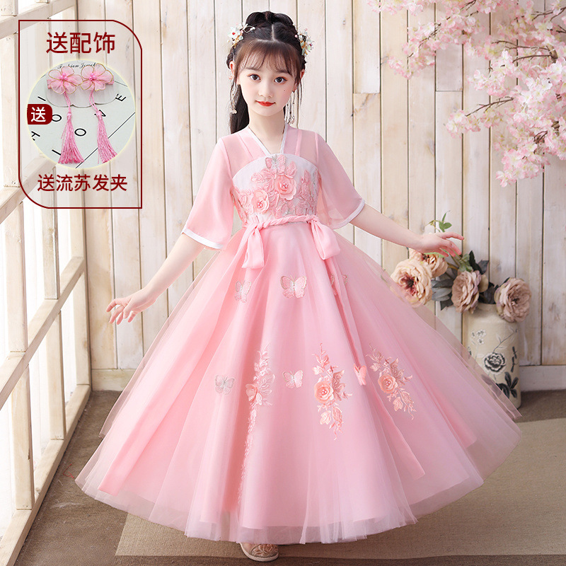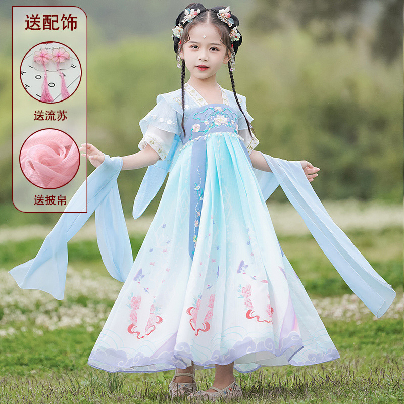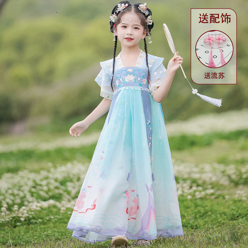 한푸 소녀 여름 중국 스타일 어린이 고대 스타일 슈퍼 불멸의 소녀 원피스 여름 당나라 세트 여성의 고대 원피스