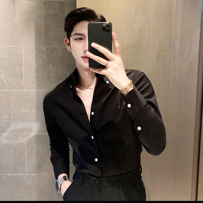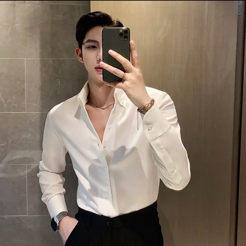 프랑스 브이넥 화이트 셔츠 남성용 긴팔 봄과 가을 성숙한 꾸준한 남성 비즈니스 원피스 캐주얼 슬림 셔츠스토어 가기