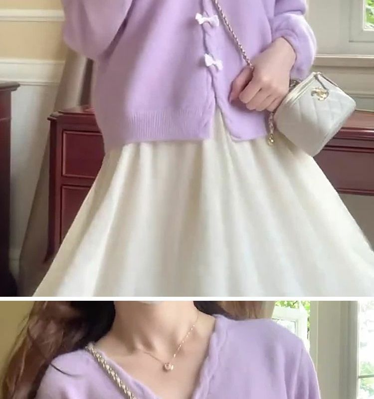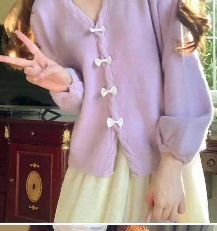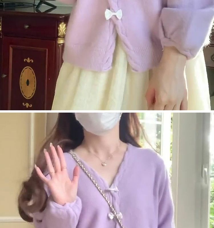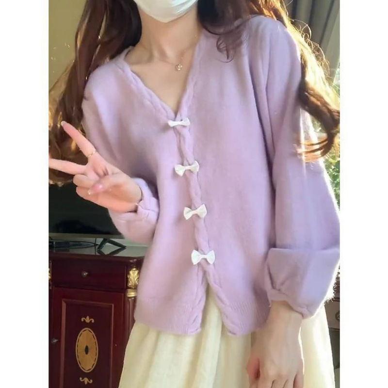 보라색 V 넥 니트 카디건 여성 봄 외부 얇은 스웨터 코트 부드러운 왁스스토어 가기