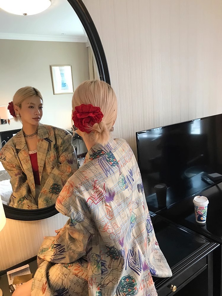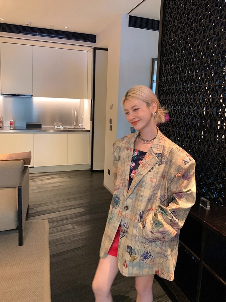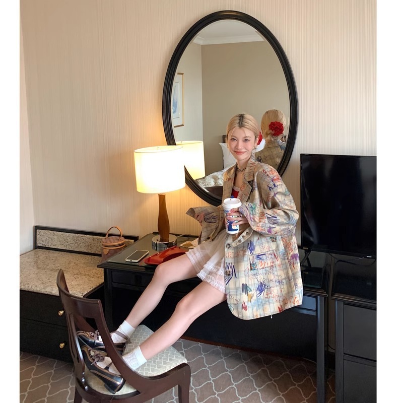 틈새 낙서 격자 무늬 인쇄 세트 2025 새로운 재킷 여성 봄 어깨 패드 느슨한 캐주얼 중간 길이 세트스토어 가기