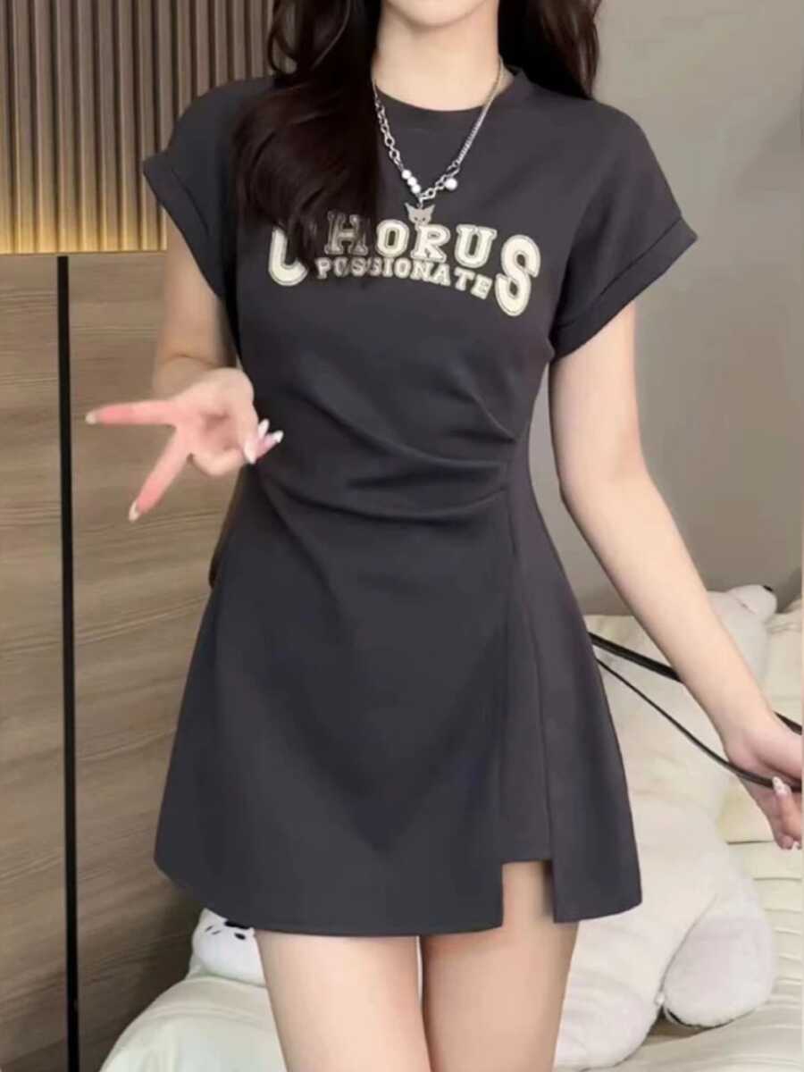 Xiaofei 소매 짧은 치마 여자 여름 플러스 사이즈 통통한 틈새 타이트 허리 주름 원피스 슬리밍 크루 넥 티셔츠 스커트스토어 가기
