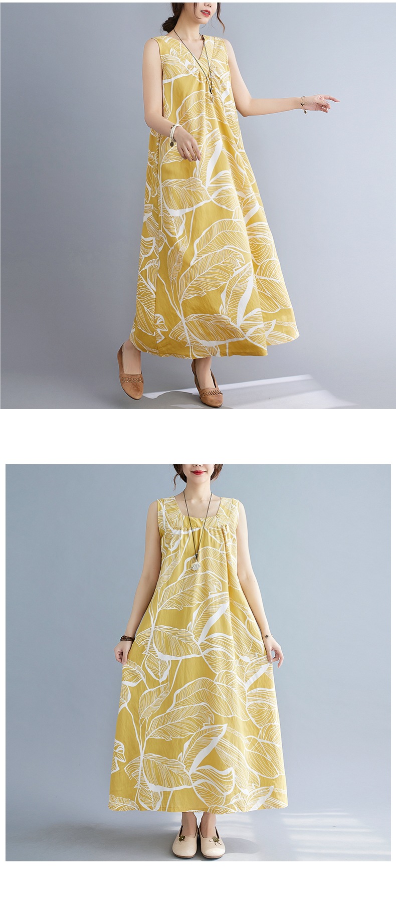 느슨한 플러스 사이즈 외국식 나이를 줄이는 잎 인쇄의 실제 샷 한국어 버전 긴 무릎 앞뒤 원피스