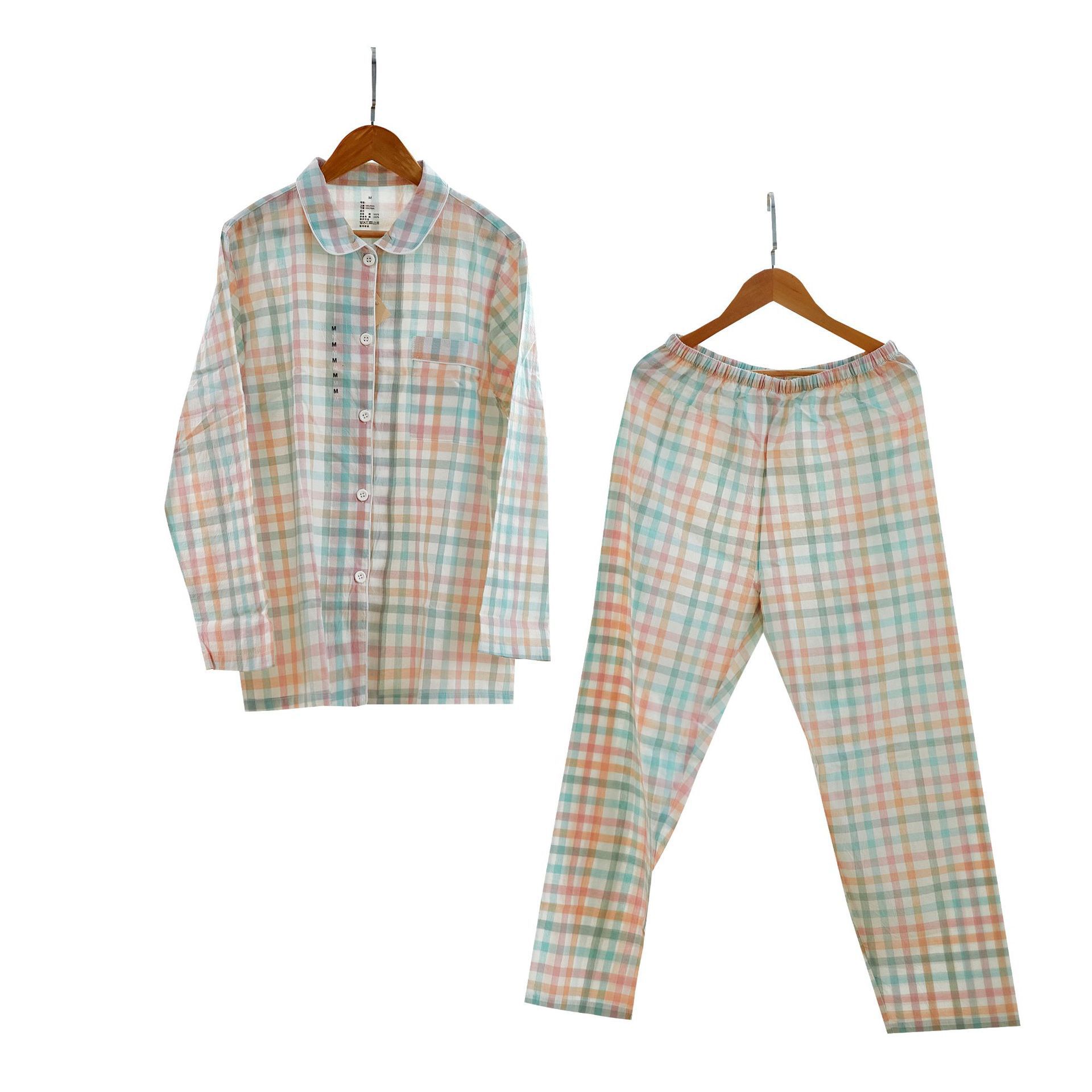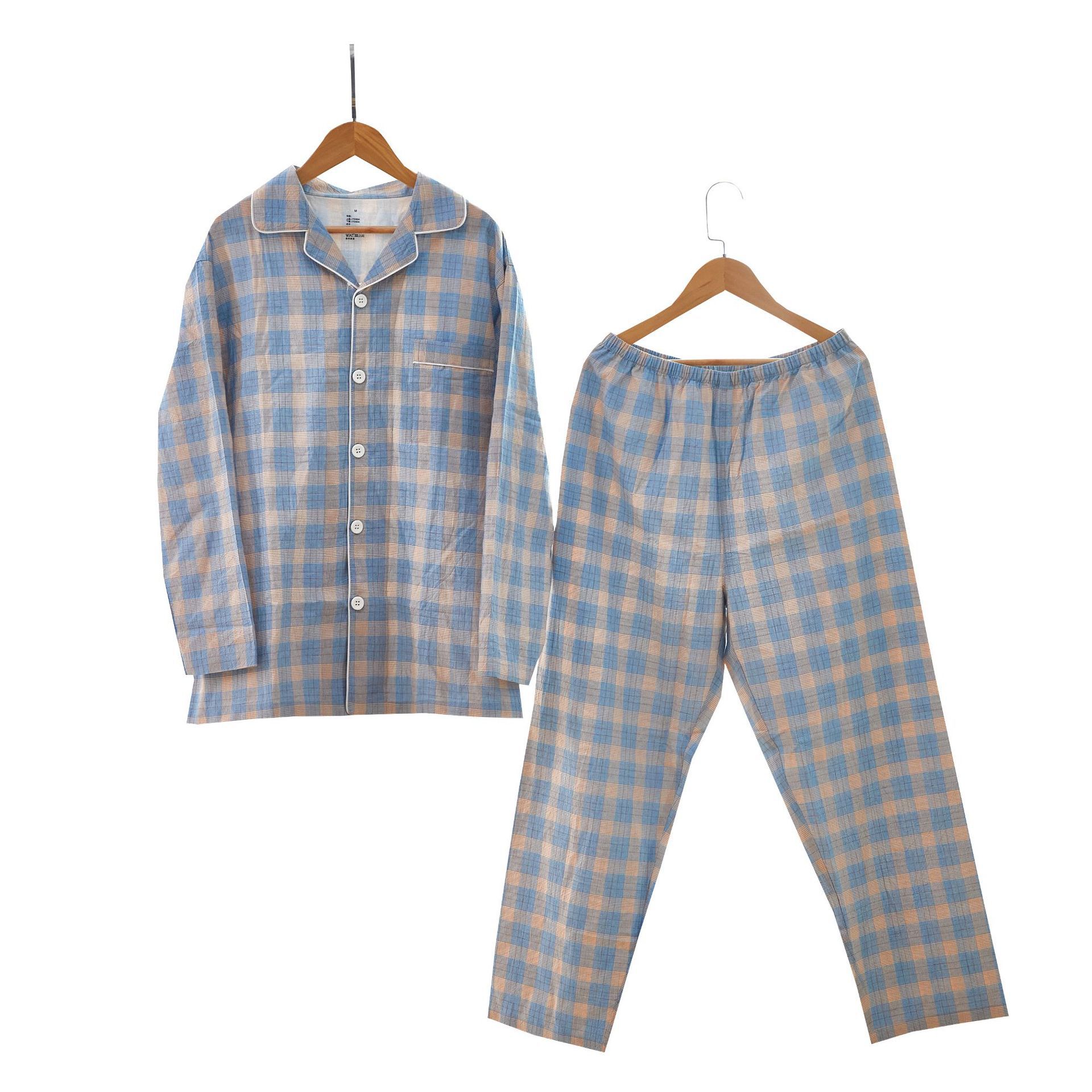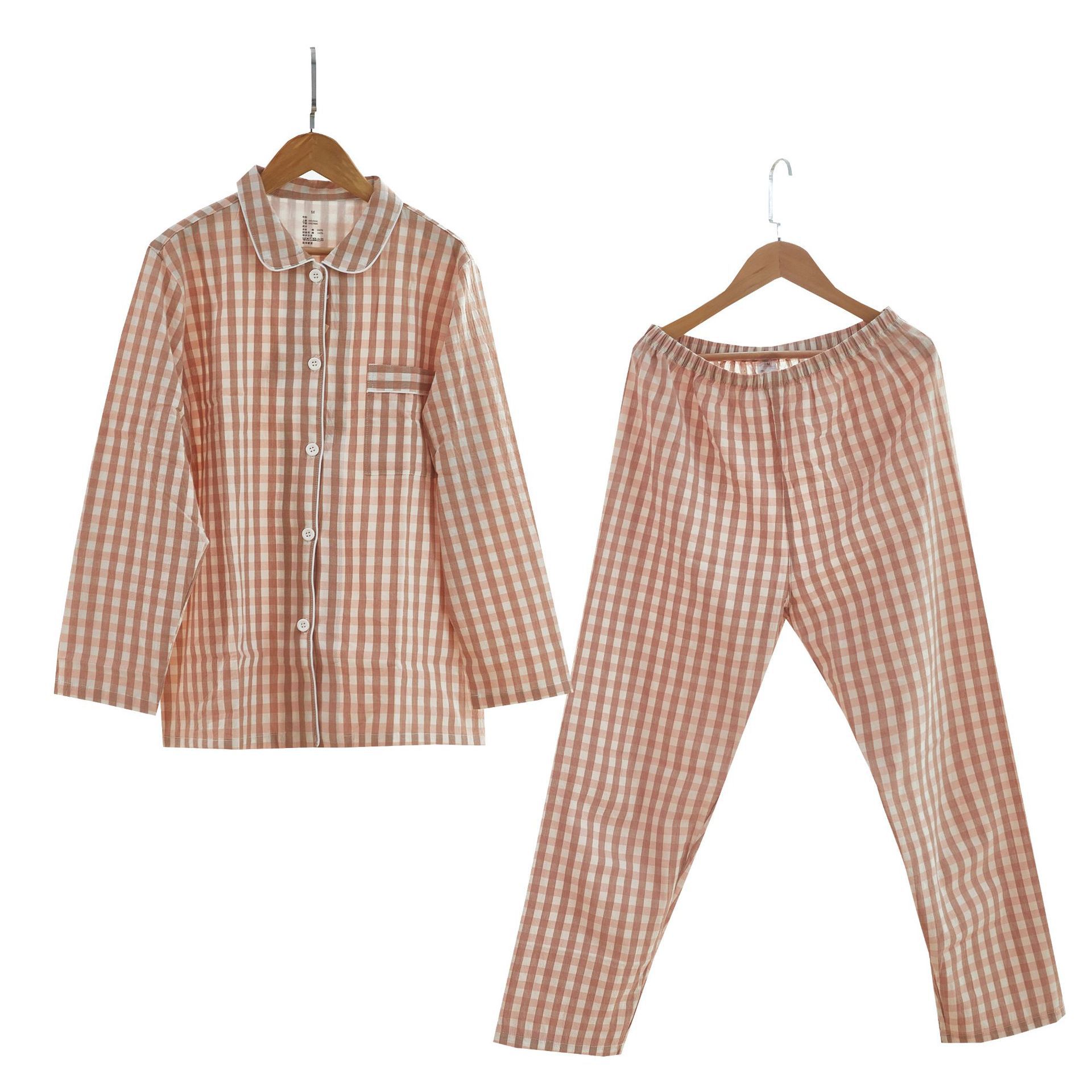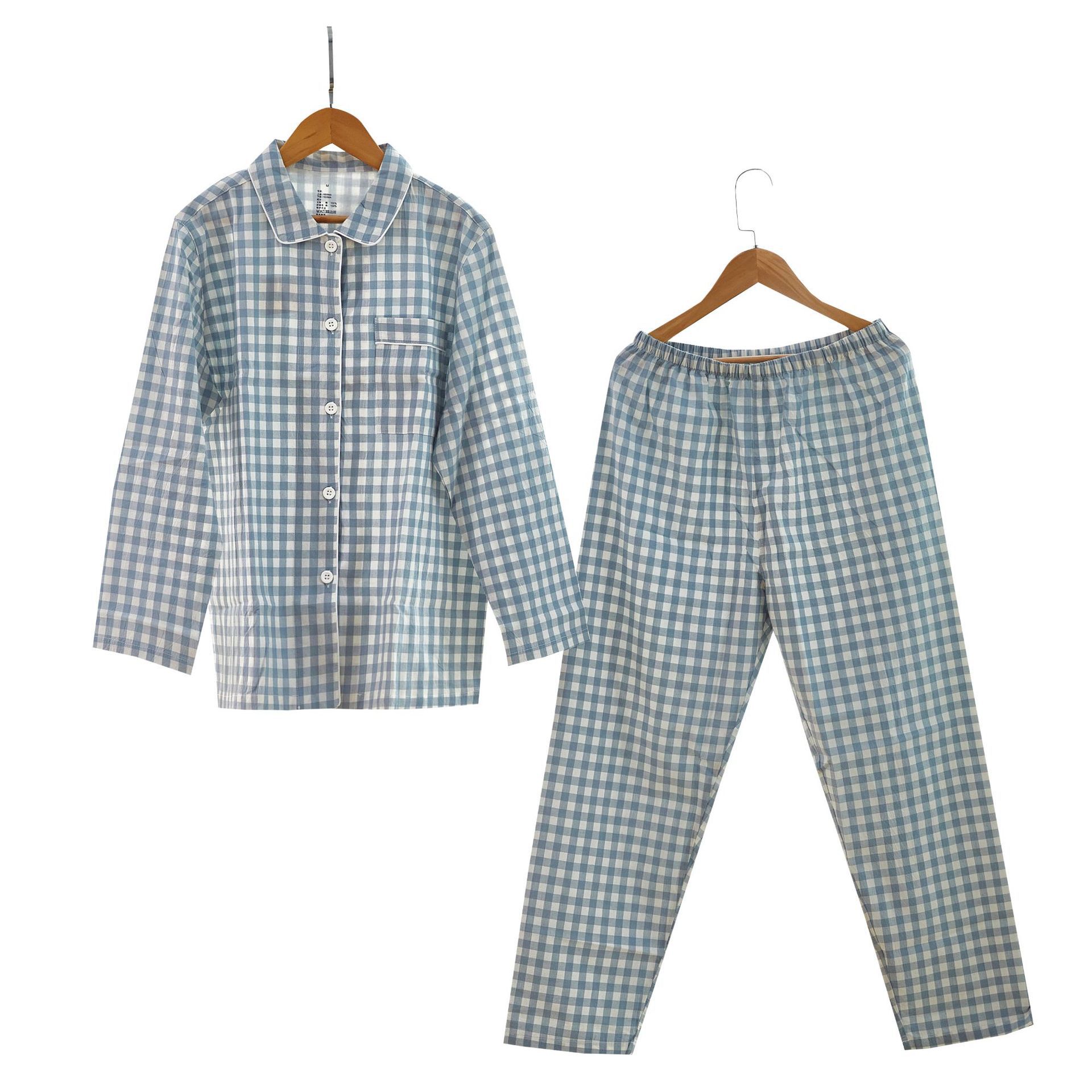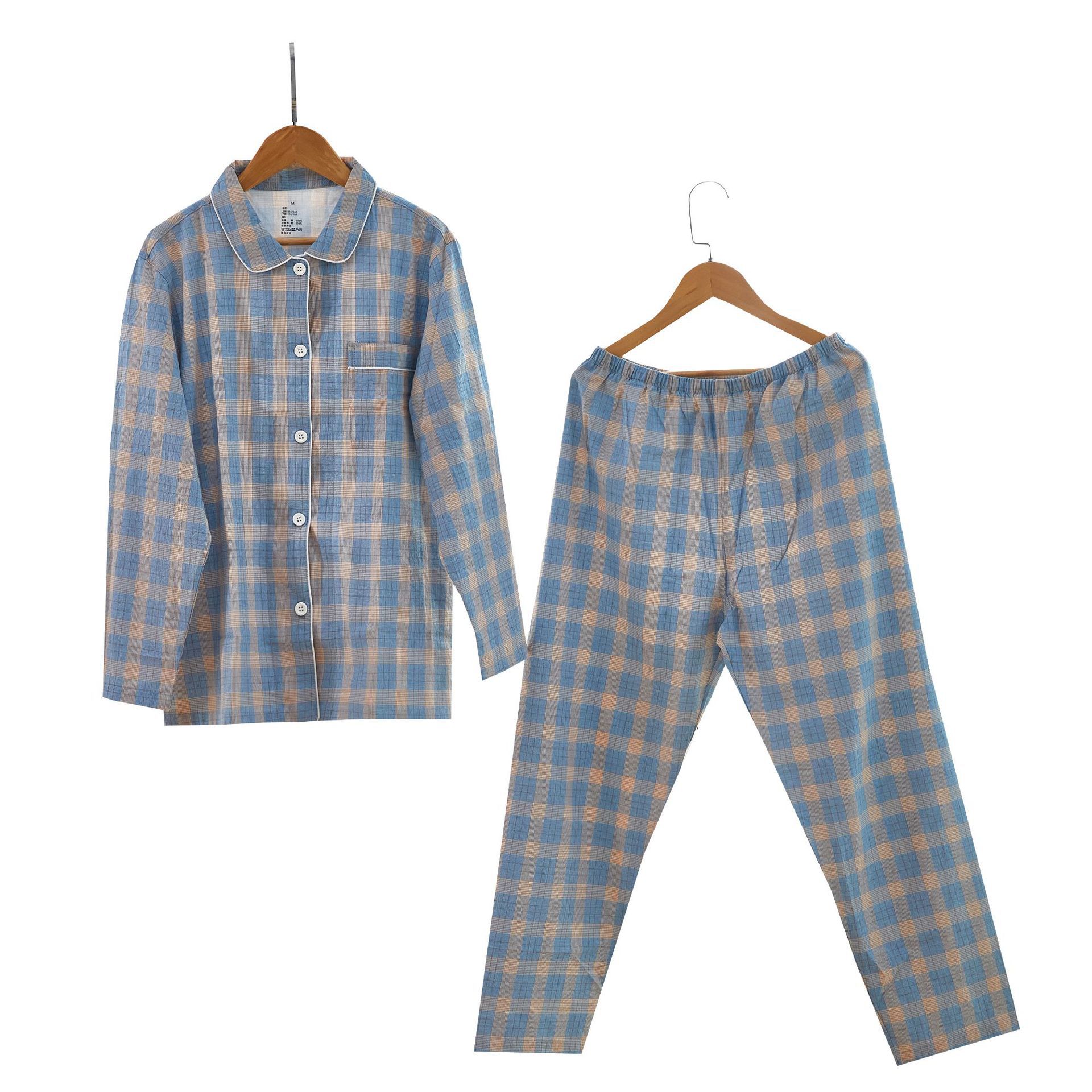 모든 면 잠옷 홈 옷 무지 긴 소매 여성 잠옷 일본 스타일 좋은 격자 무늬 커플 바지 홈 의류 세트