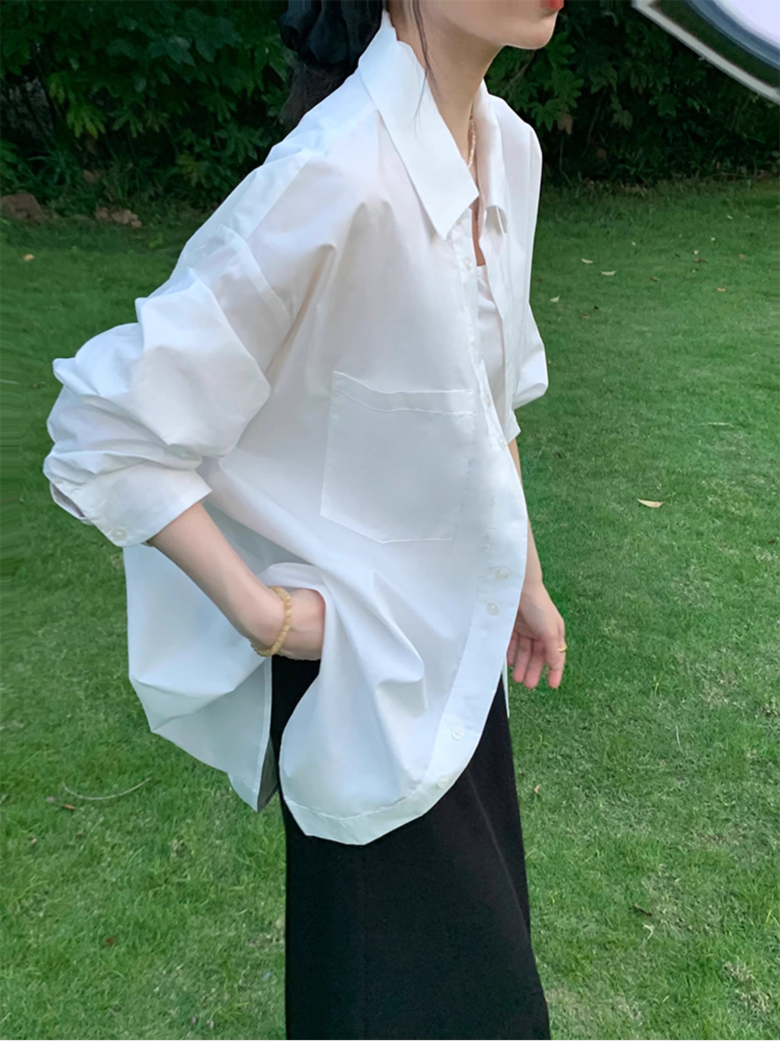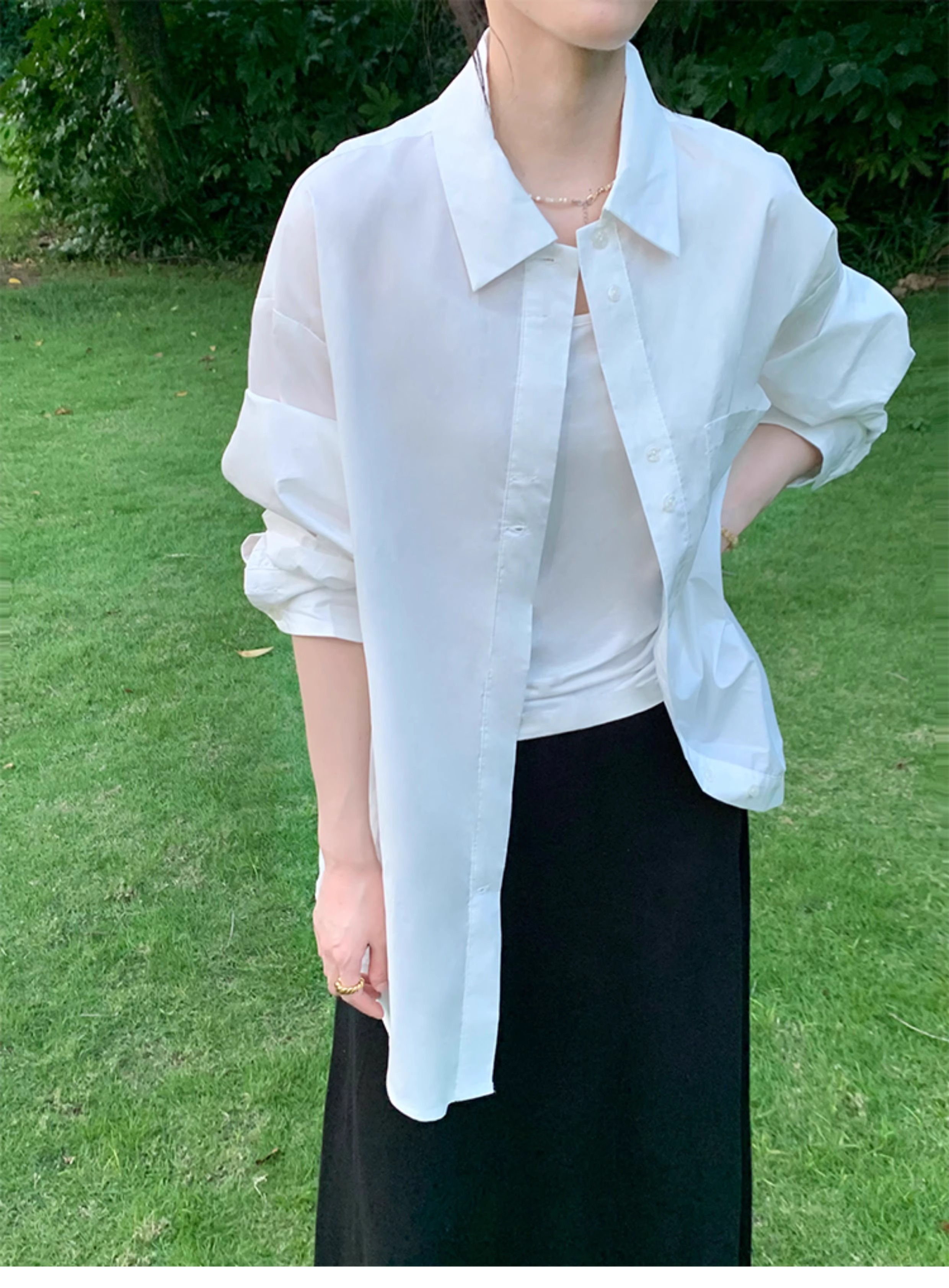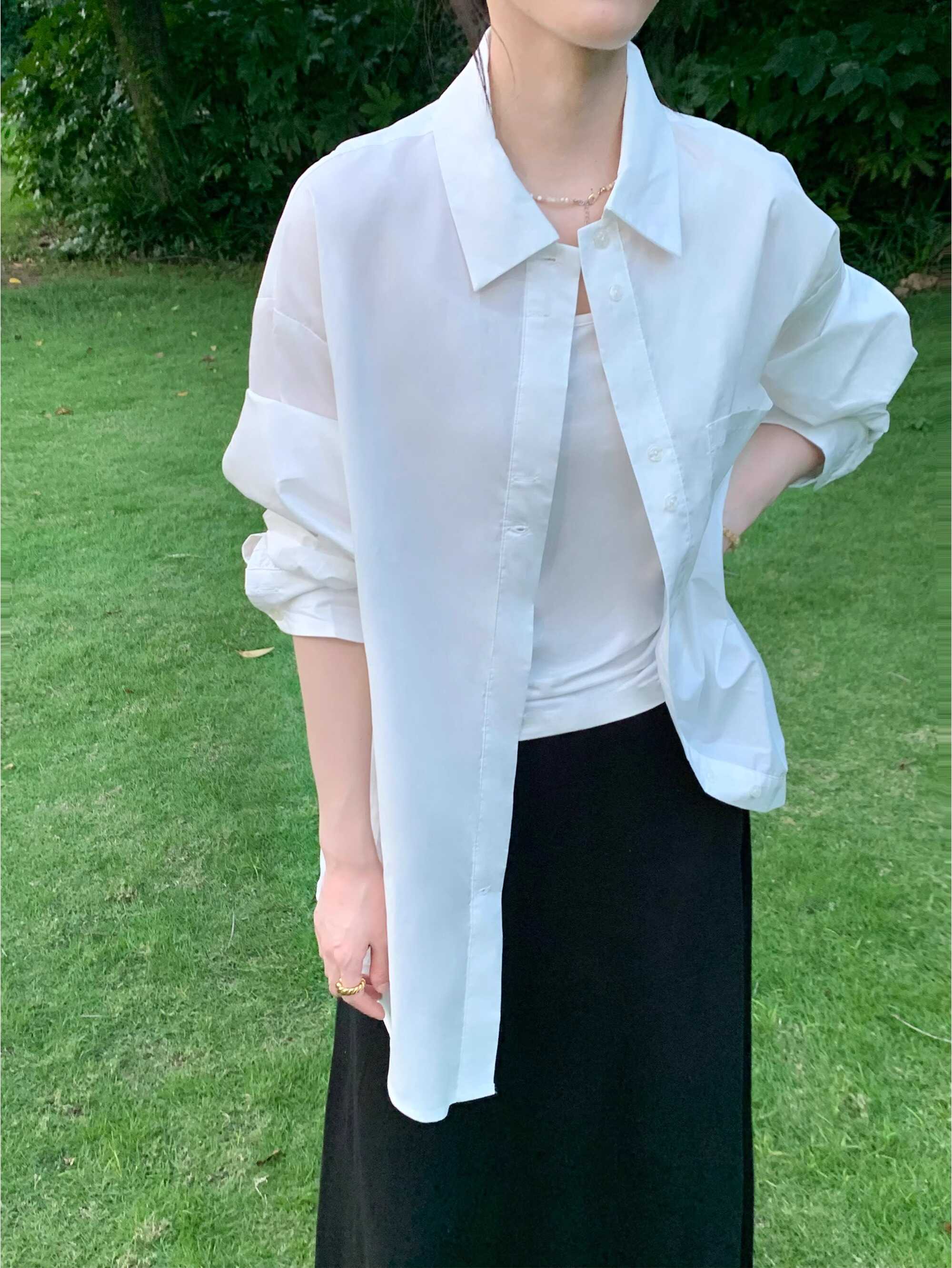 흰색 긴팔 셔츠 여성용 코트 카디건 외부 디자인 틈새 캐주얼 게으른 스타일 얇은 느슨한