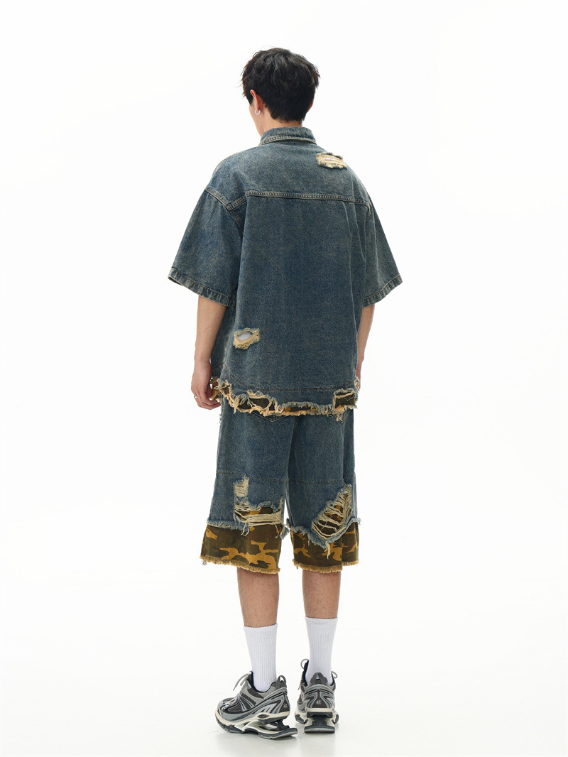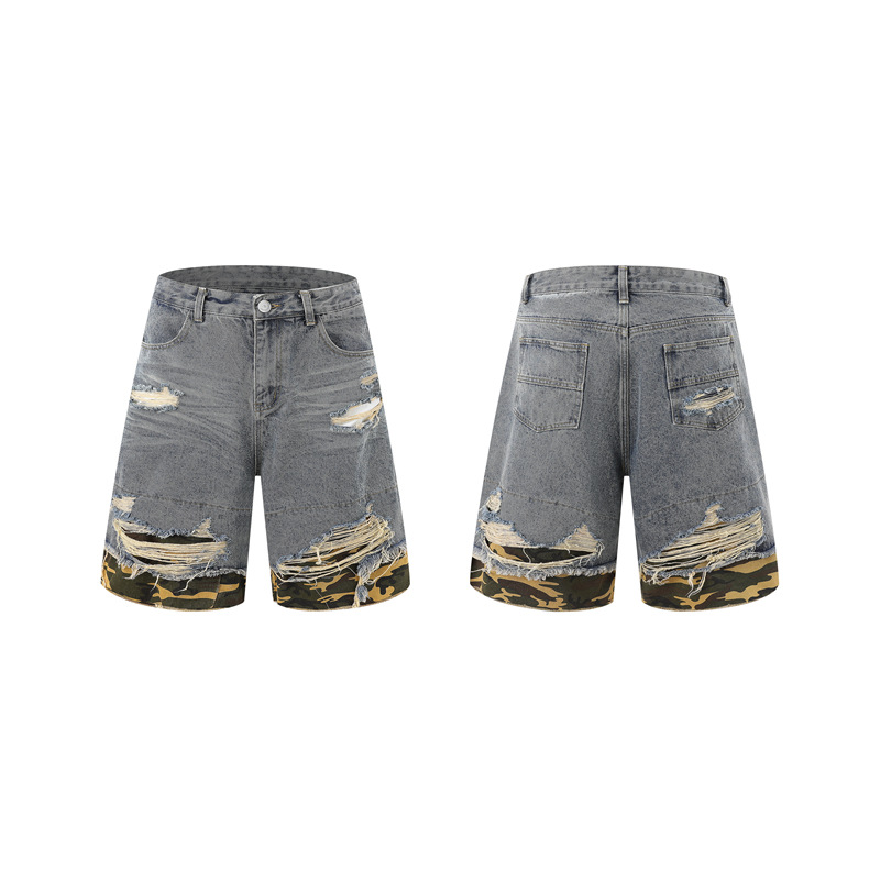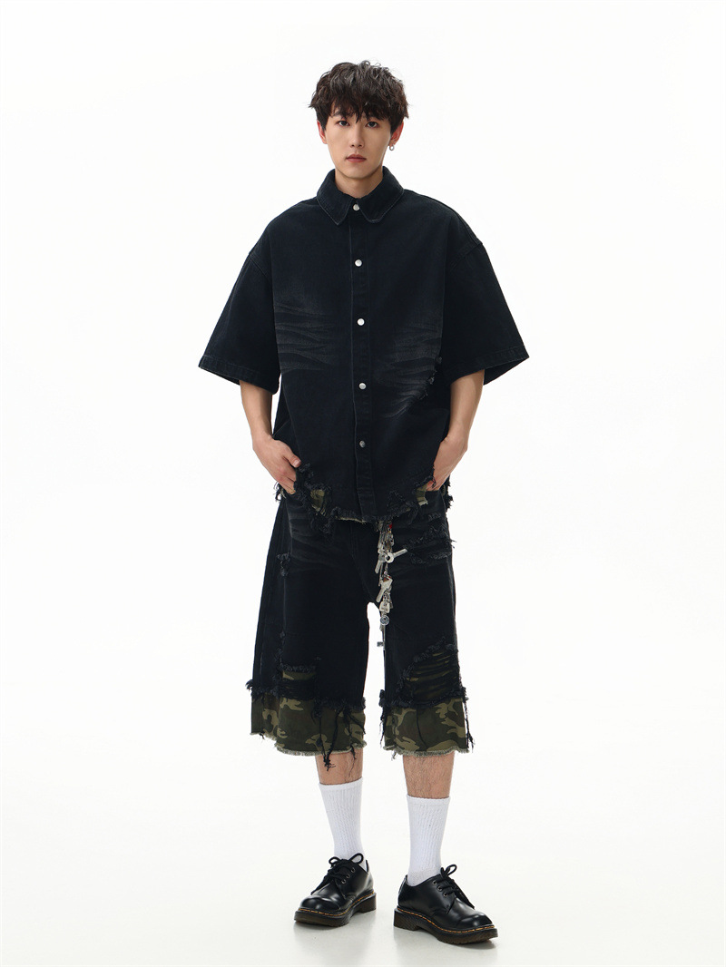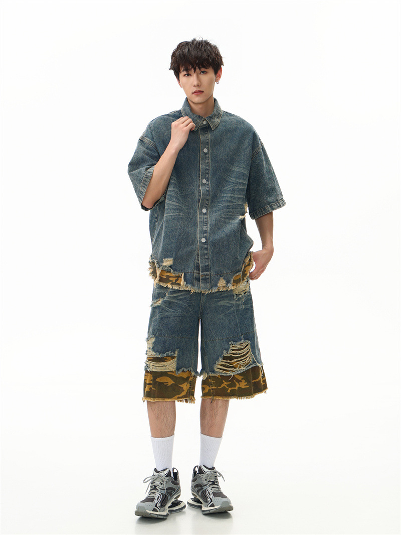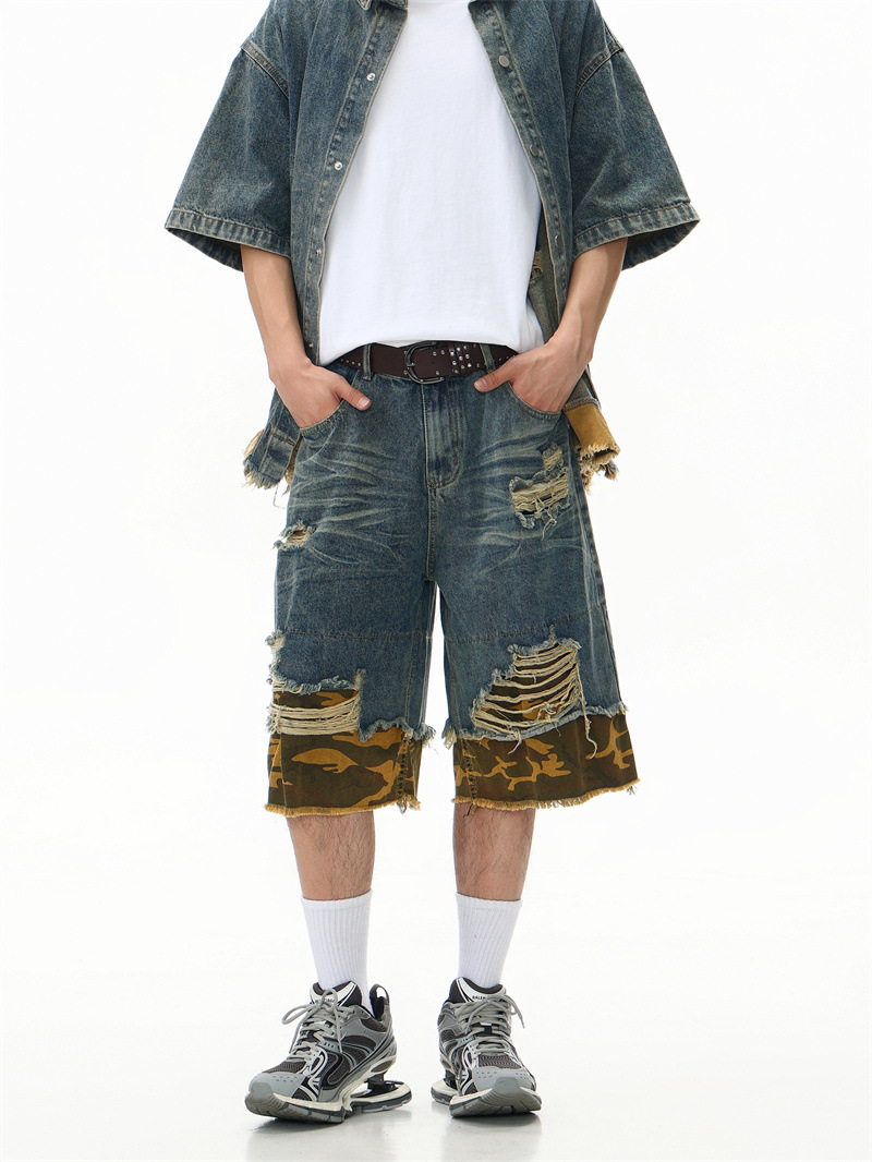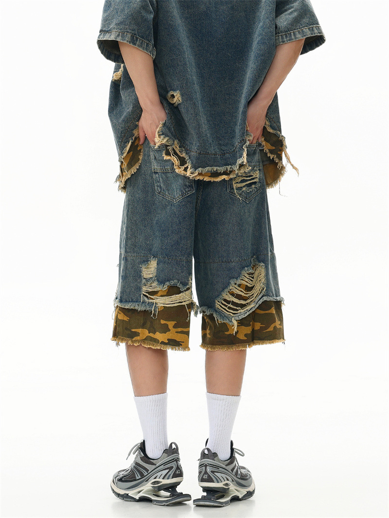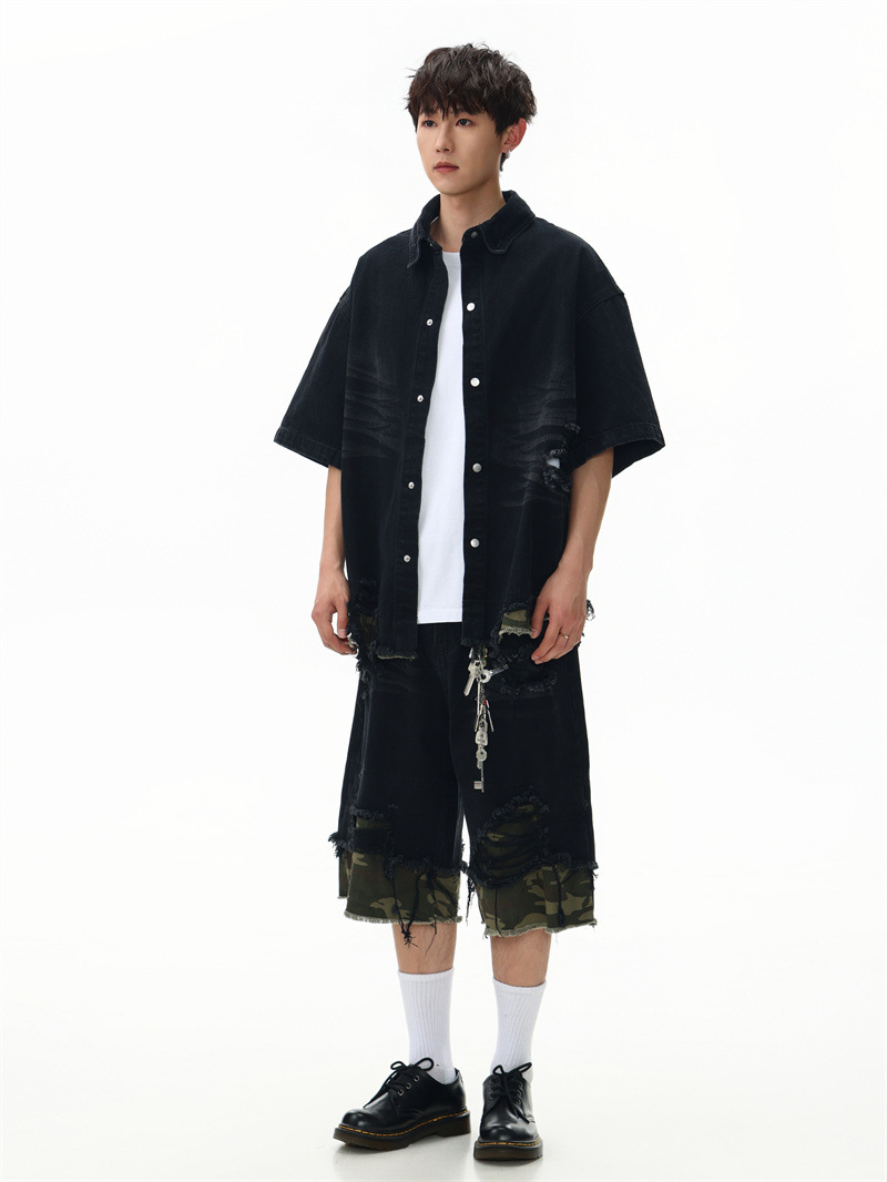트렌디 한 브랜드 컷 엣지 스티칭 레오파드 무늬 데님 반팔 남성 캐주얼 5 점 데님 옷 느슨한 반소매 일본 데님 반바지