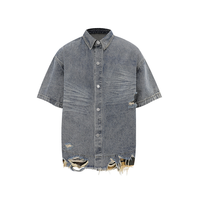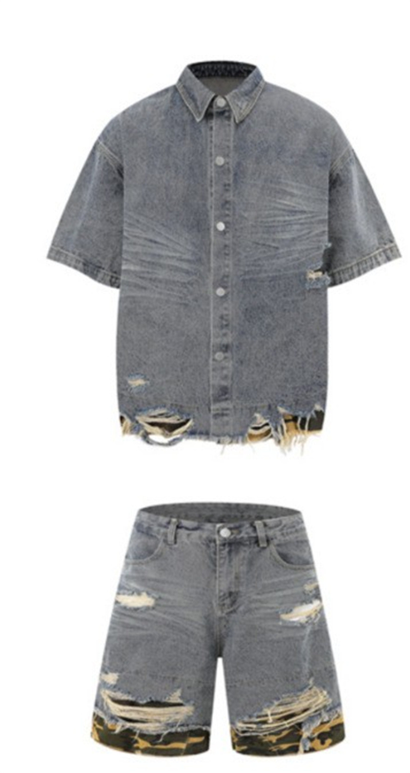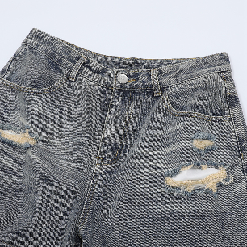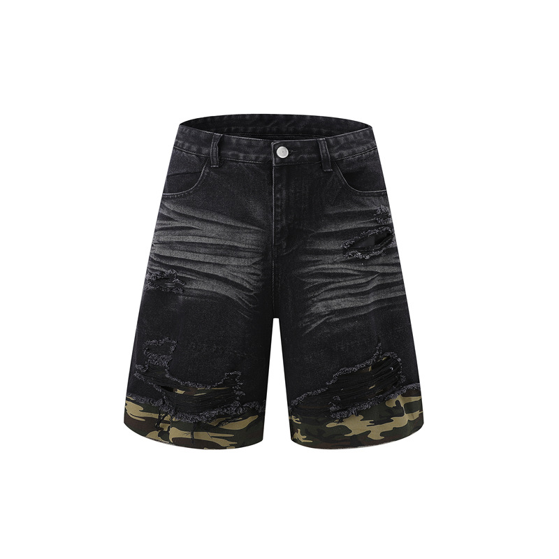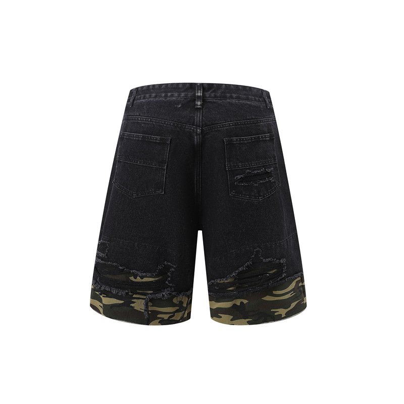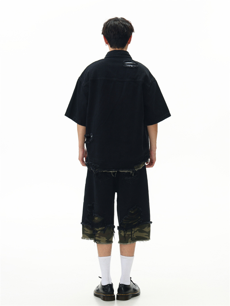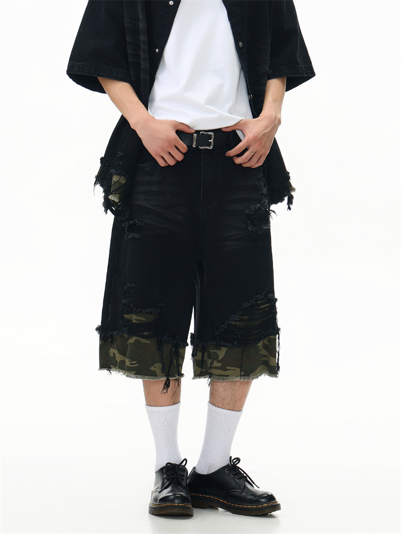 트렌디 한 브랜드 컷 엣지 스티칭 레오파드 무늬 데님 반팔 남성 캐주얼 5 점 데님 옷 느슨한 반소매 일본 데님 반바지