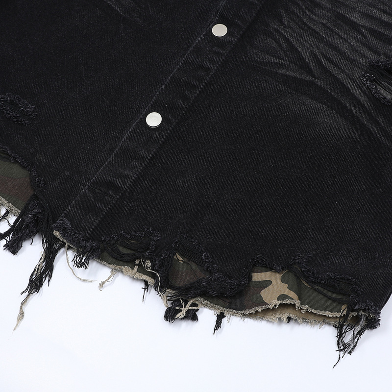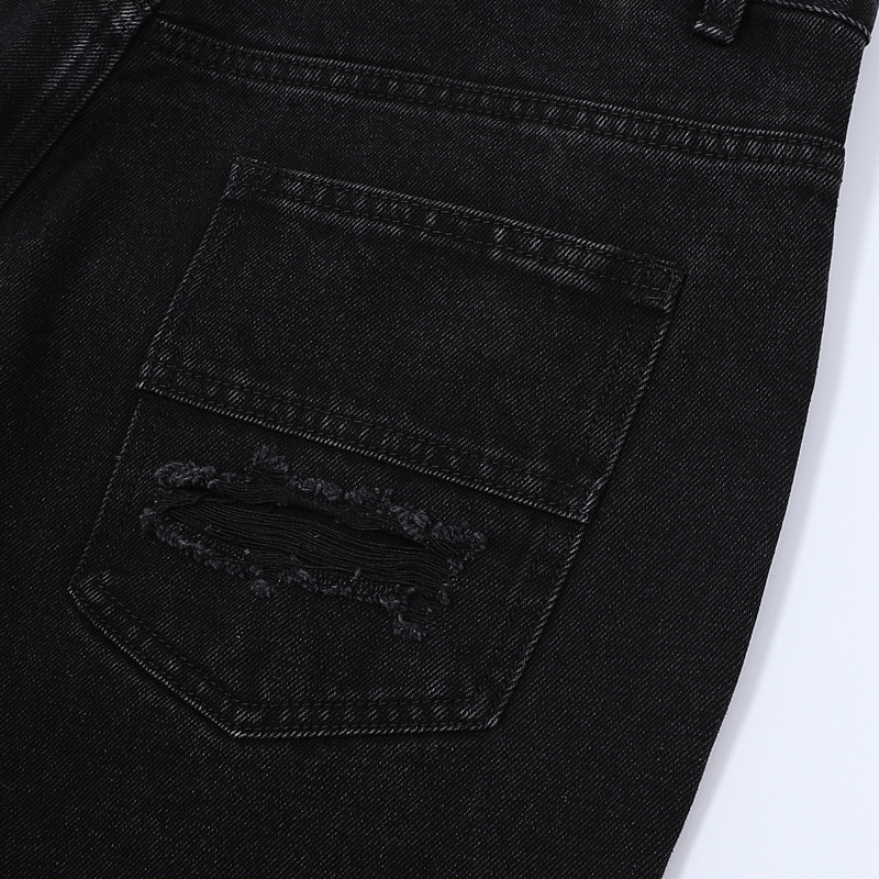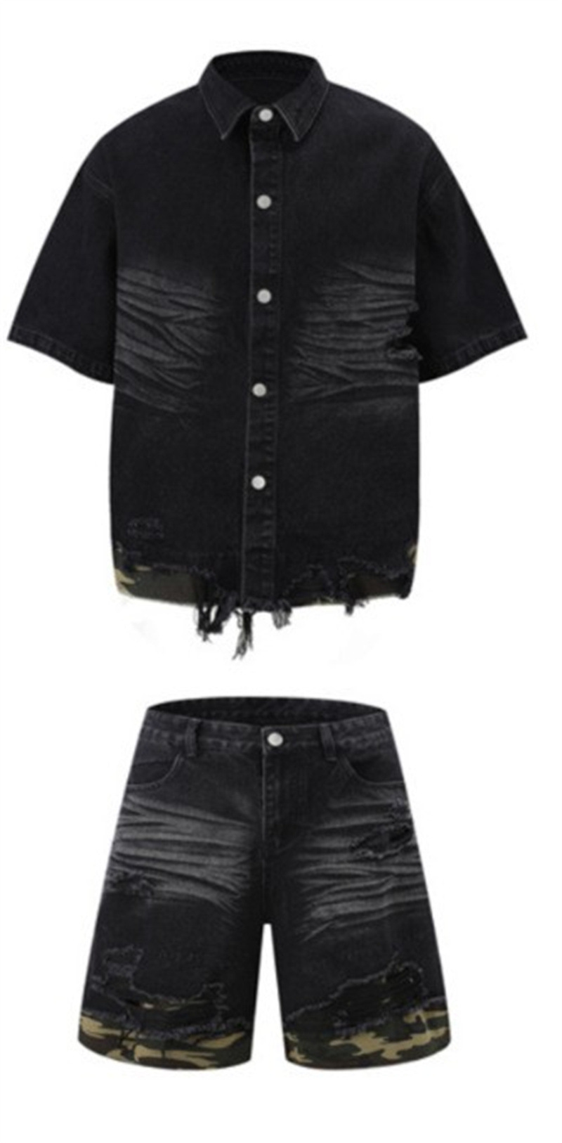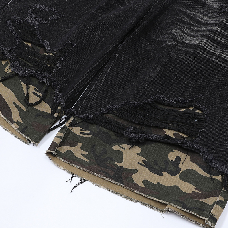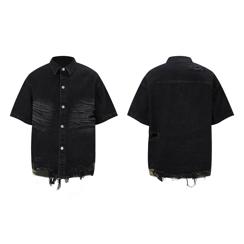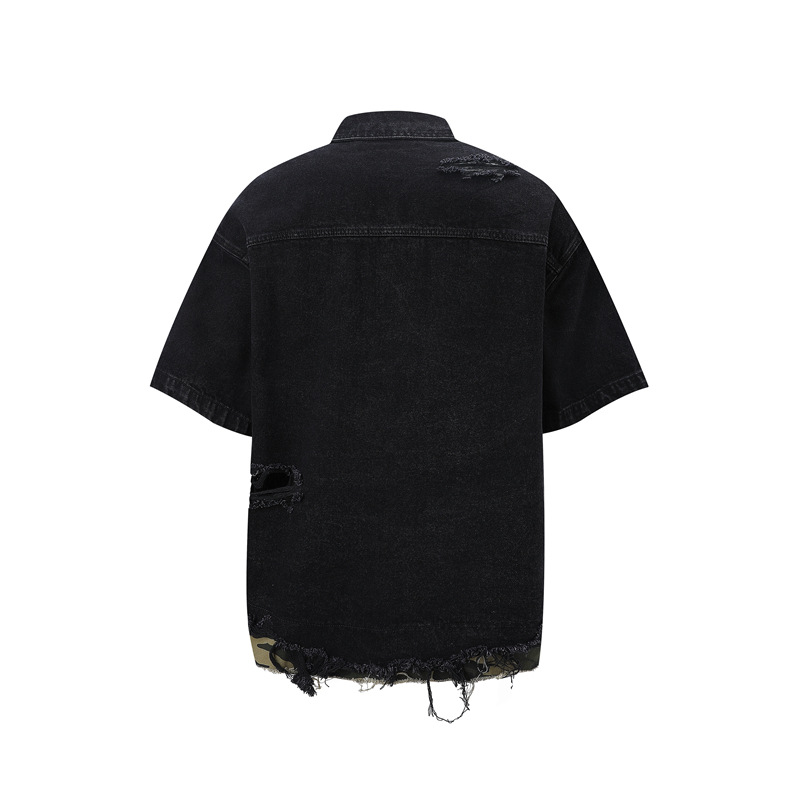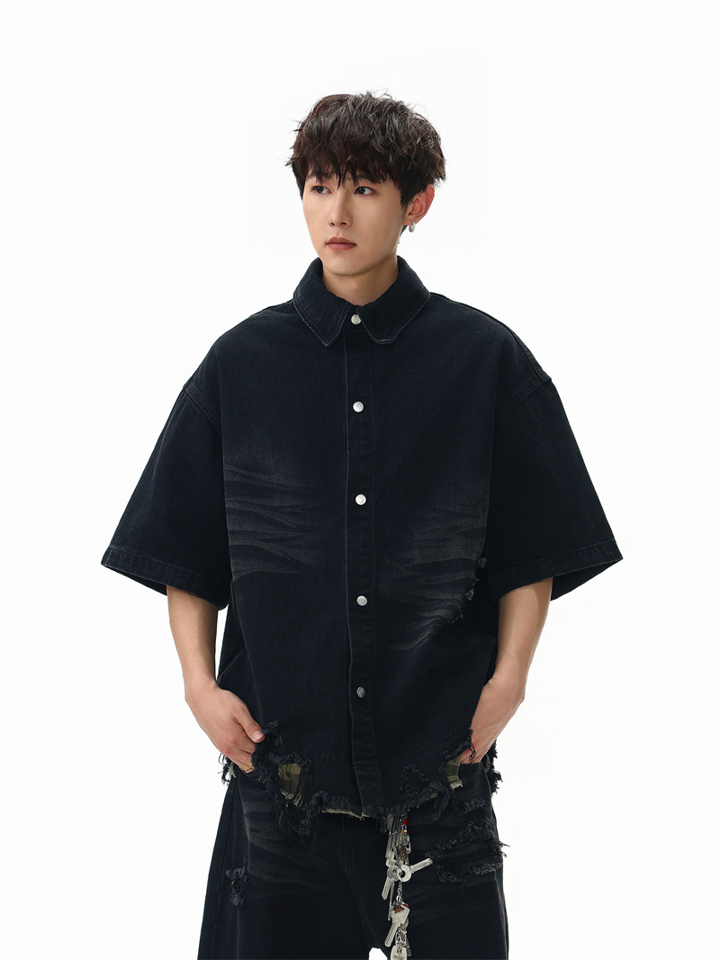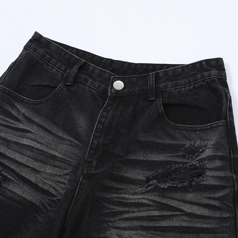 트렌디 한 브랜드 컷 엣지 스티칭 레오파드 무늬 데님 반팔 남성 캐주얼 5 점 데님 옷 느슨한 반소매 일본 데님 반바지