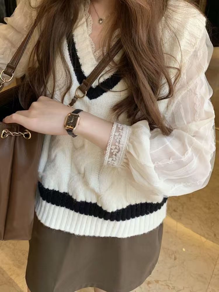 달콤한 V 넥 레이스 퍼프 소매 셔츠 여성용 하이 엔드 얇은 쉬폰 긴 소매 탑